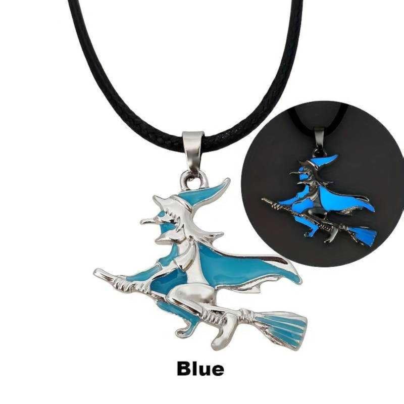 This stylish necklace features a Queen Witch flying on a broom stick, perfect for Halloween. The pendant is eye-catching and is paired with a synthetic leather necklace.