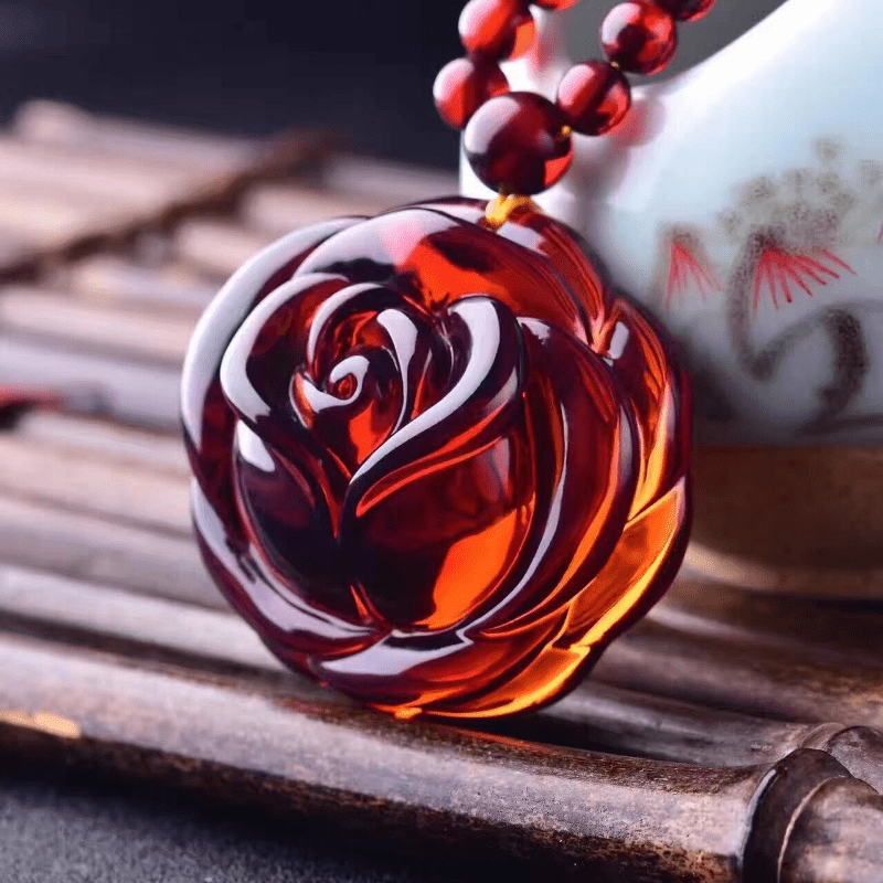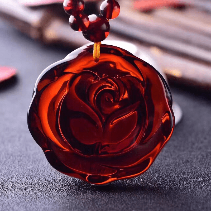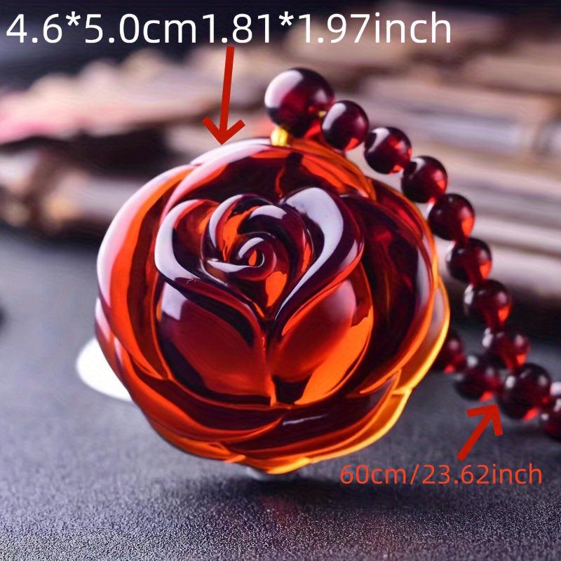 Enhance your bohemian fashion with this versatile blood amber rose pendant necklace. Hand polished for a unique look, this piece can be worn as a bracelet or sweater chain.