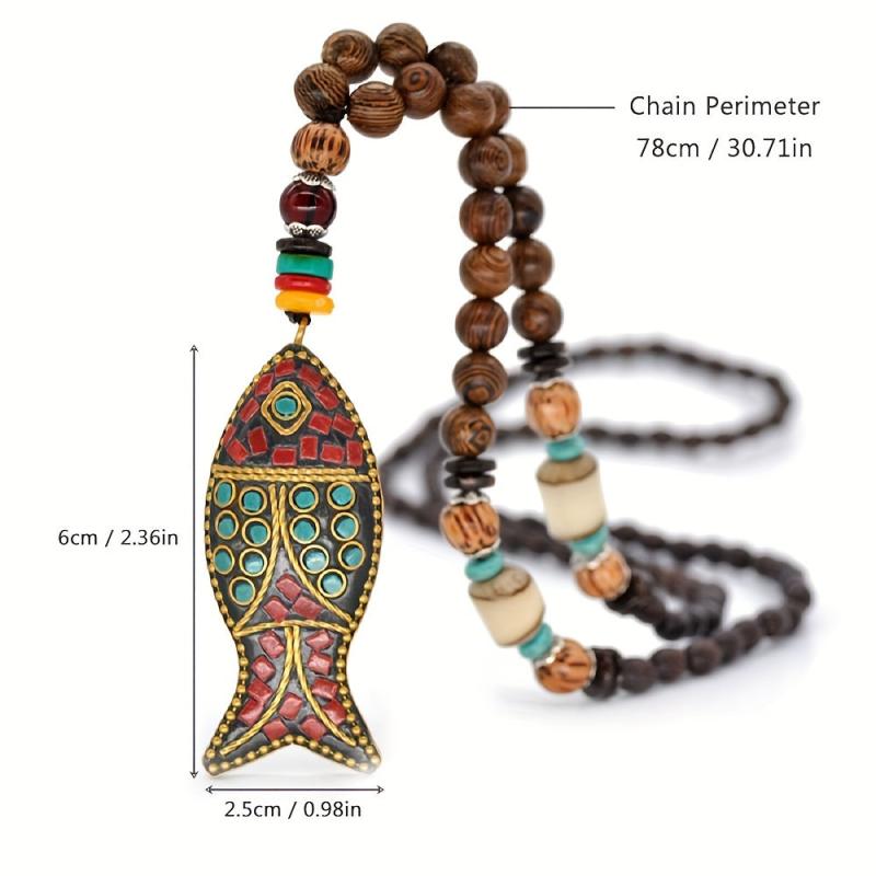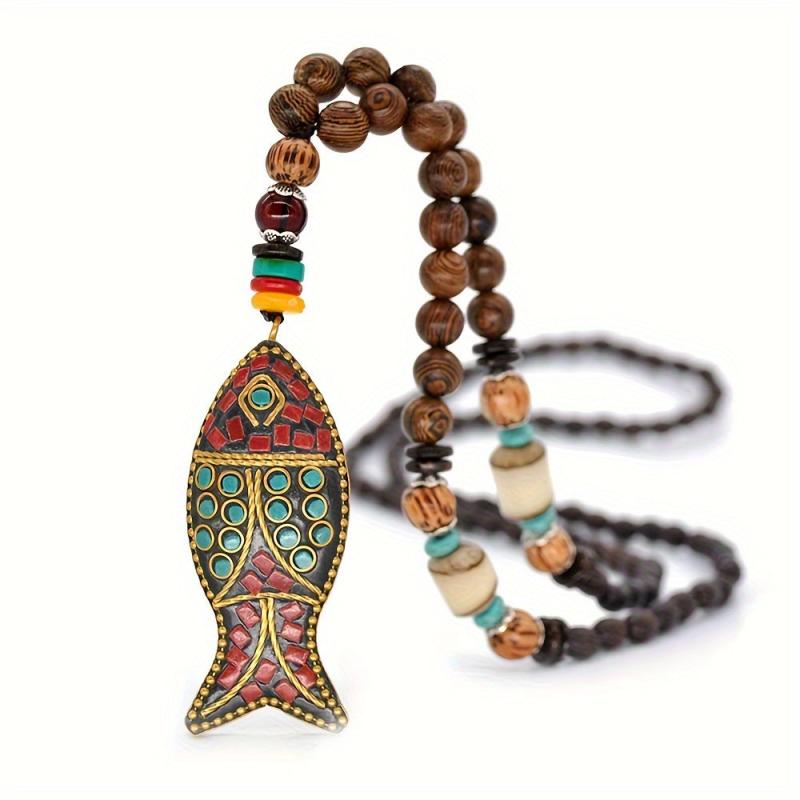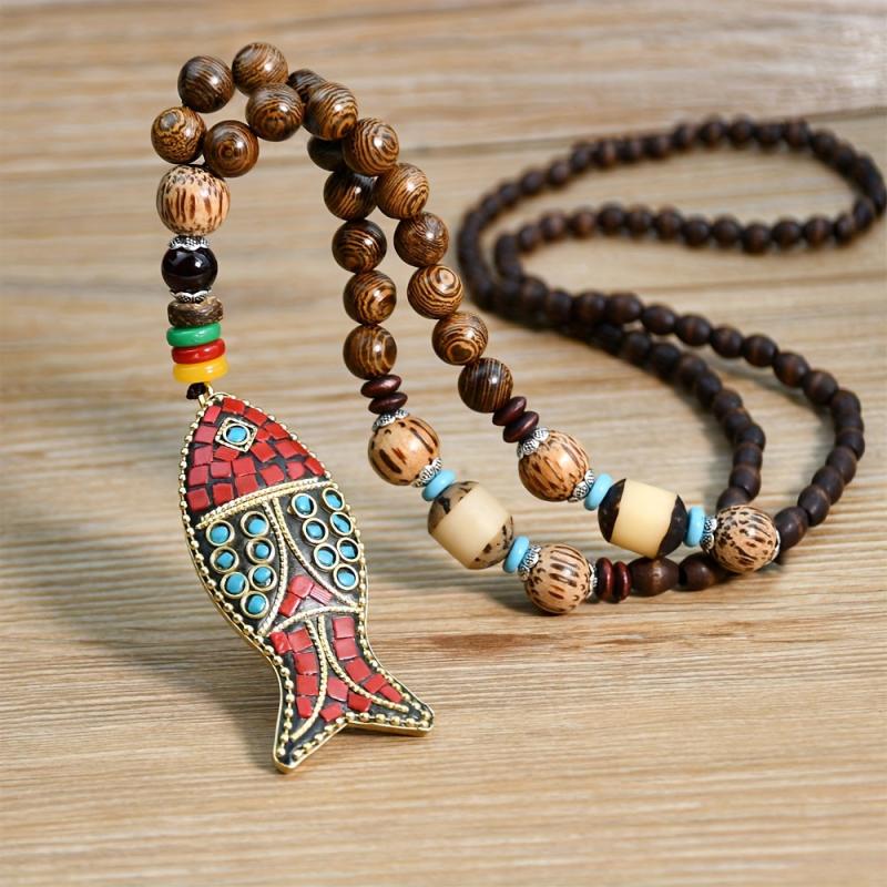 Elevate your daily vacation look with this Bohemia Fish Pendant Necklace featuring wooden beads. Add a touch of charm and elegance to your outfit.