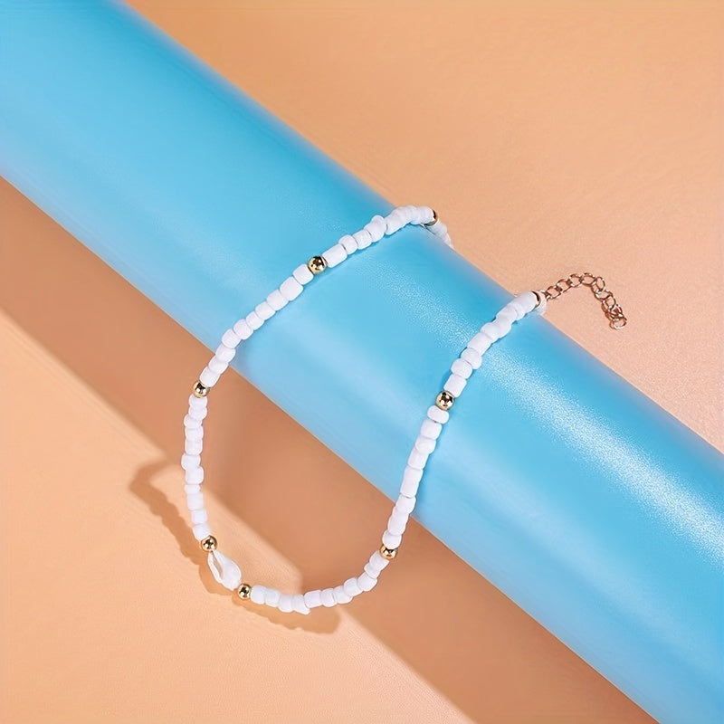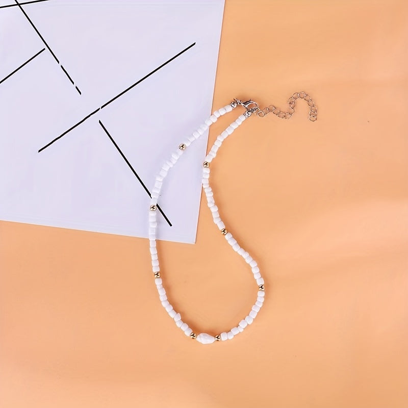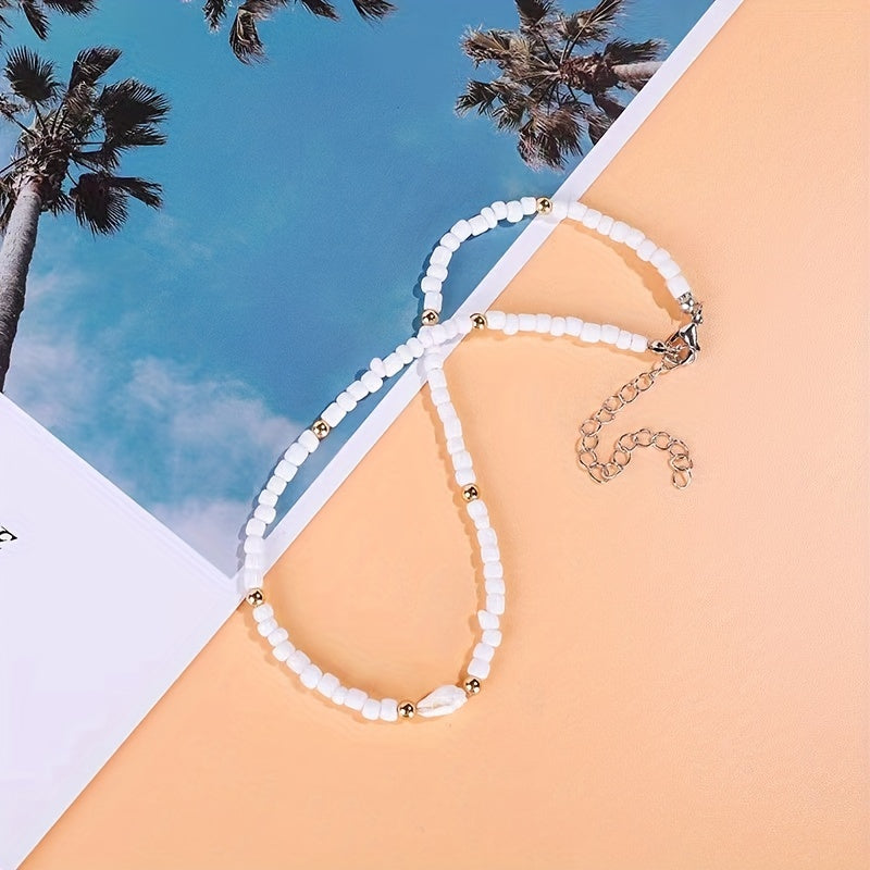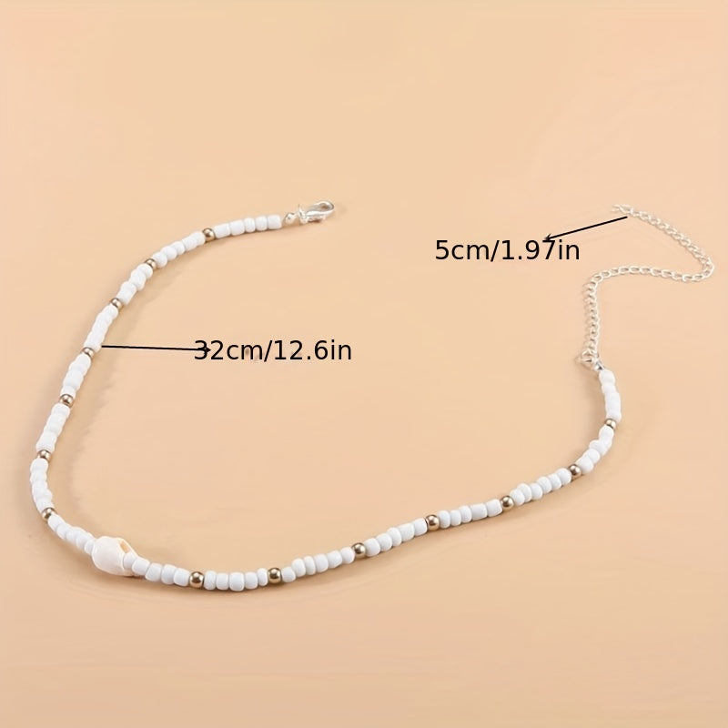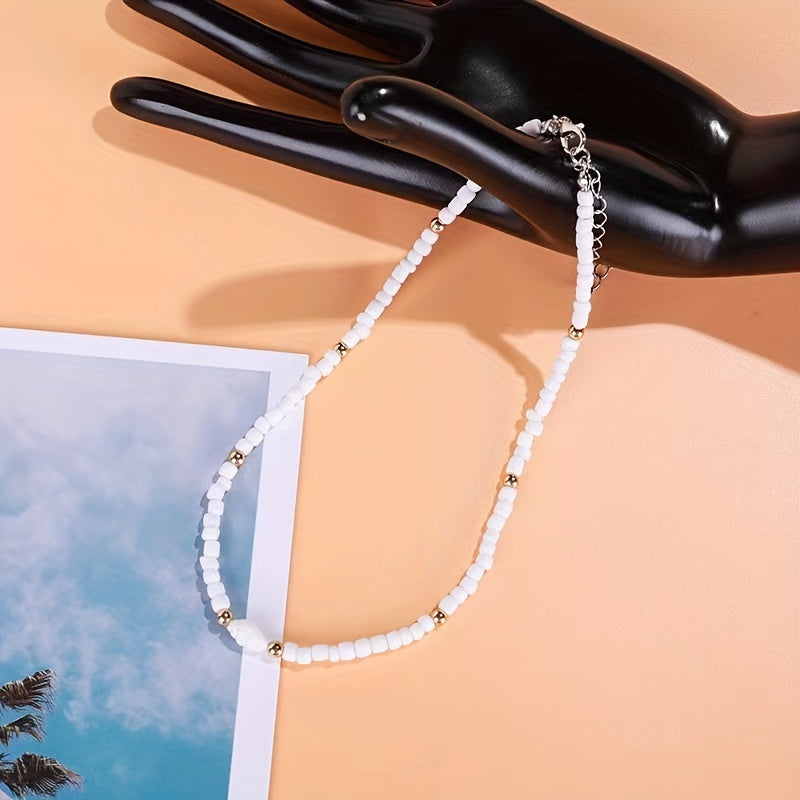 Elevate your summer beach party look with this stylish Bohemian short necklace choker adorned with rice beads in ocean vacation style.