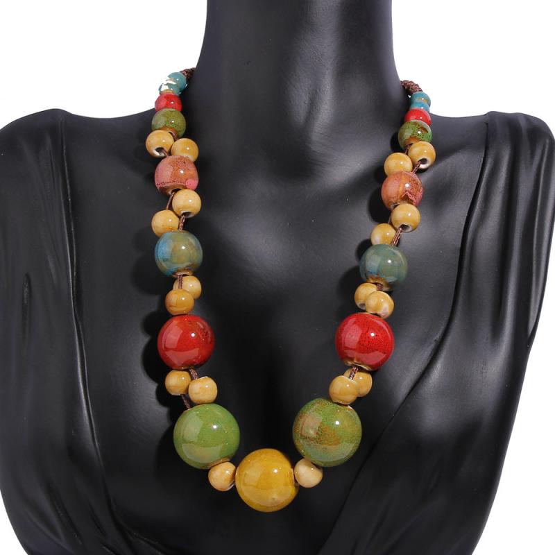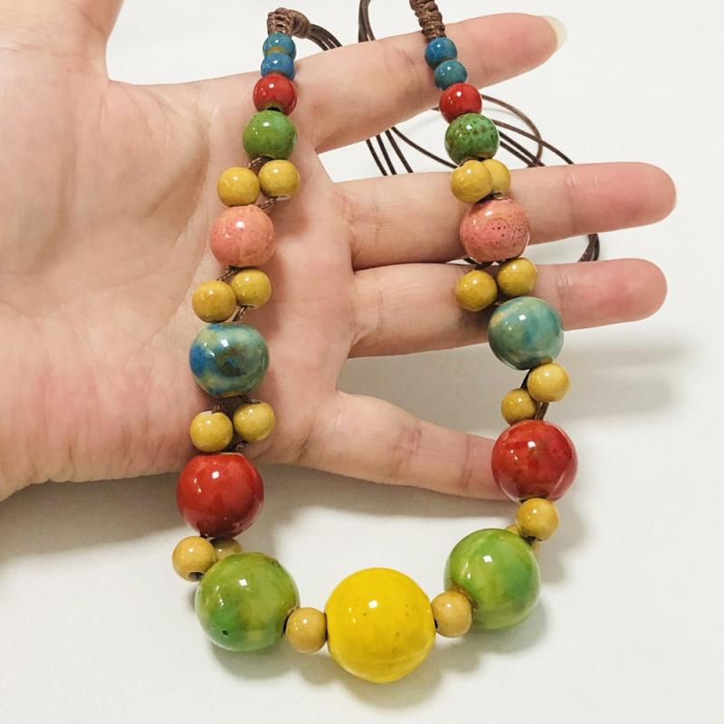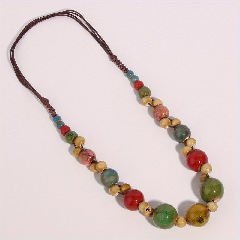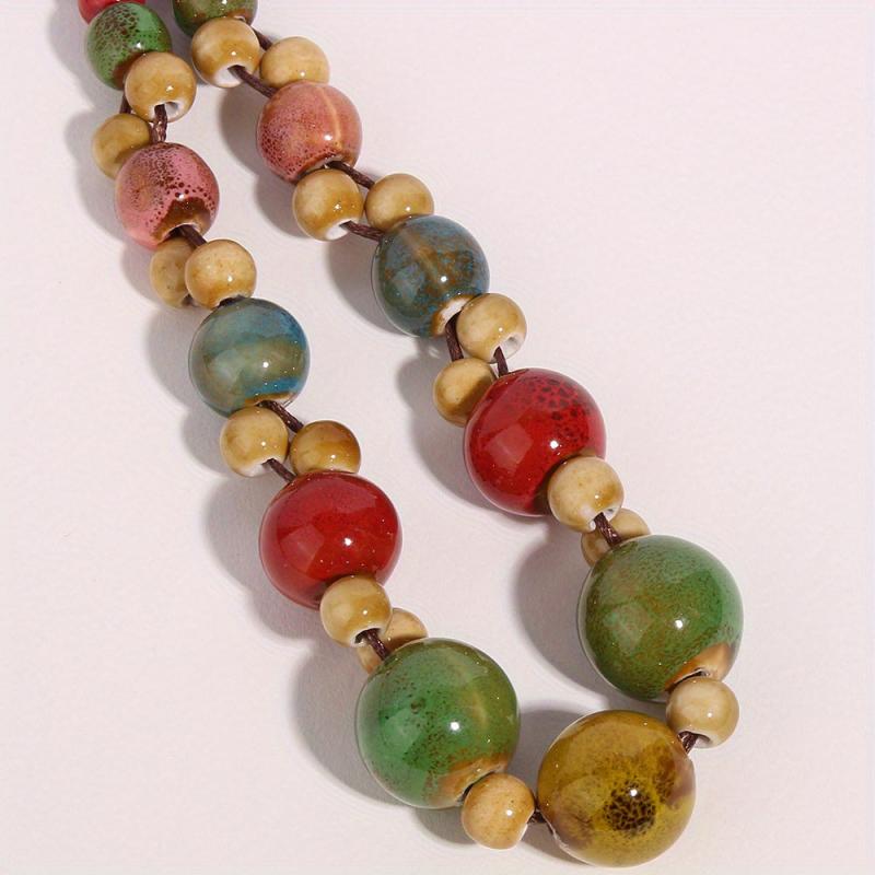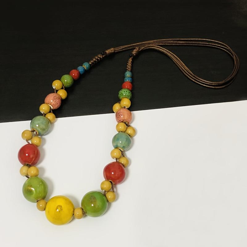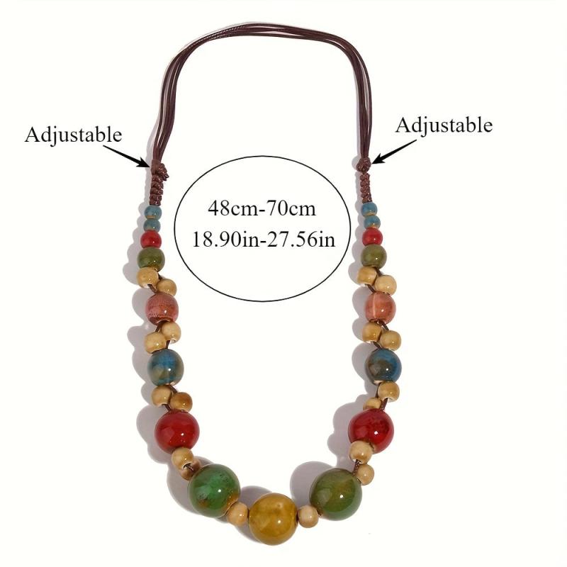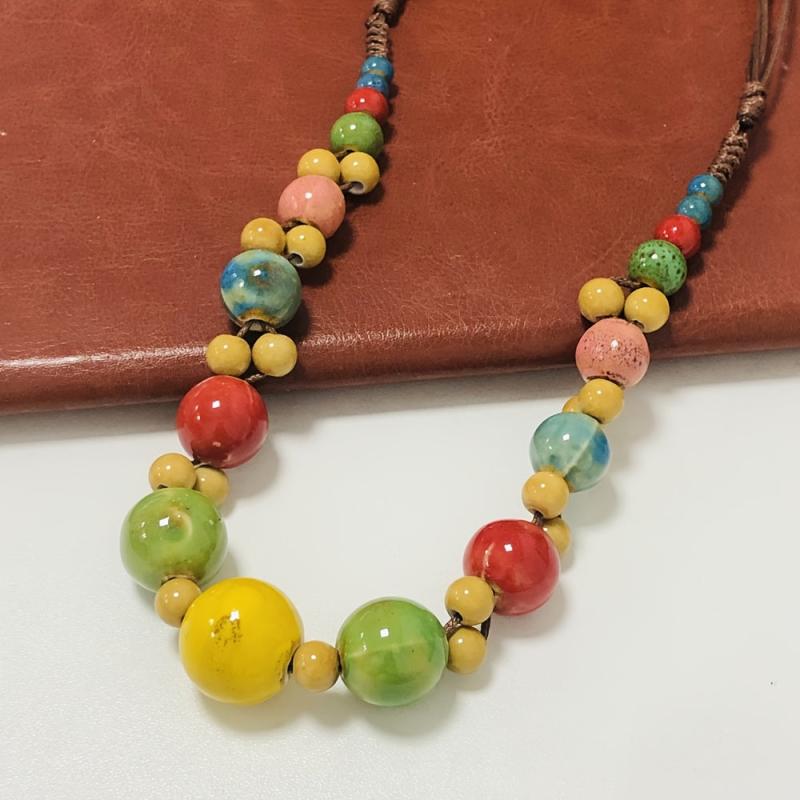 Handwoven necklace featuring vibrant multicolor porcelain beads on durable synthetic fiber rope. Add a touch of bohemian style to your outfit!