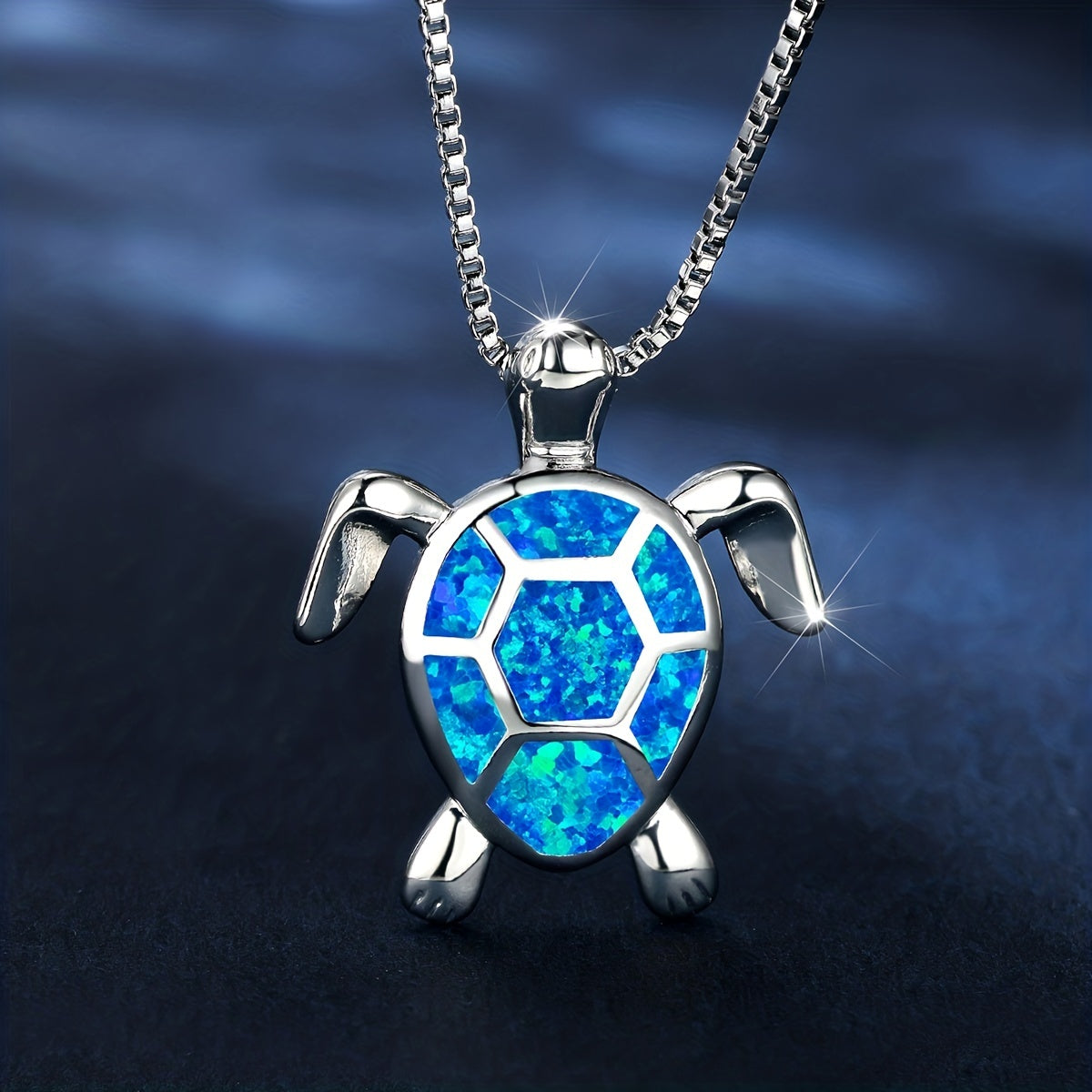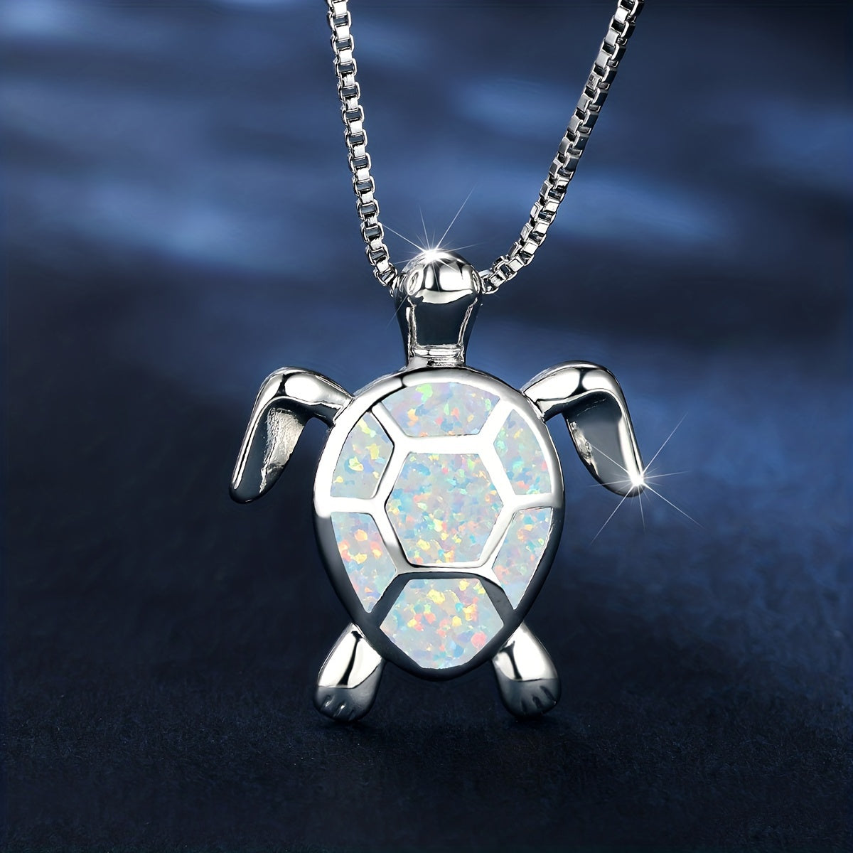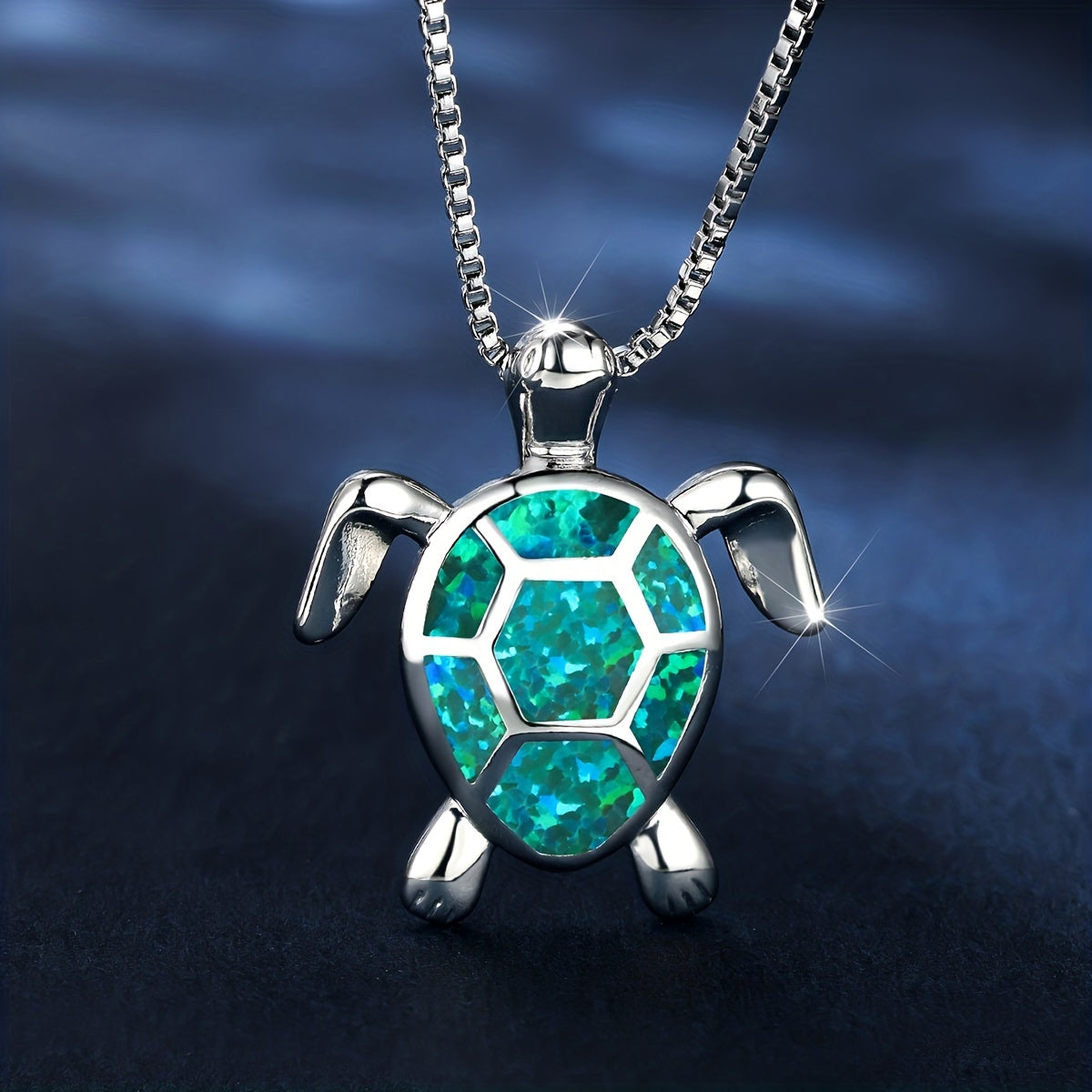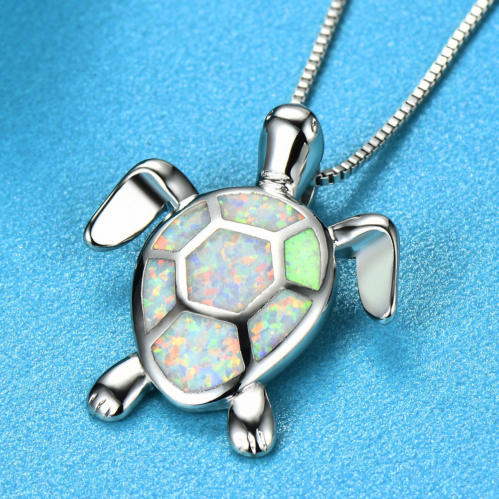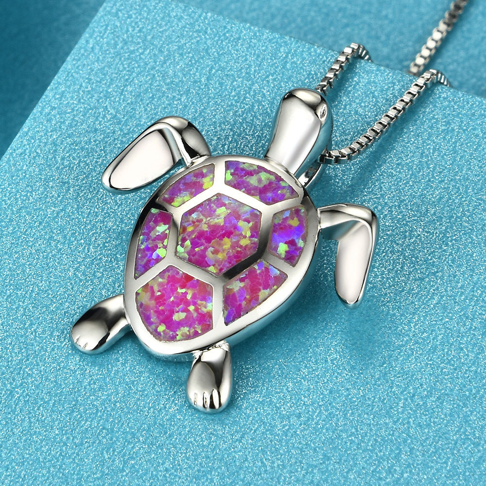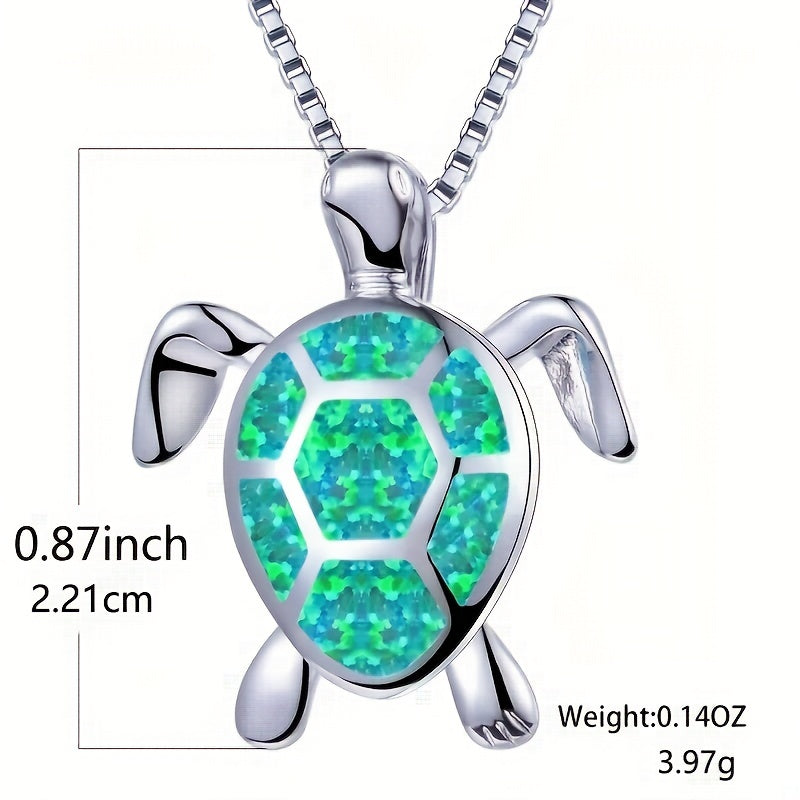 Enhance your style with this stunning Bohemian Fire Opal Necklace. The necklace features a silver chain with a green fire opal pendant and large tortoise pendants, perfect for adding a touch of elegance to any outfit.