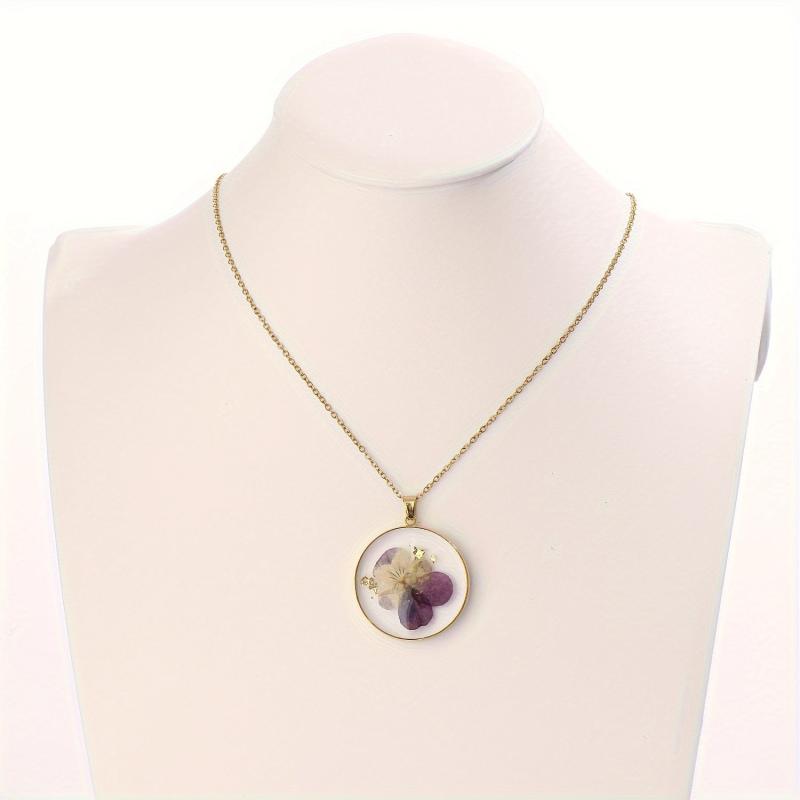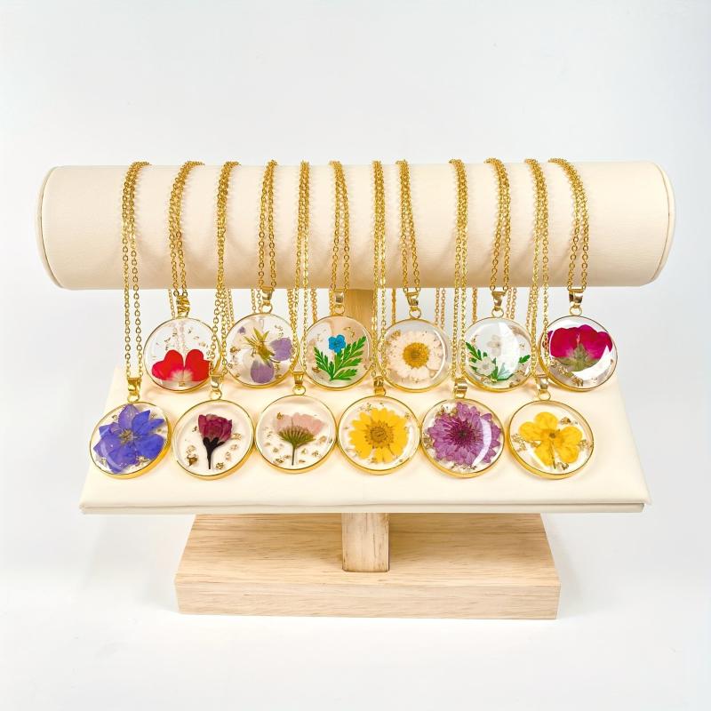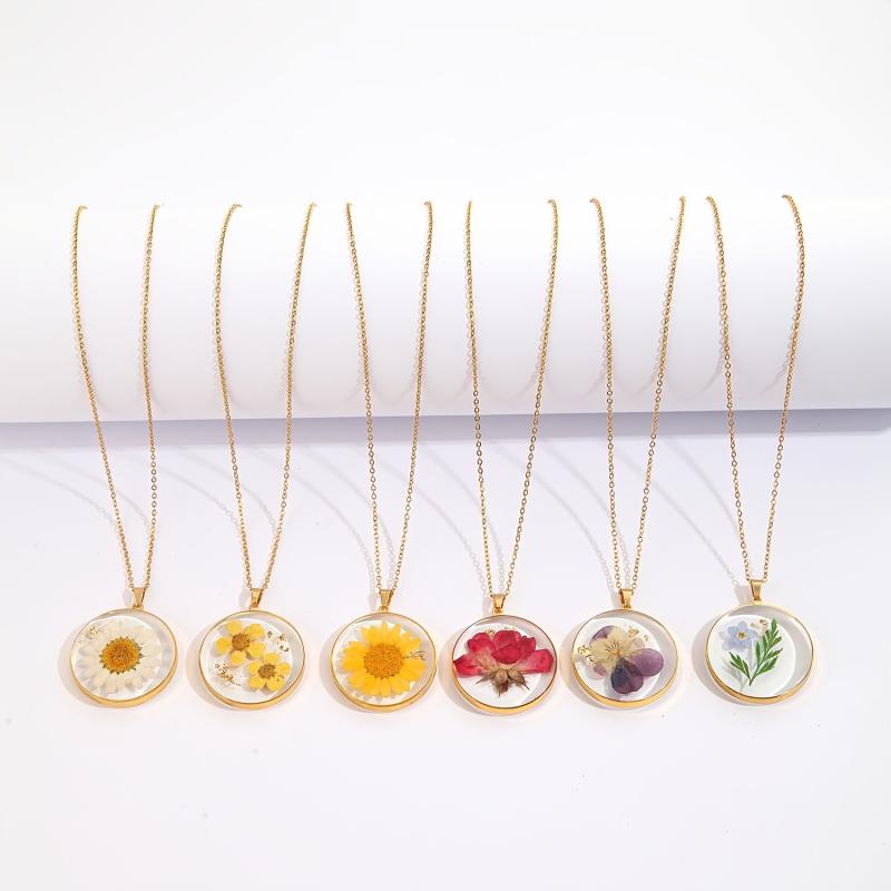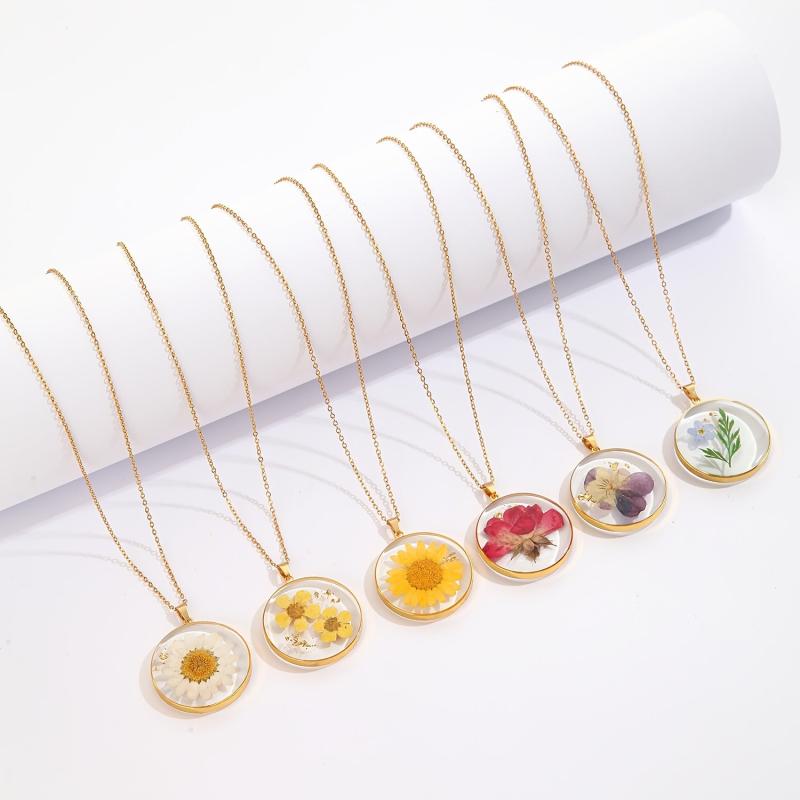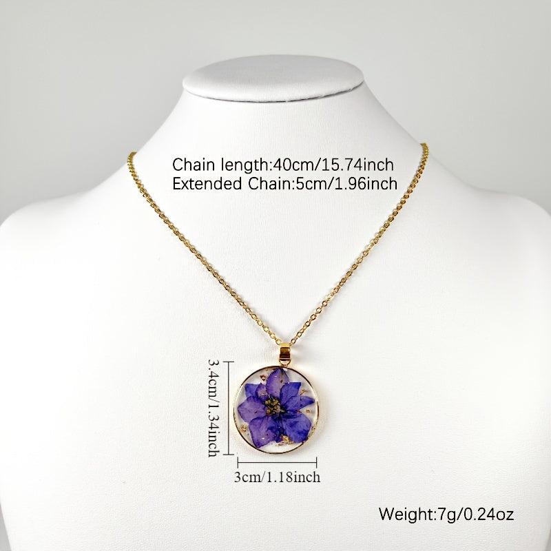 This bohemian necklace features 12 different floral designs made with resin dry flowers. The pendant is accented with a golden tone delicate chain, making it a perfect accessory for casual attire or as a thoughtful gift for women on birthdays and holidays.