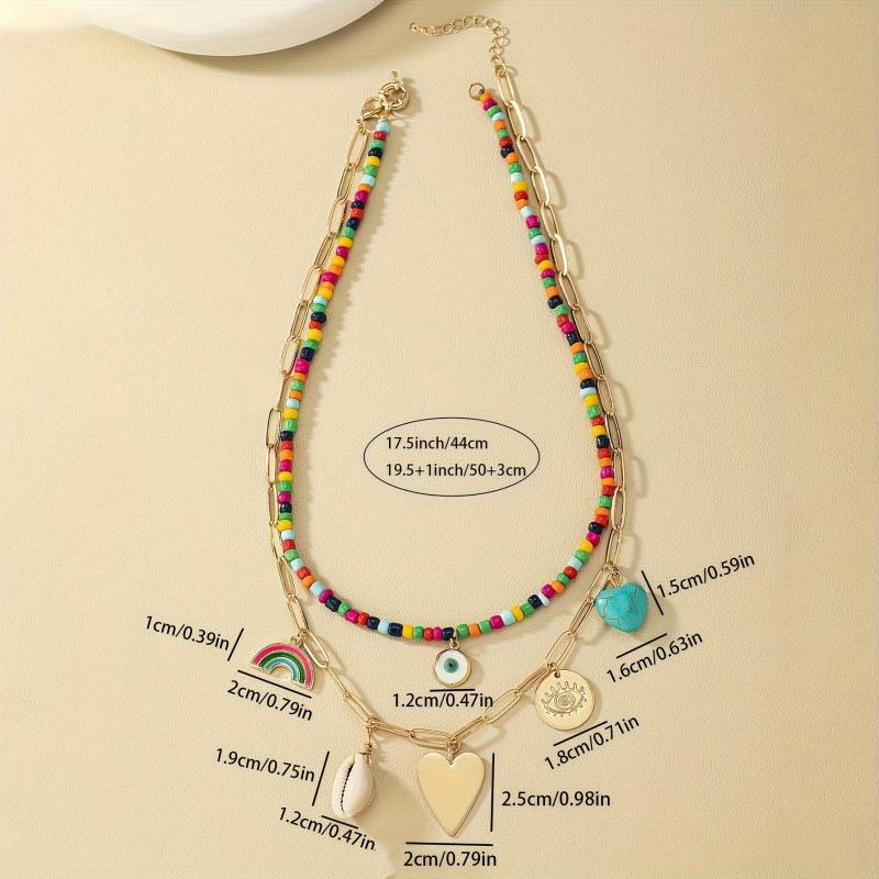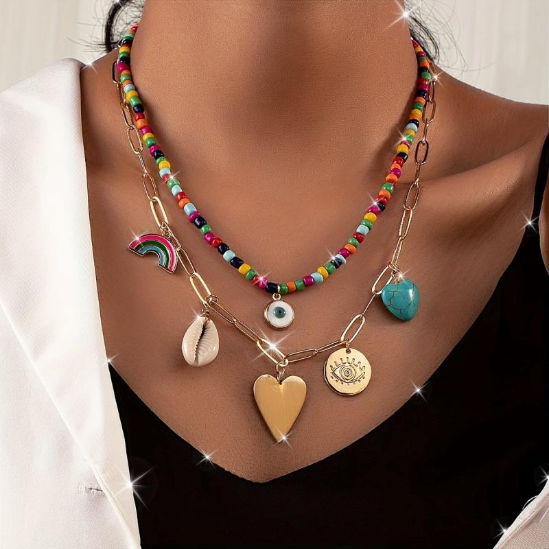 Elevate your style with this set of 2 bohemian necklaces featuring colorful stone and shell beads in a stunning rainbow pattern.