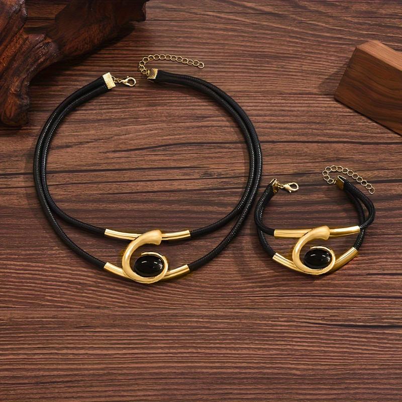 Elevate your style with this chic two-piece set featuring a bohemian double layer rope necklace and matching bracelet with oval rhinestone pendants.