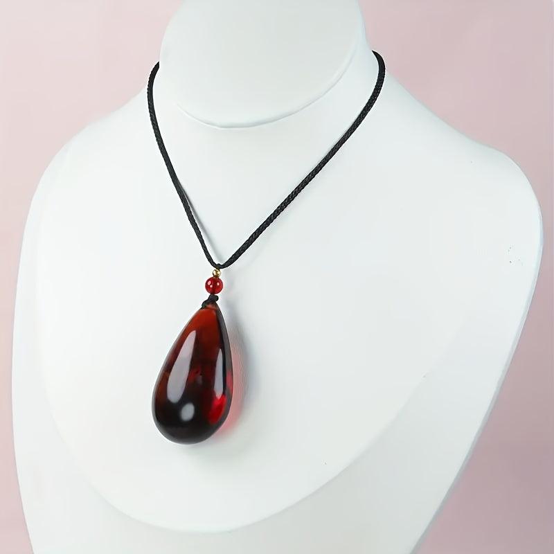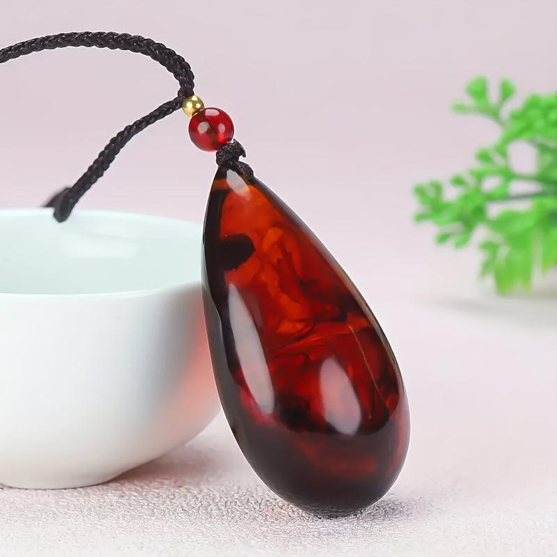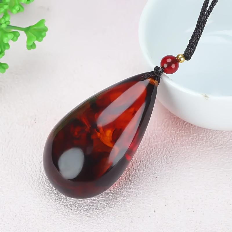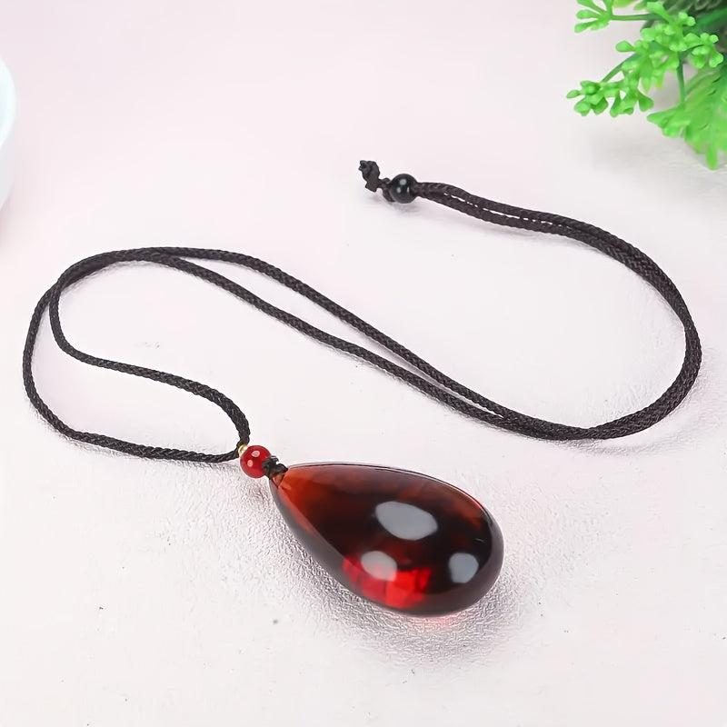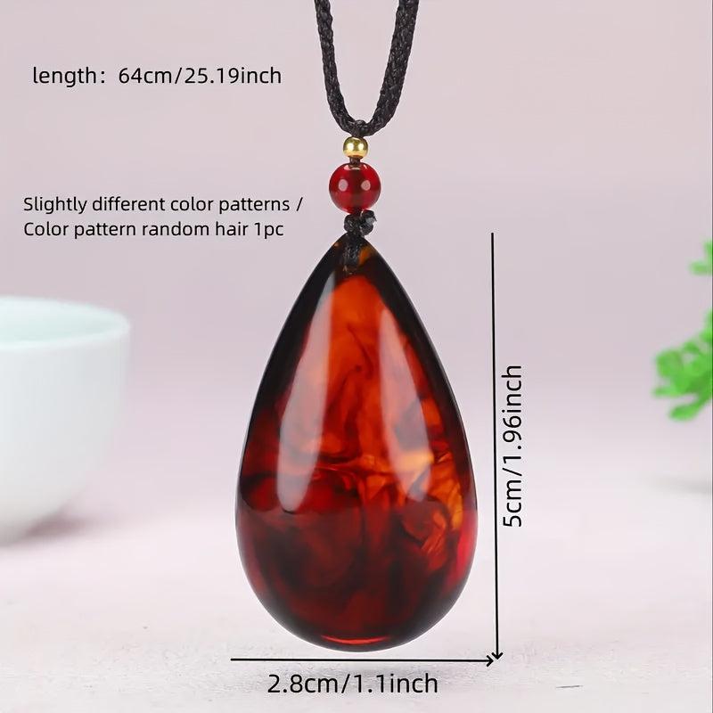 Unisex jewelry featuring natural amber resin teardrop pendant on cord with golden accents. Perfect for casual attire or as a holiday gift for men and women.
