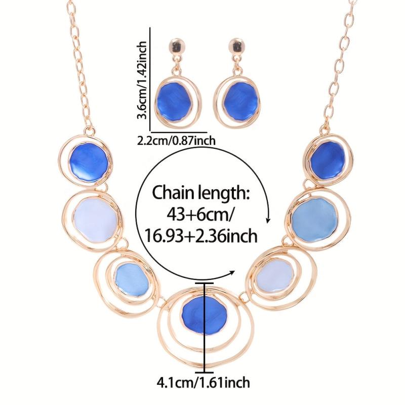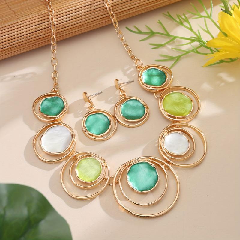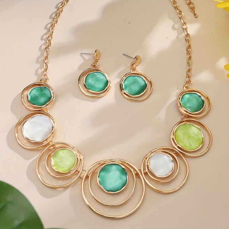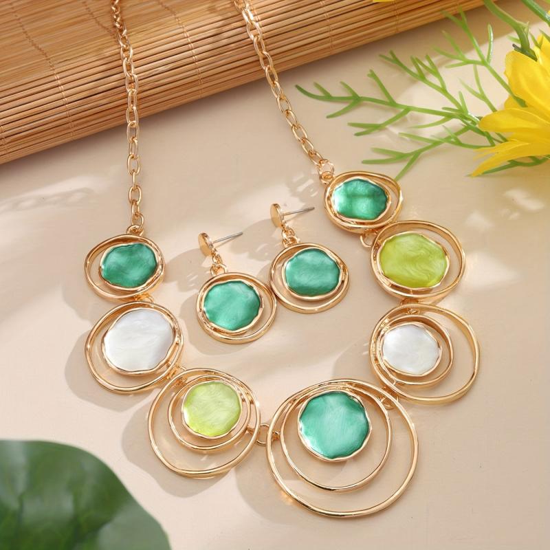 French retro European medieval romantic style jewelry set featuring two-layer round green earrings and necklace. Makes a light and elegant gift for someone special.