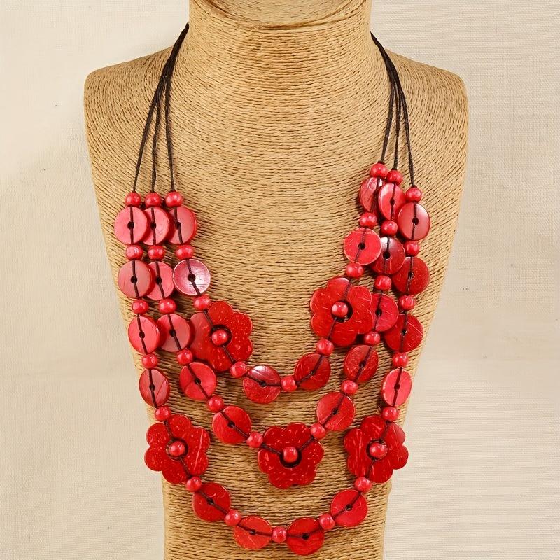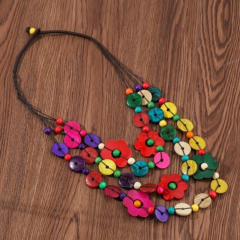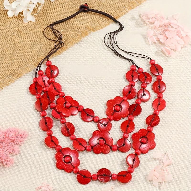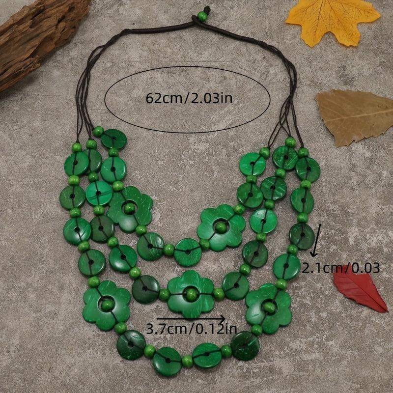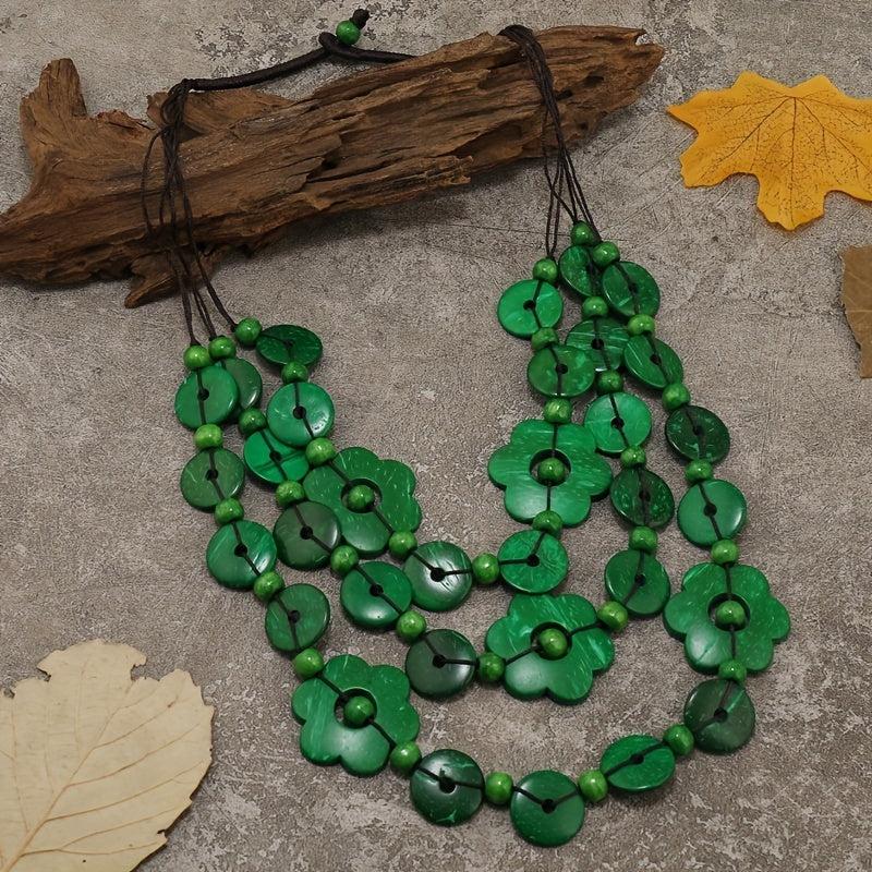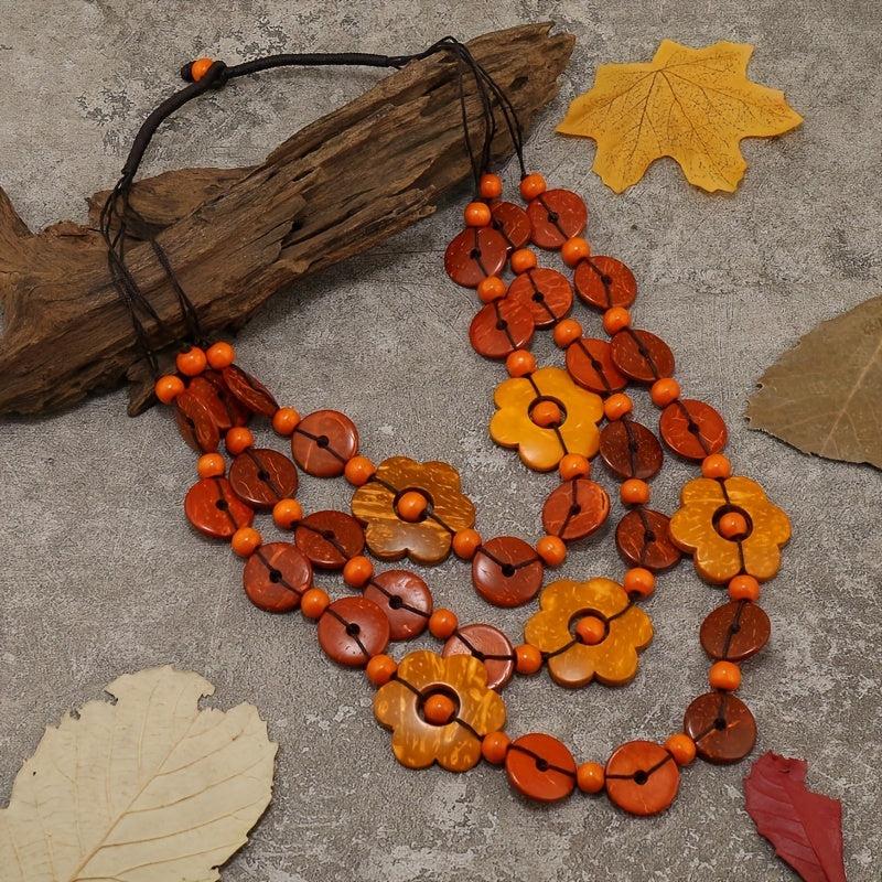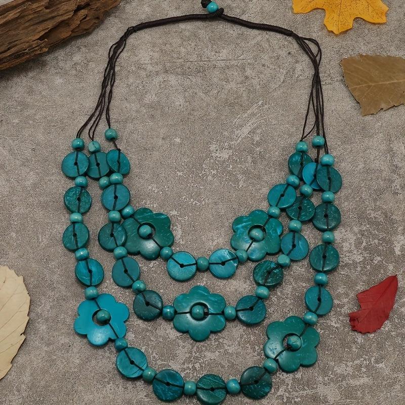 This multilayer necklace features a boho vintage design with geometric flower beads made from coconut shell and wood.
