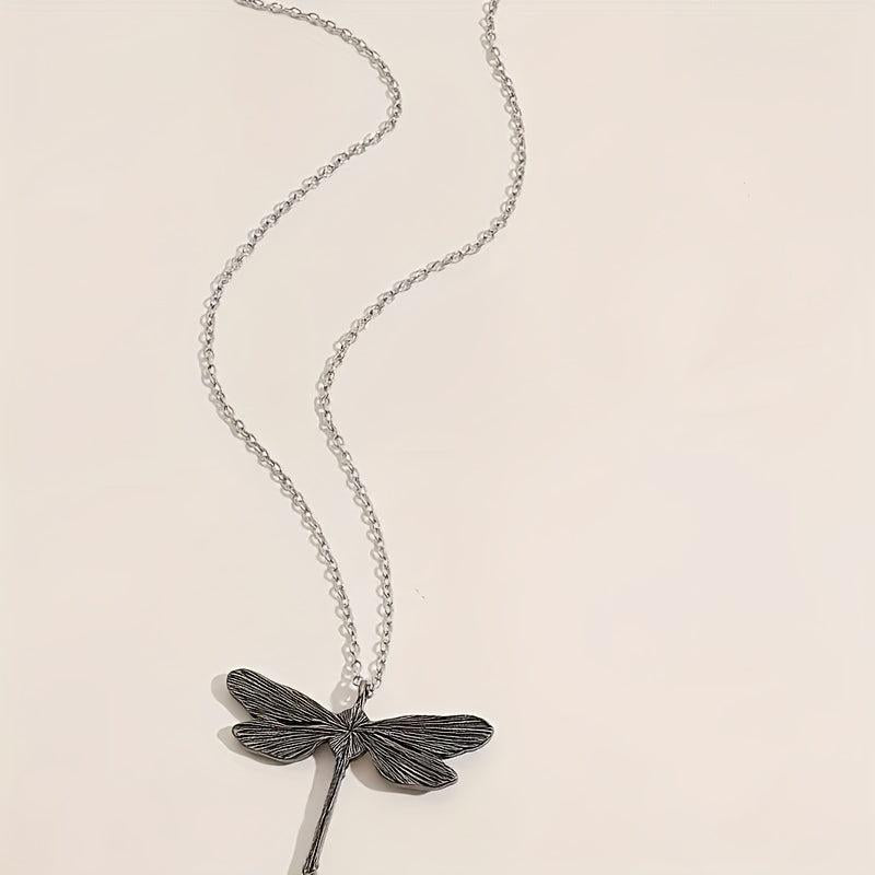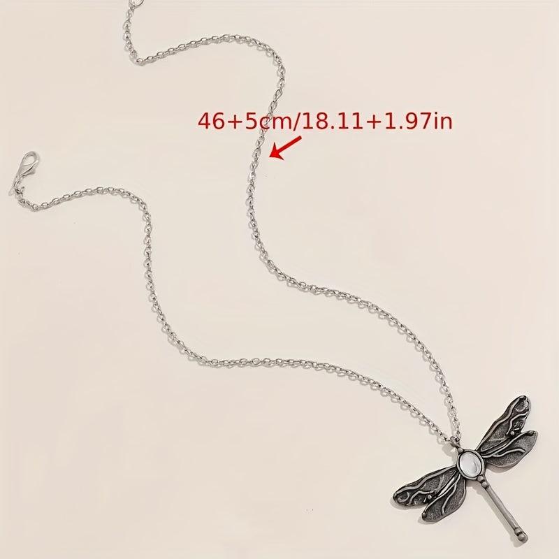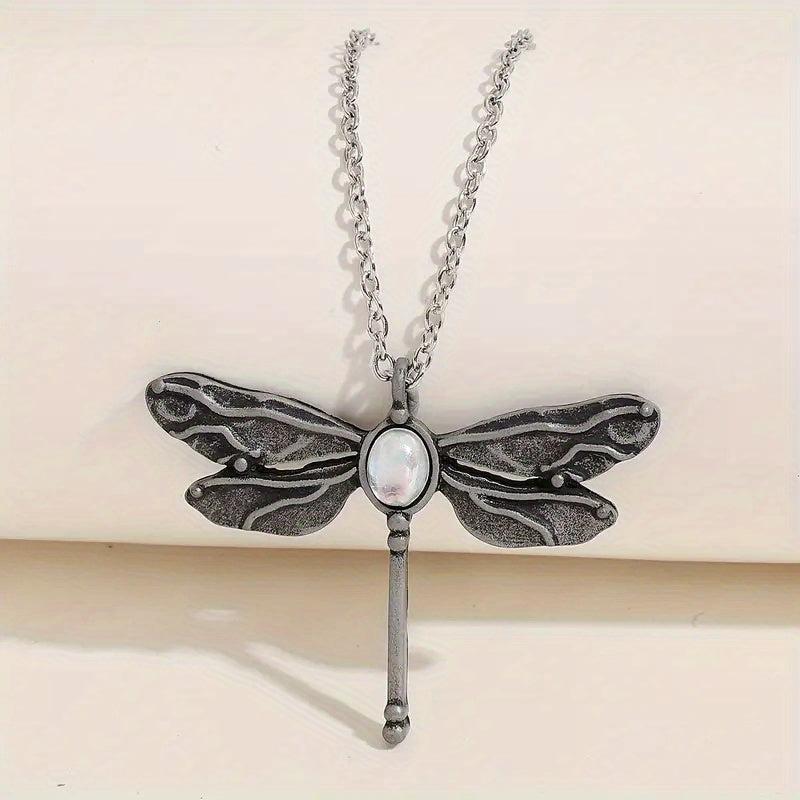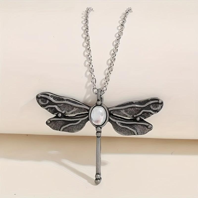 This silvery dragonfly pendant necklace features a synthetic faux gemstone inlay, making it an ideal gothic accessory. Perfect as a festive gift.