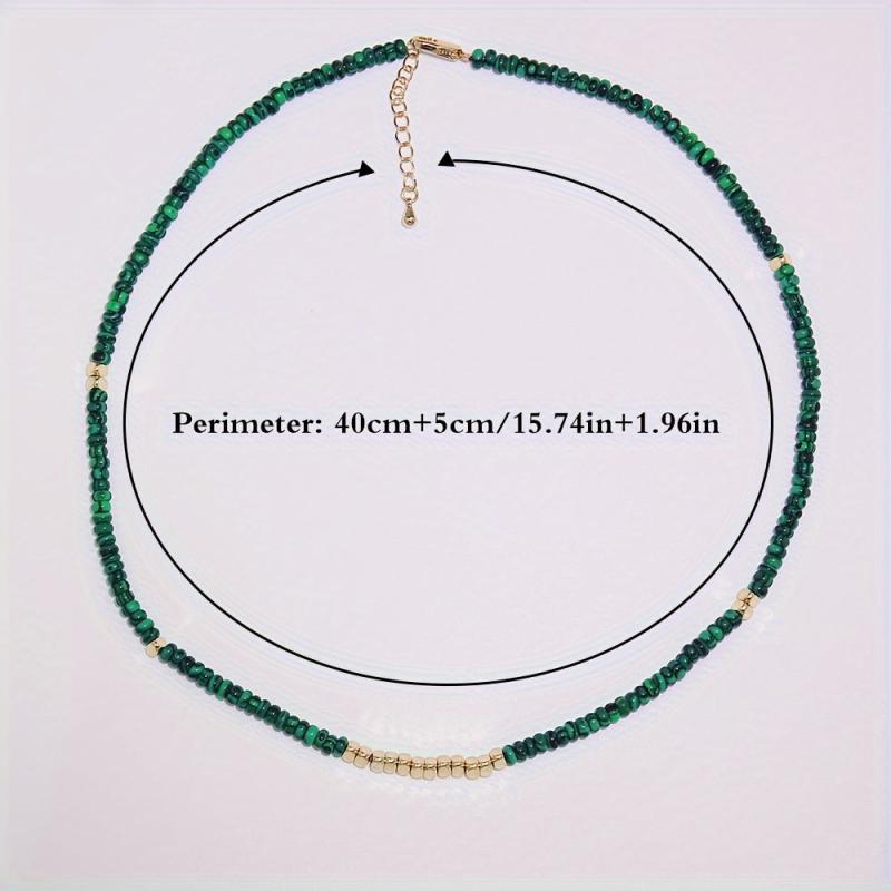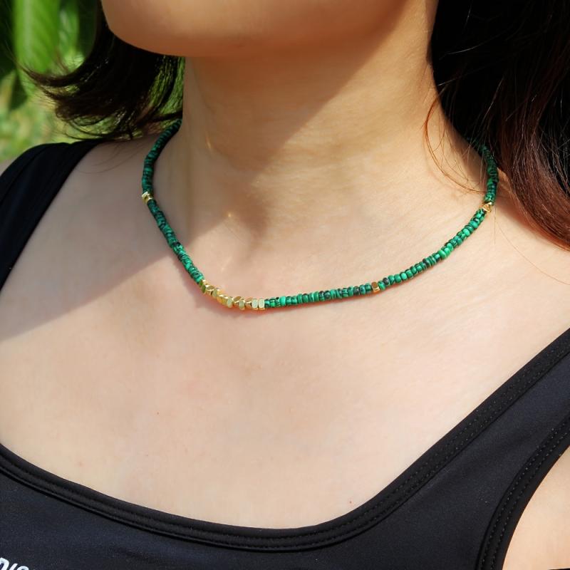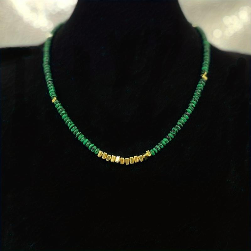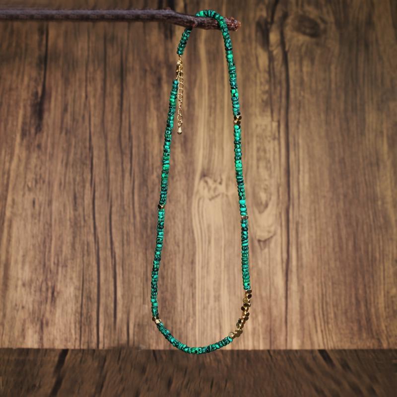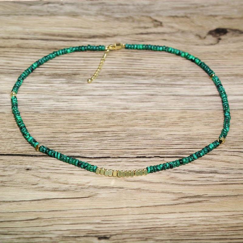 Elevate your style with this boho malachite necklace featuring natural stone beads and golden spacers. The deep green color adds a touch of sophistication to any outfit.