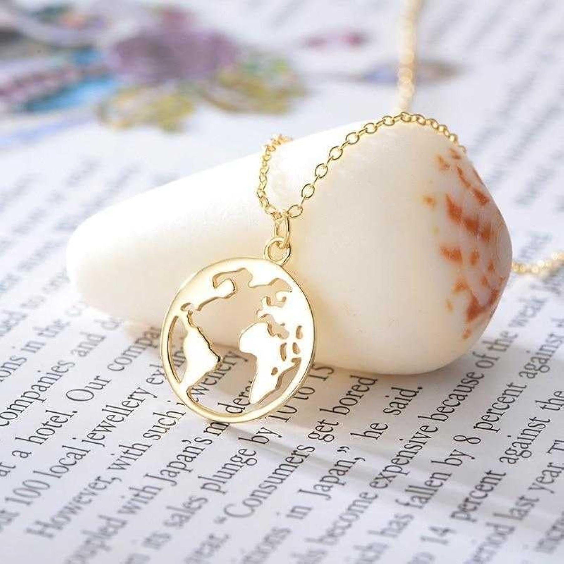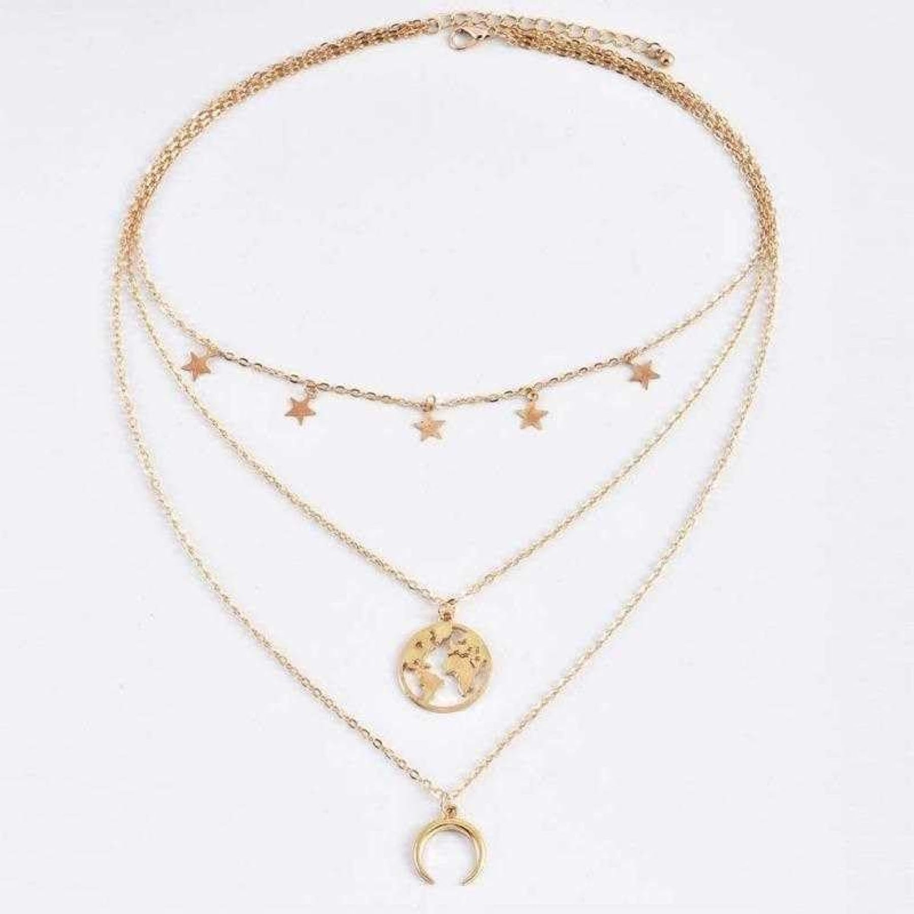 This three-strand beaded necklace features a quirky pendant retro coin necklace. The design includes a world map, moon, and star charms, creating a unique bohemian look.