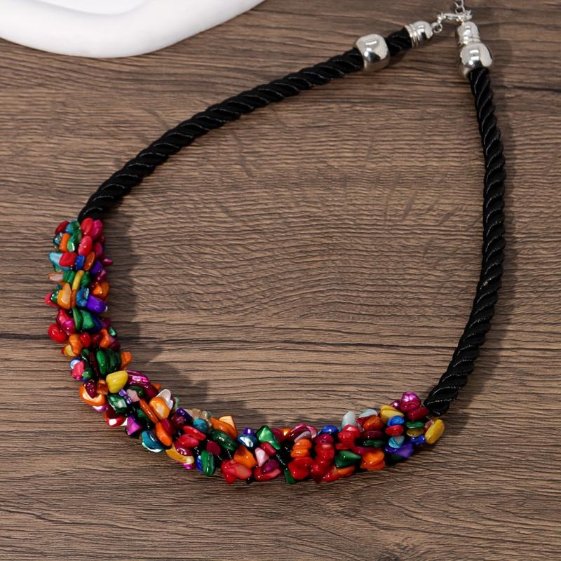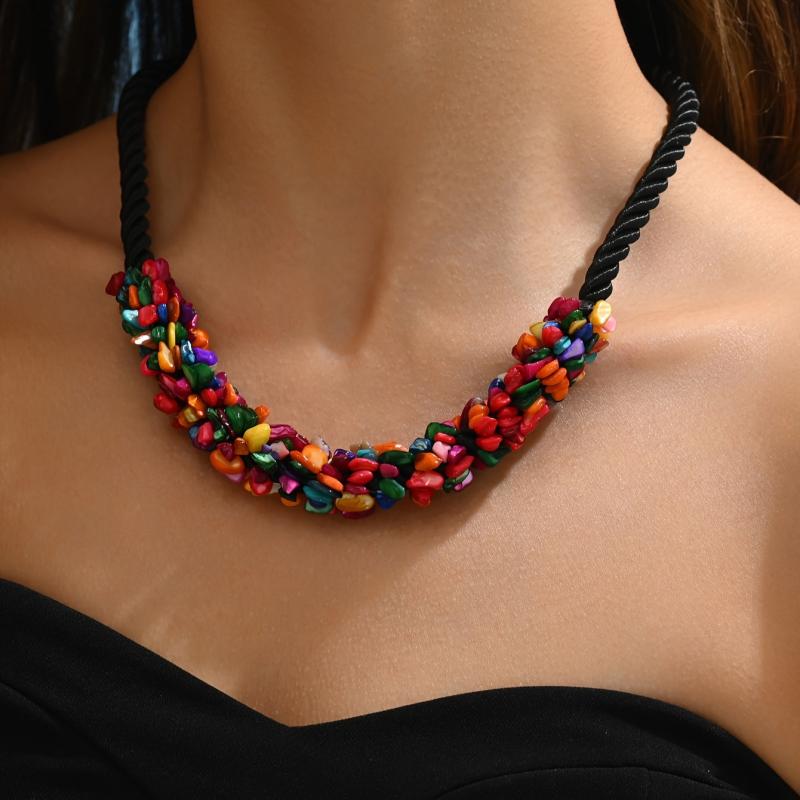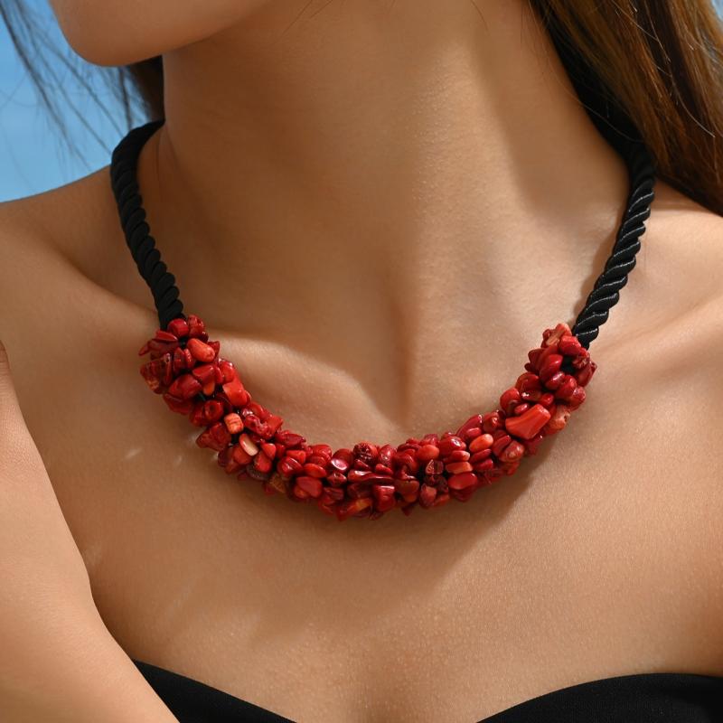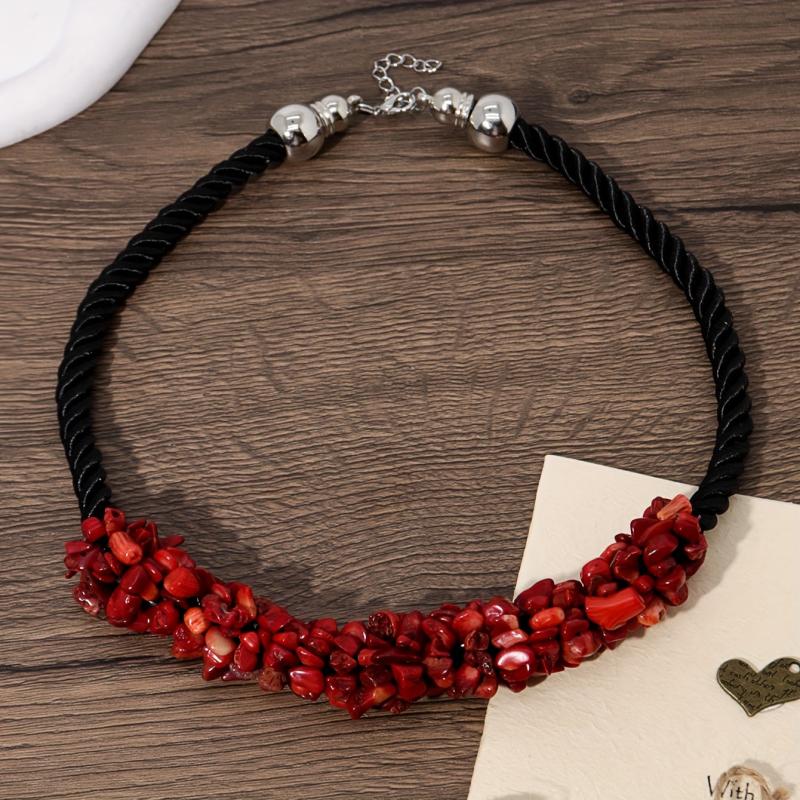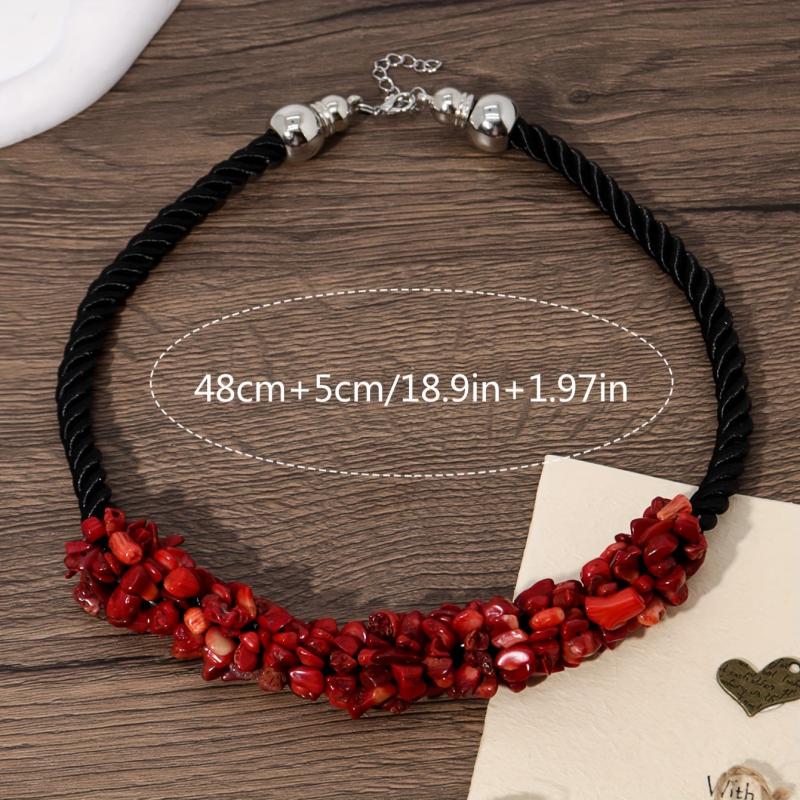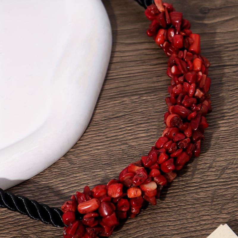 This bohemian necklace features a combination of irregular red stone and shell beads on a braided cord strand, perfect for vacation, parties, and year-round wear. It makes a unique artisan gift.