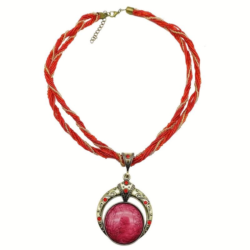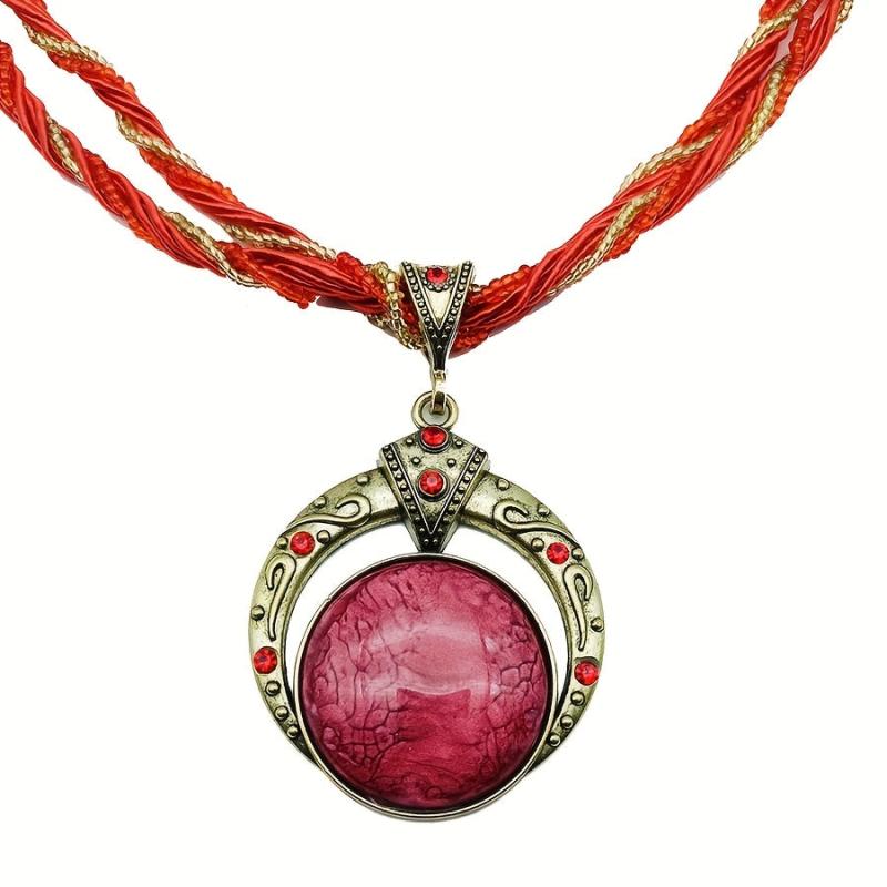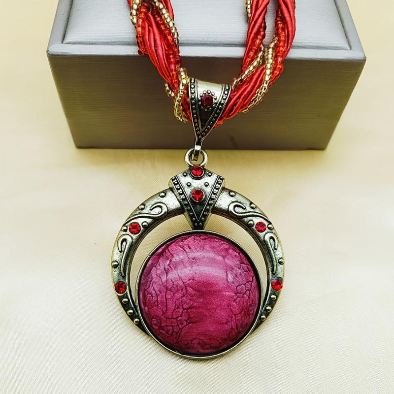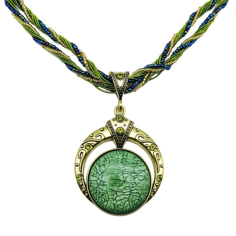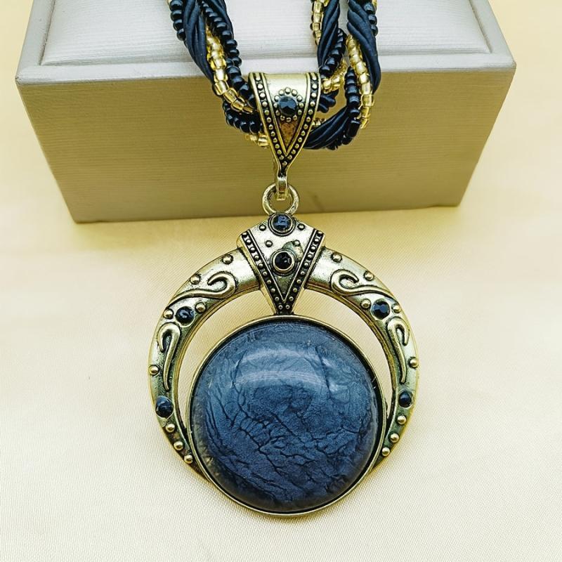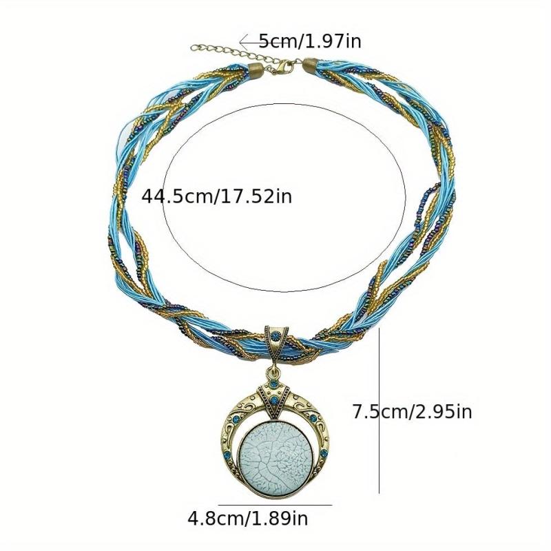 This vintage Bohemian pendant necklace features a multilayer bead chain with script and numeric symbols, adorned with a green gemstone and made of golden tone copper alloy. Perfect jewelry for a chic and stylish look.