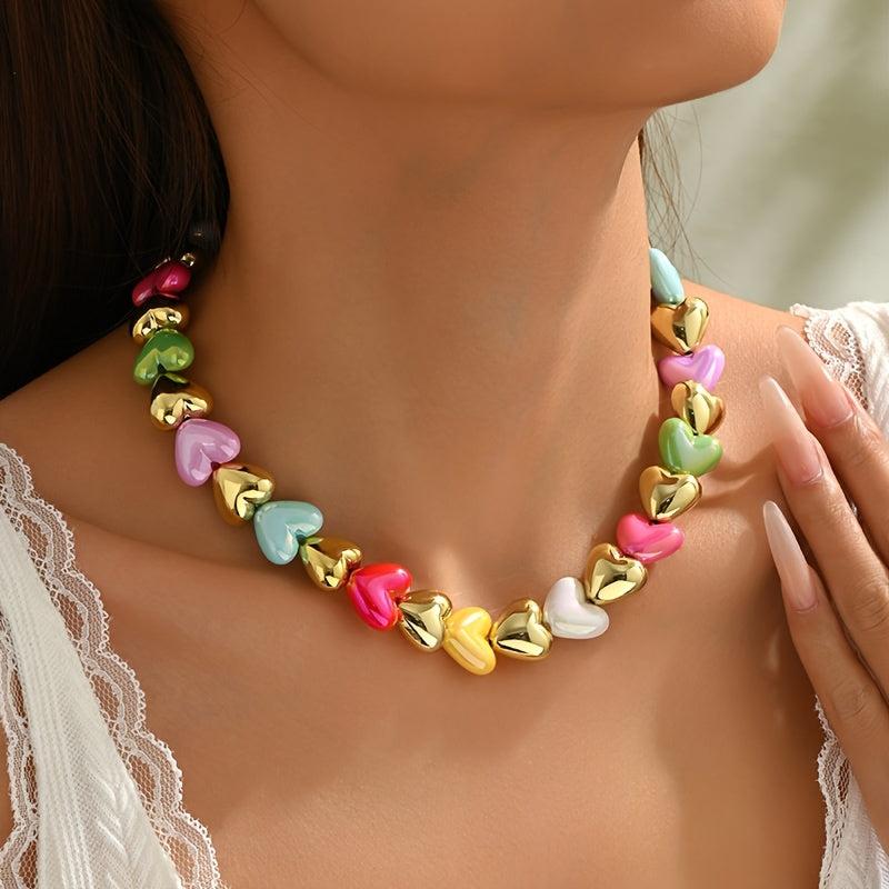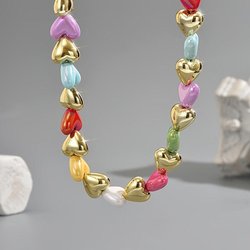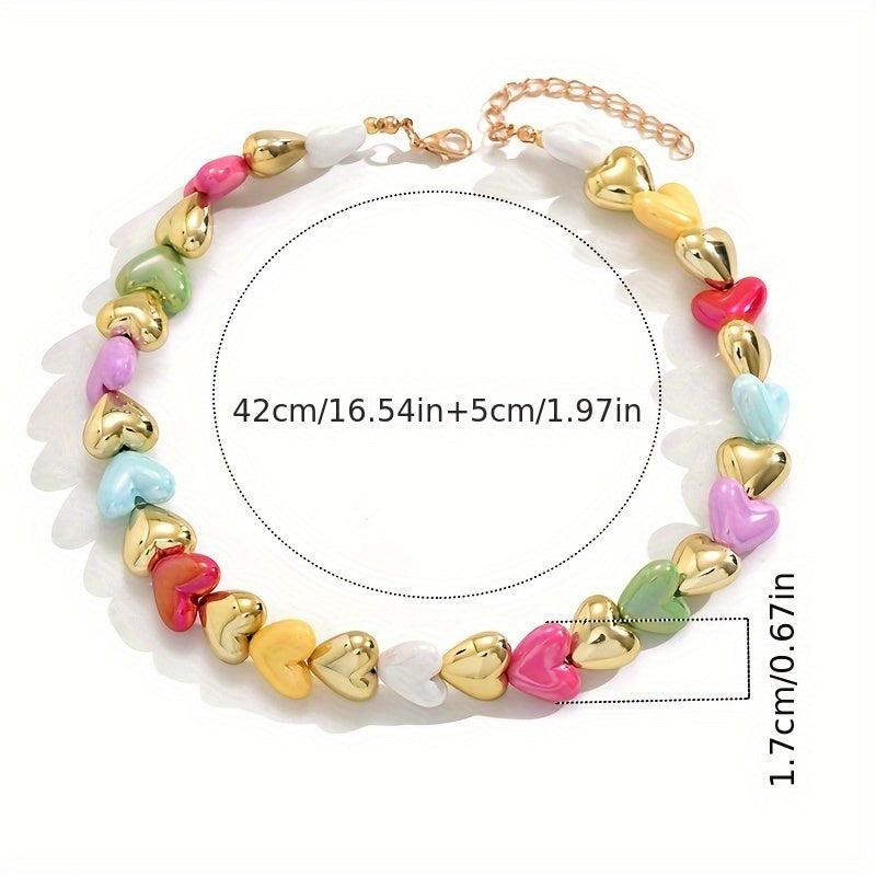This boho resin heart necklace features a colorful design with golden tone plated dangle. Perfect for everyday wear and parties, this accessory adds a touch of bohemian style to your look.