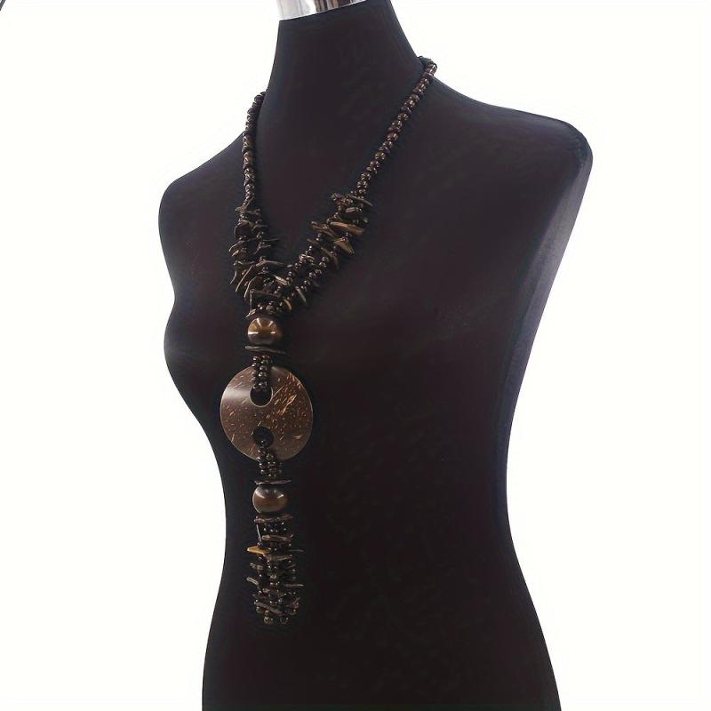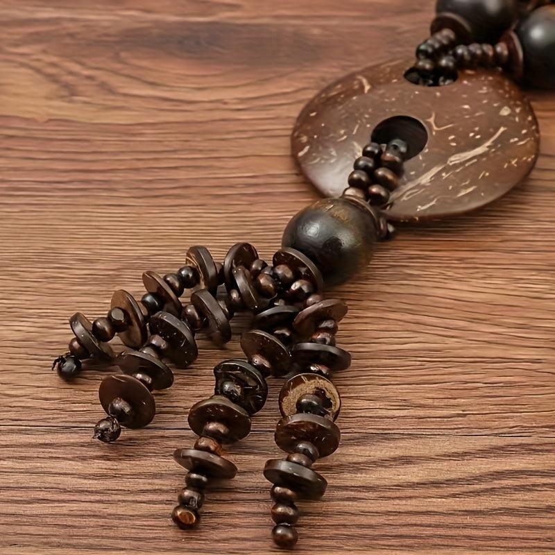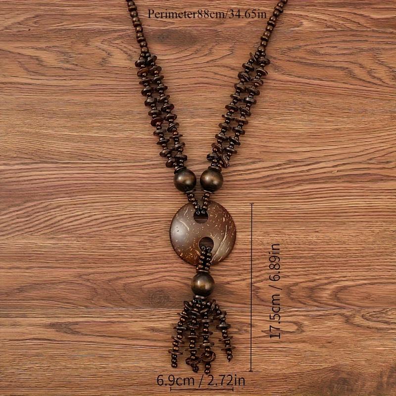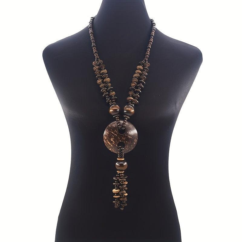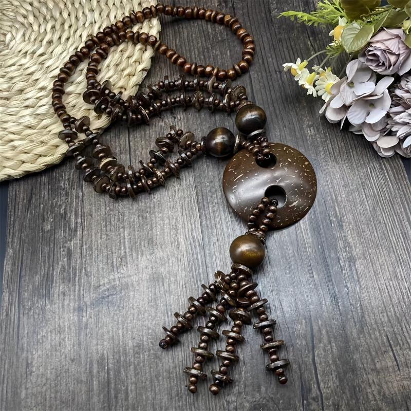 Elevate your style with this bohemian retro long sweater necklace featuring a large round pendant made of natural coffee coconut shell beads. Add a statement jewelry accessory to your outfit for a unique look.