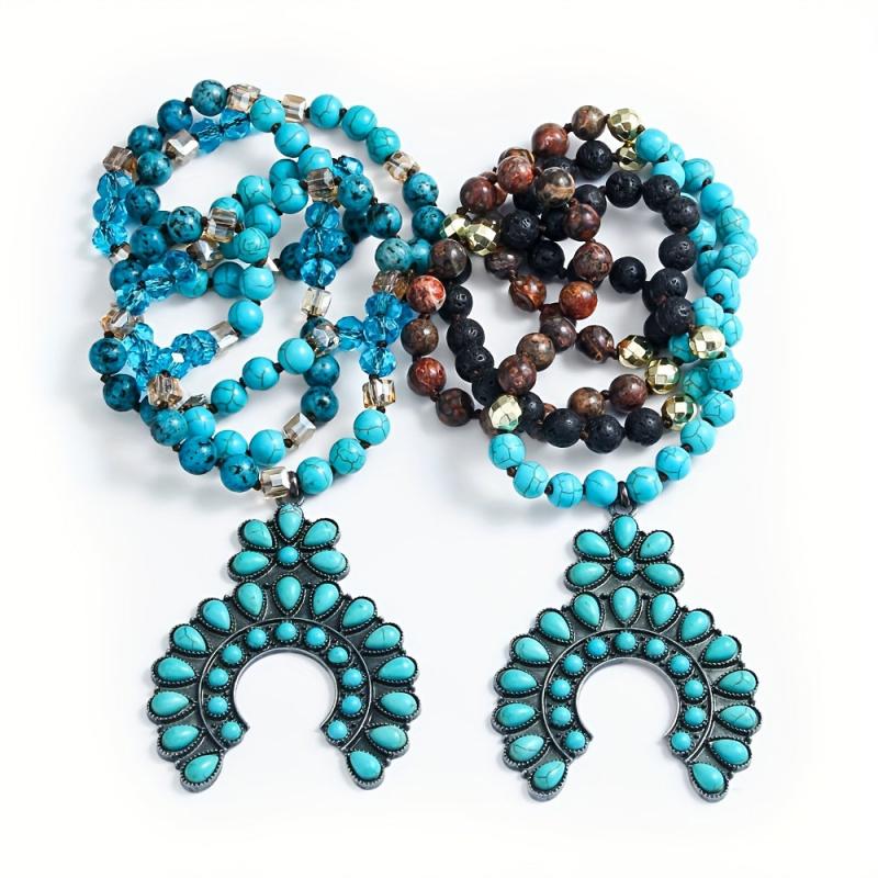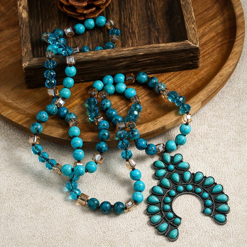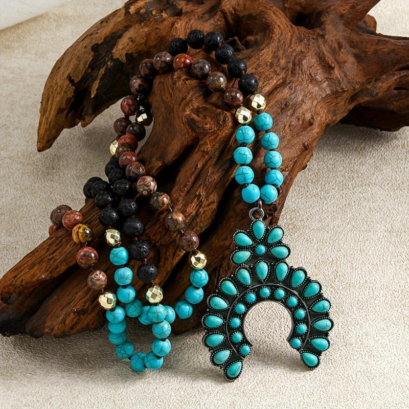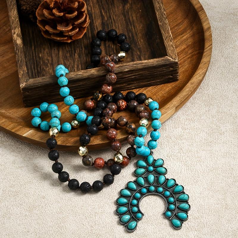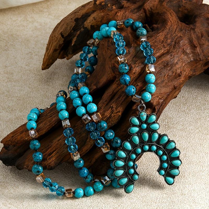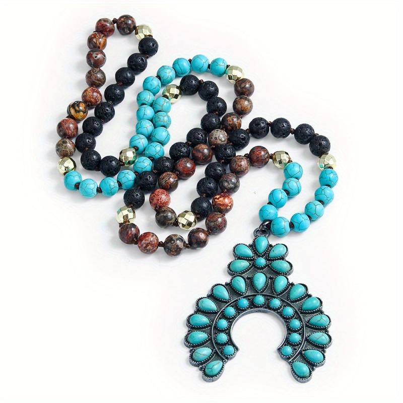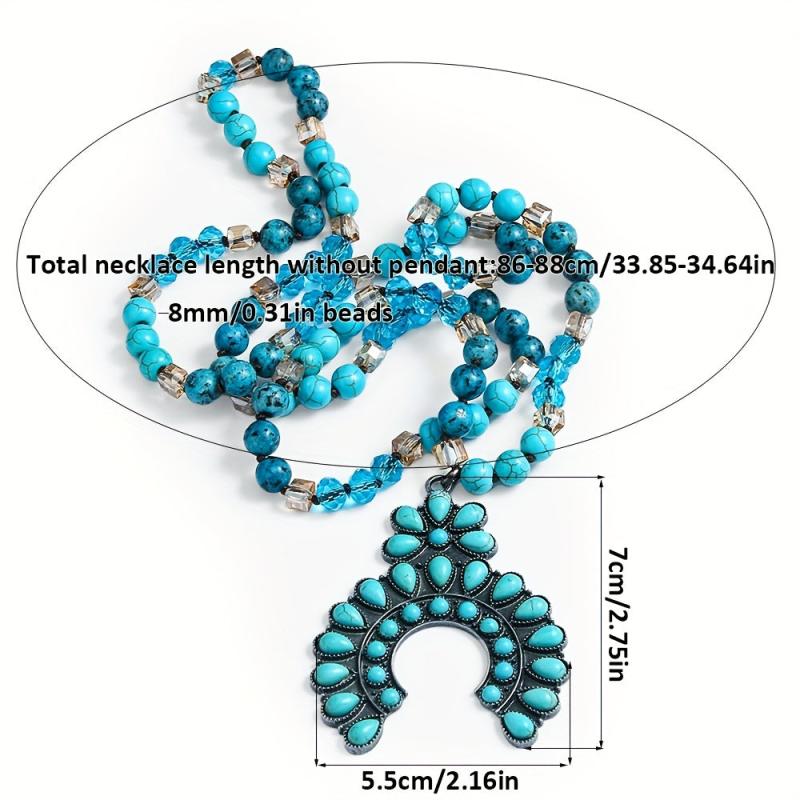 Add a touch of bohemian flair to your outfit with this 8mm natural stone glass turquoise knot necklace. Featuring an exaggerated western style crescent moon design, this necklace is perfect for adding a unique and stylish twist to your look.