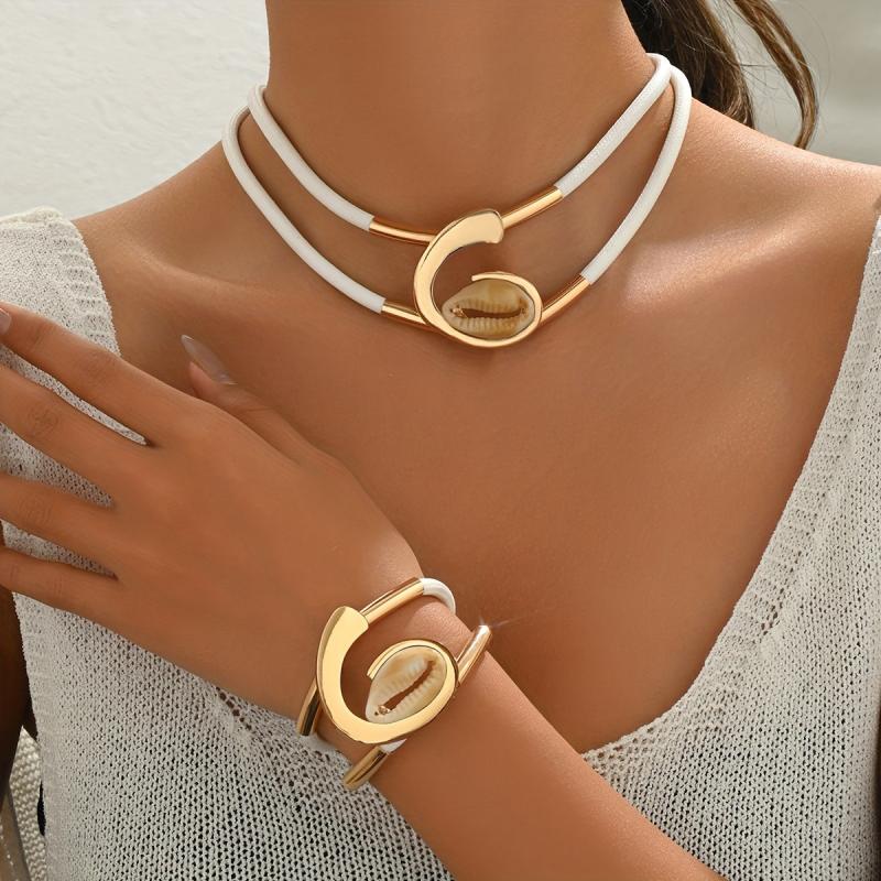Elevate your look with this boho style double strand geometric spiral cuff necklace and bracelet set. Made of zinc alloy with a golden tone, it adds casual elegance to your daily and vacation outfits.