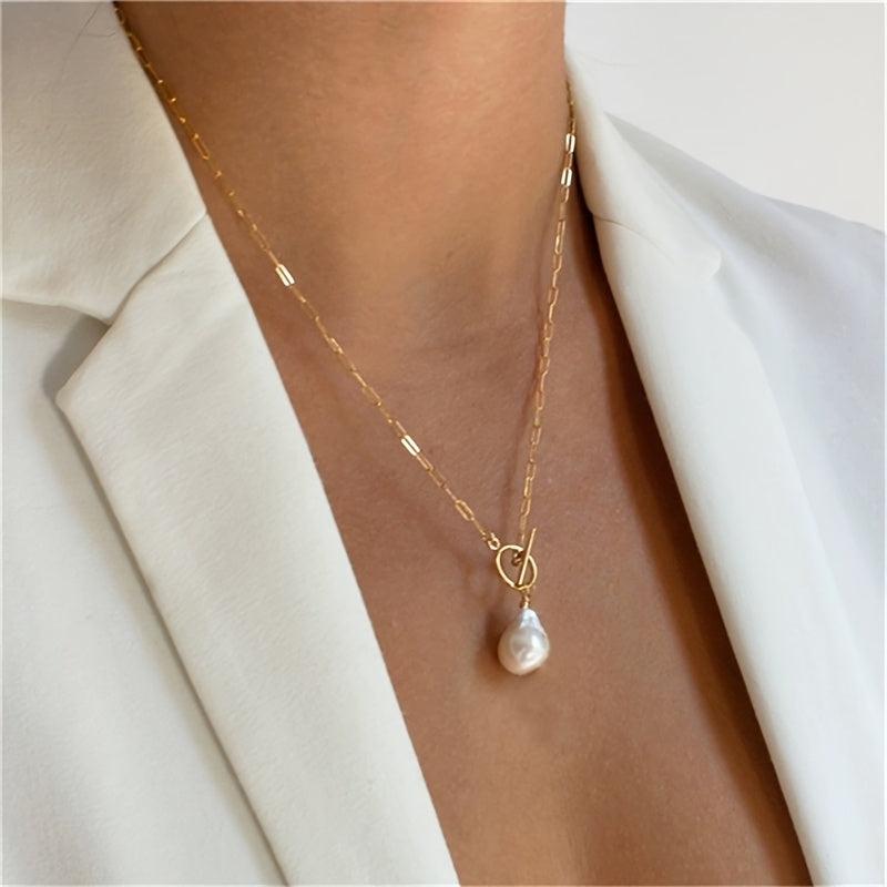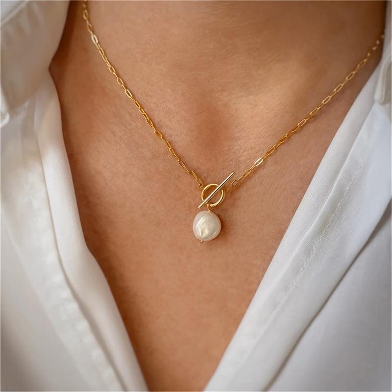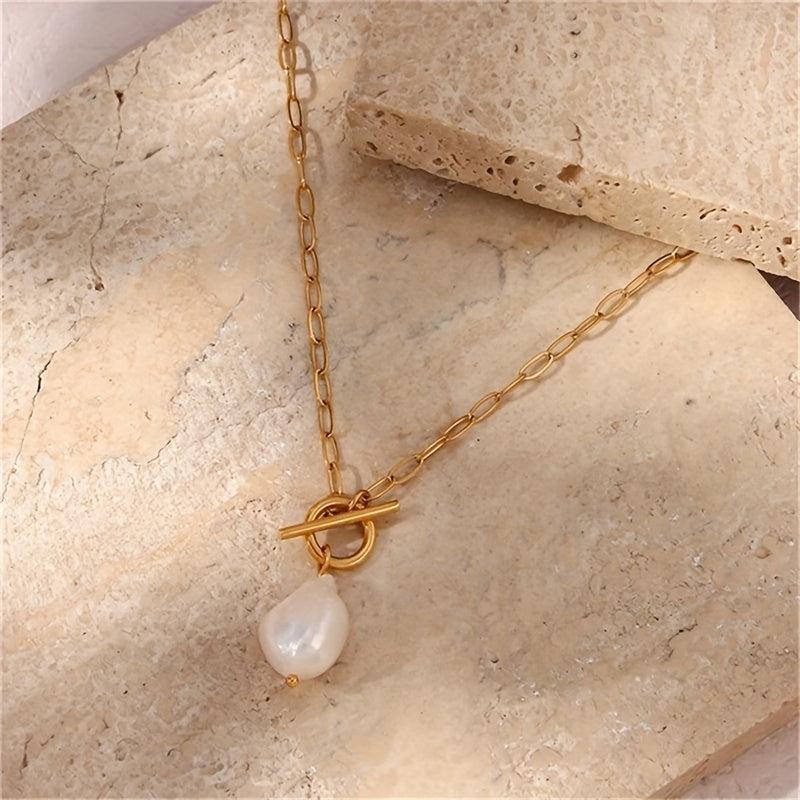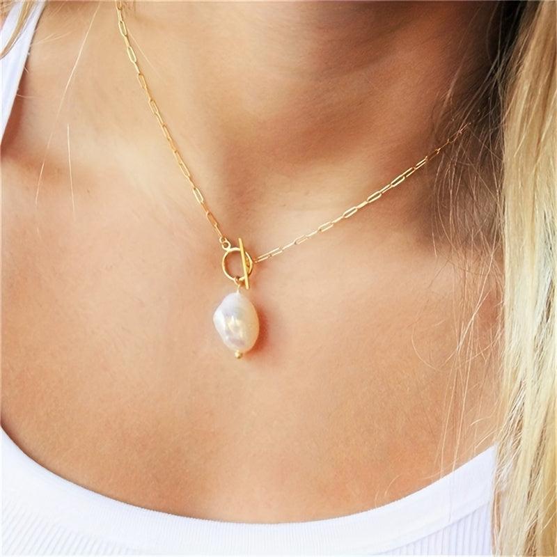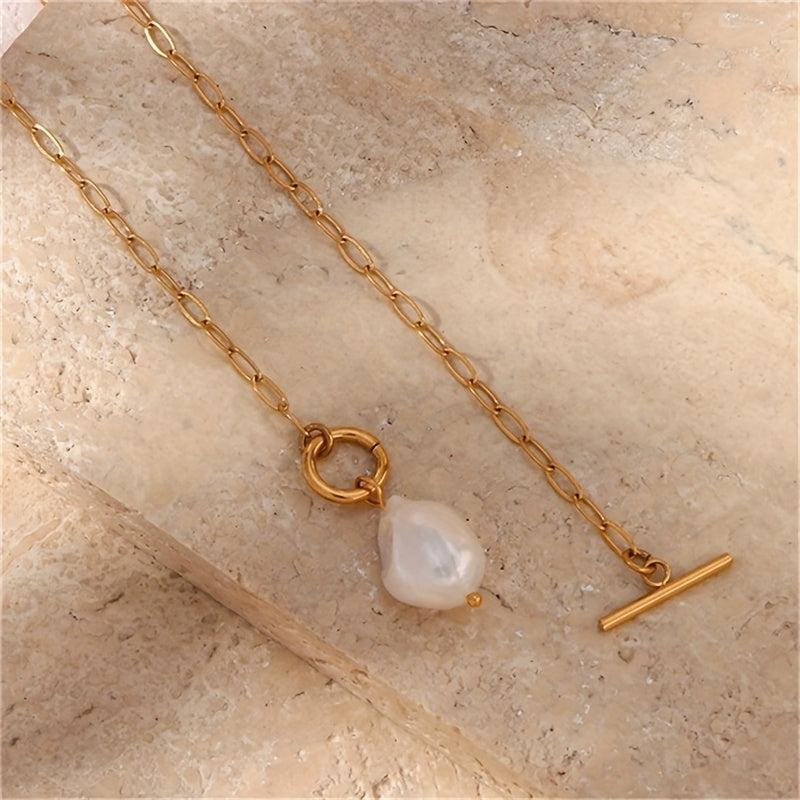 Elevate your style with this bohemian necklace featuring unique freshwater pearls on a delicate golden tone chain.