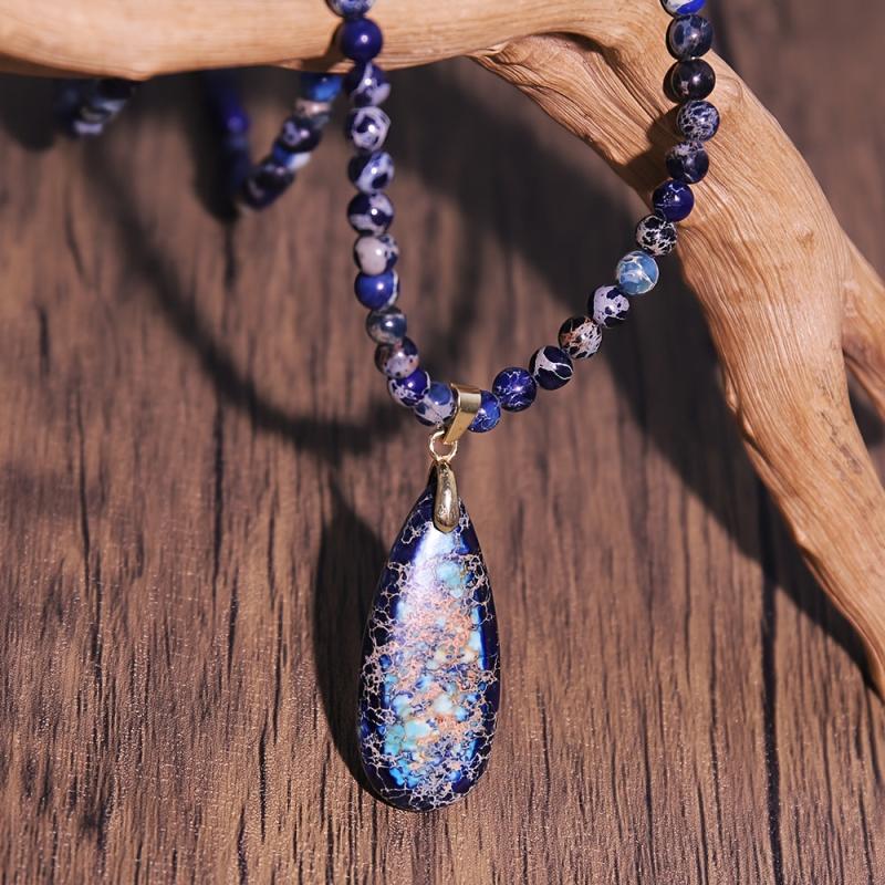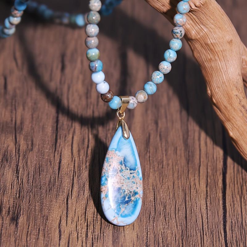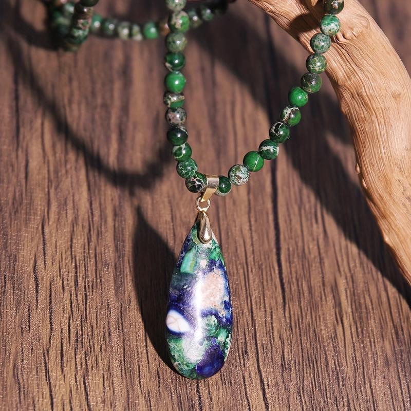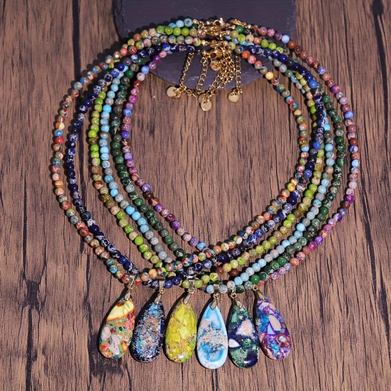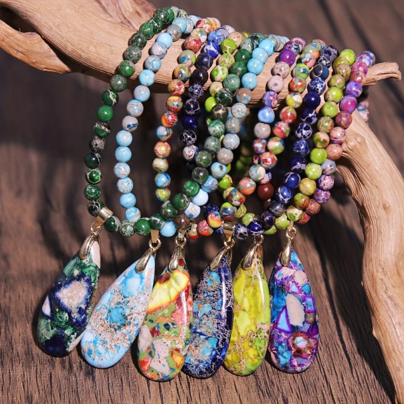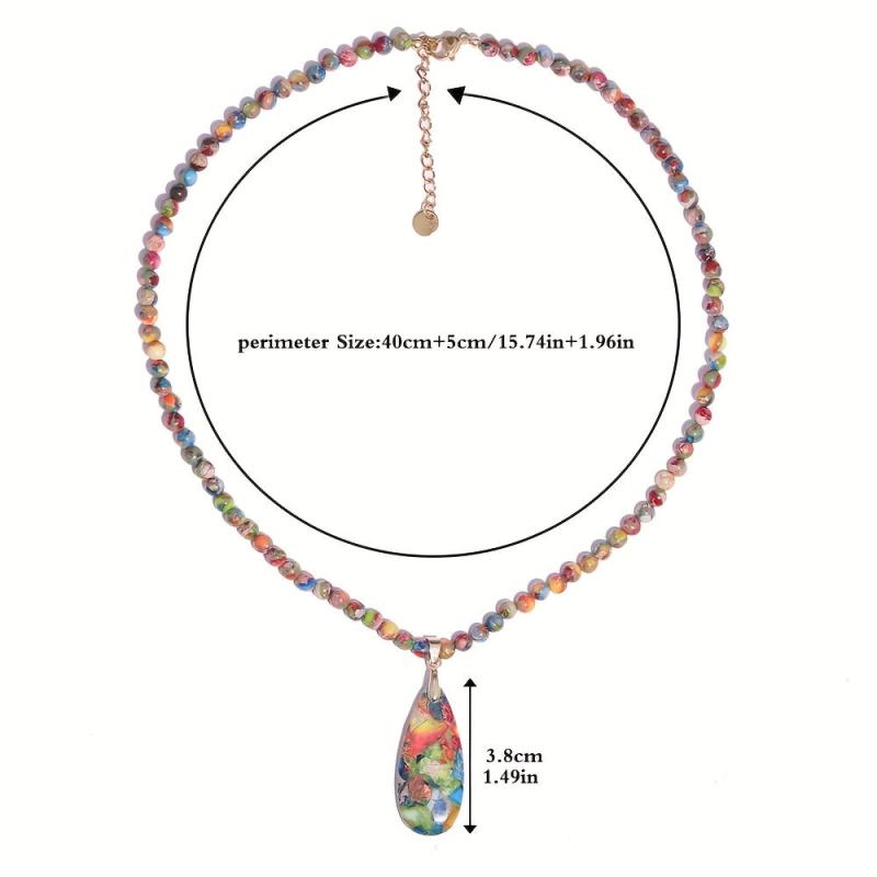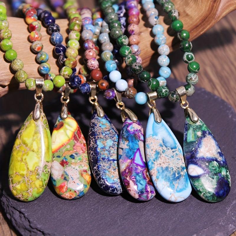 Add a pop of color to your look with this unique and fashionable drop shape pendant necklace featuring colorful natural stones. It's the perfect gift for someone who loves bohemian style.