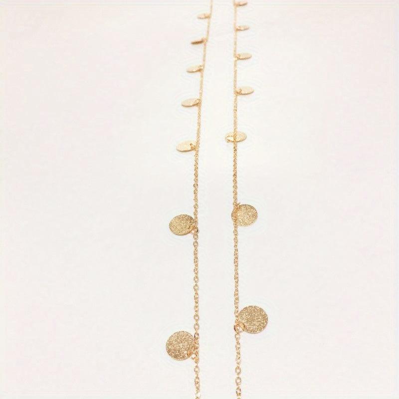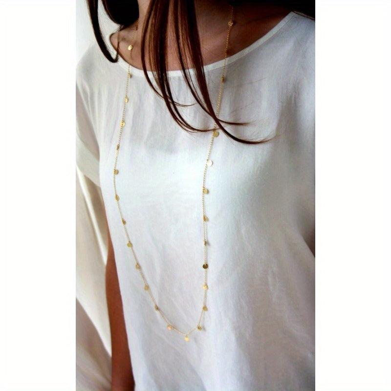 Make a statement with this boho-style long pendant necklace featuring sequins in a vintage golden tone. The perfect accessory to enhance your personality and elevate your look.