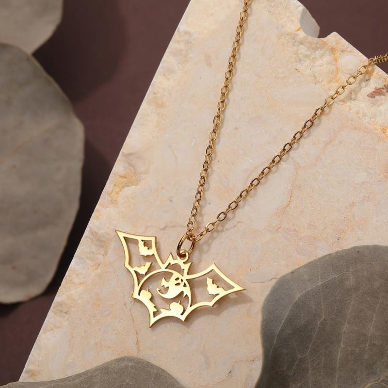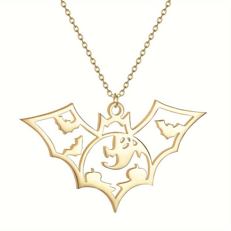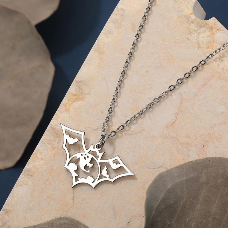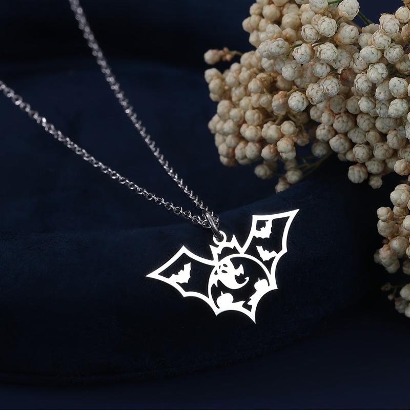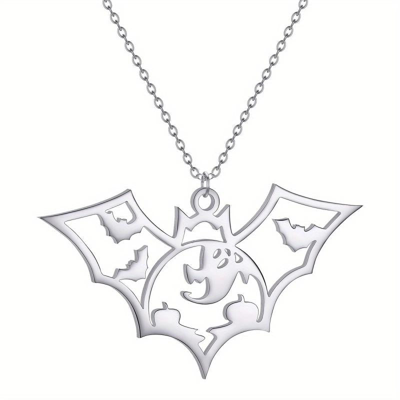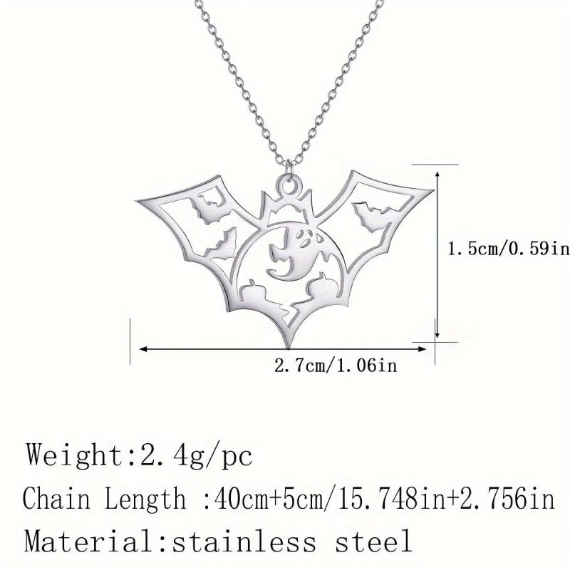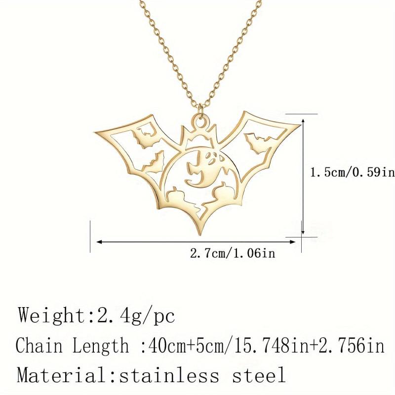 Elevate your Halloween look with this vintage boho style stainless steel necklace featuring a ghost pumpkin and bats pendant. Ideal Halloween gift for both women and men.