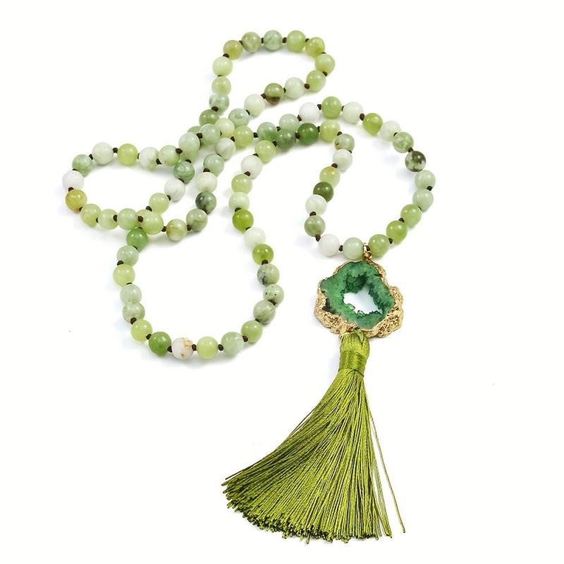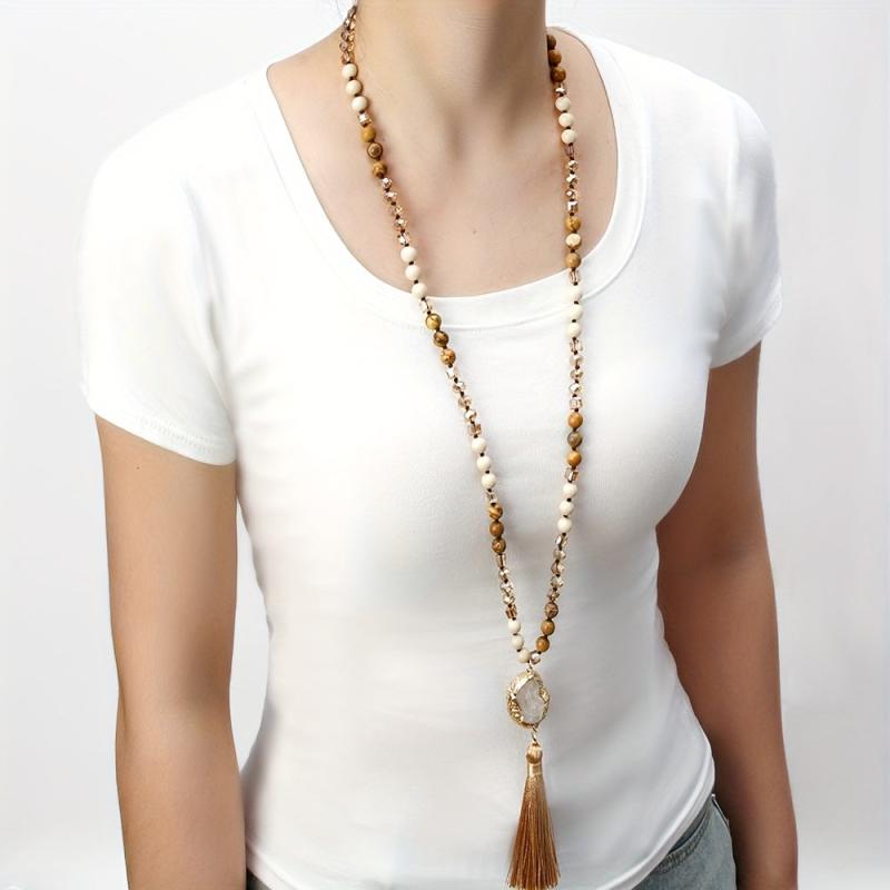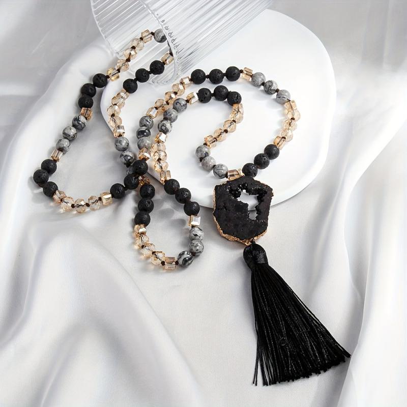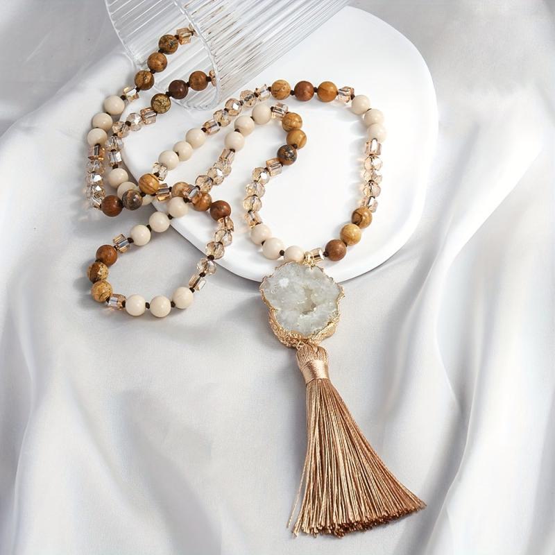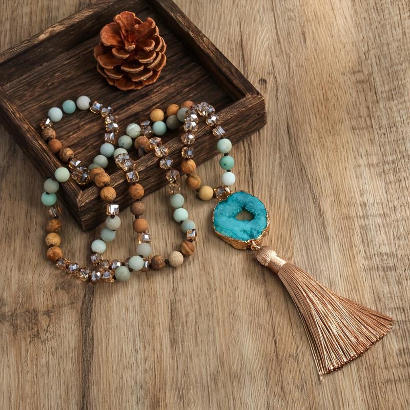Elevate your daily look with this bohemian style knot necklace featuring natural stones and glass. The irregular design and multicolor druzy fringe add a unique touch. Perfect for women's everyday wear.