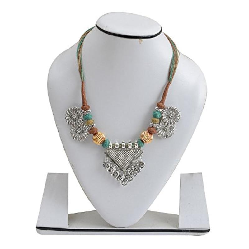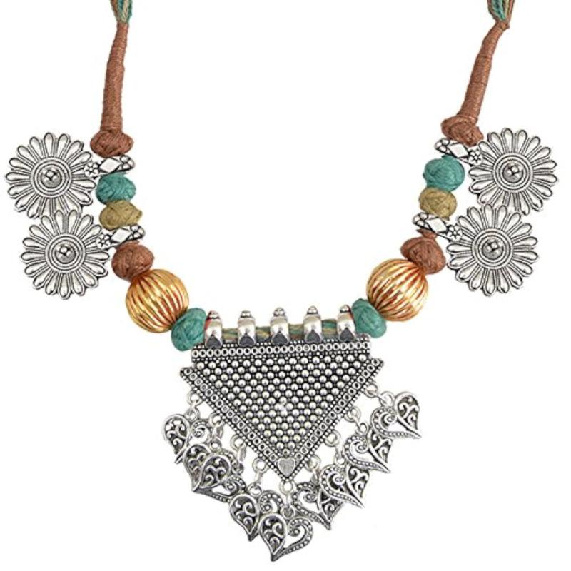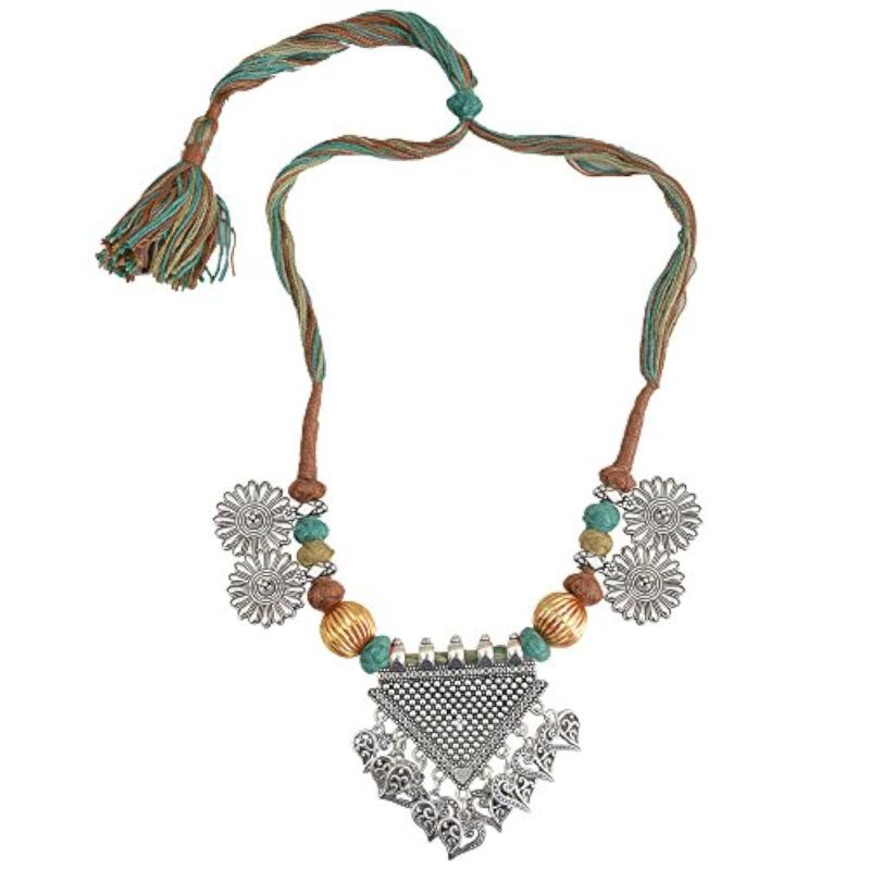 Make a statement with this boho tribal necklace featuring colorful beads and tassels. Perfect accessory for a festival or beach day.