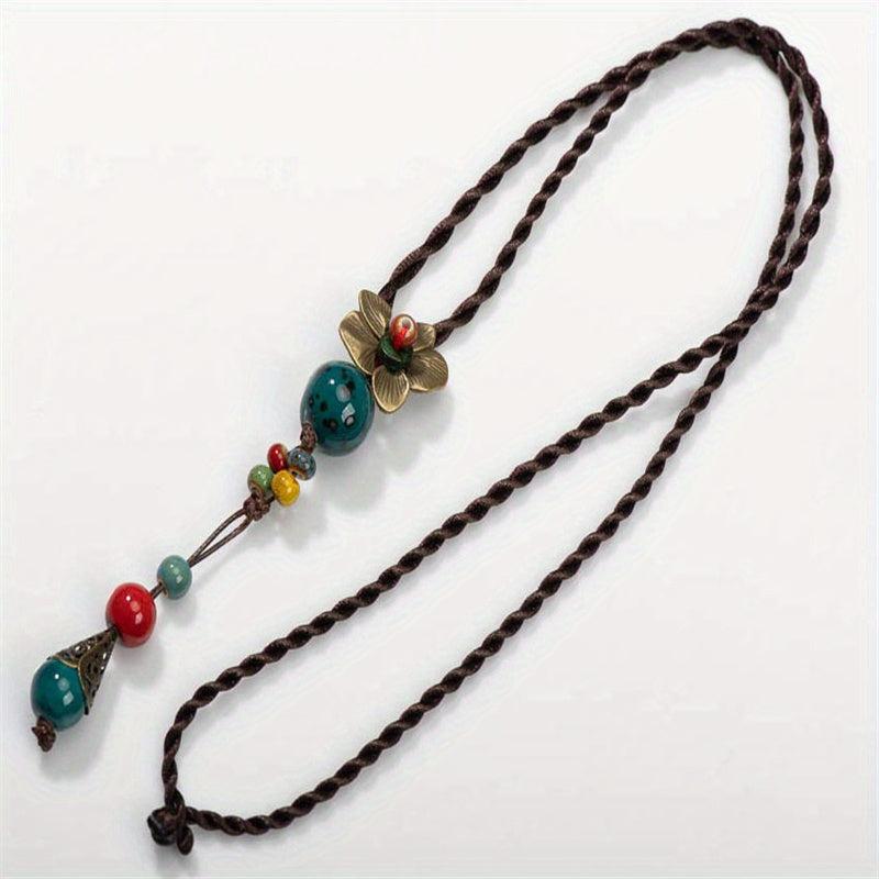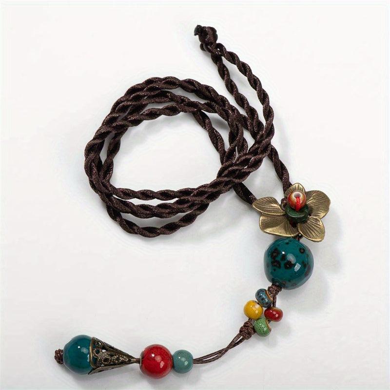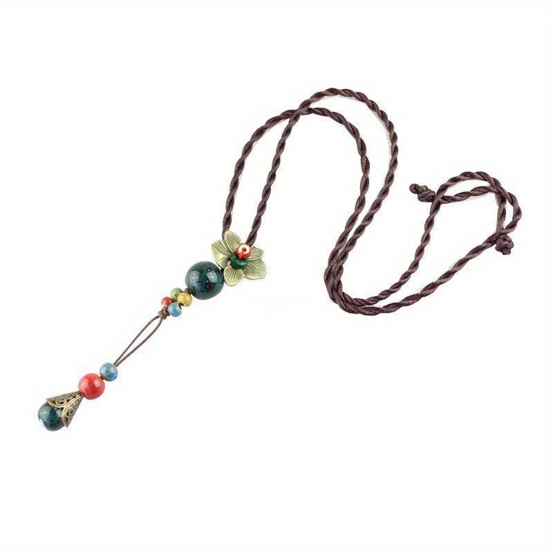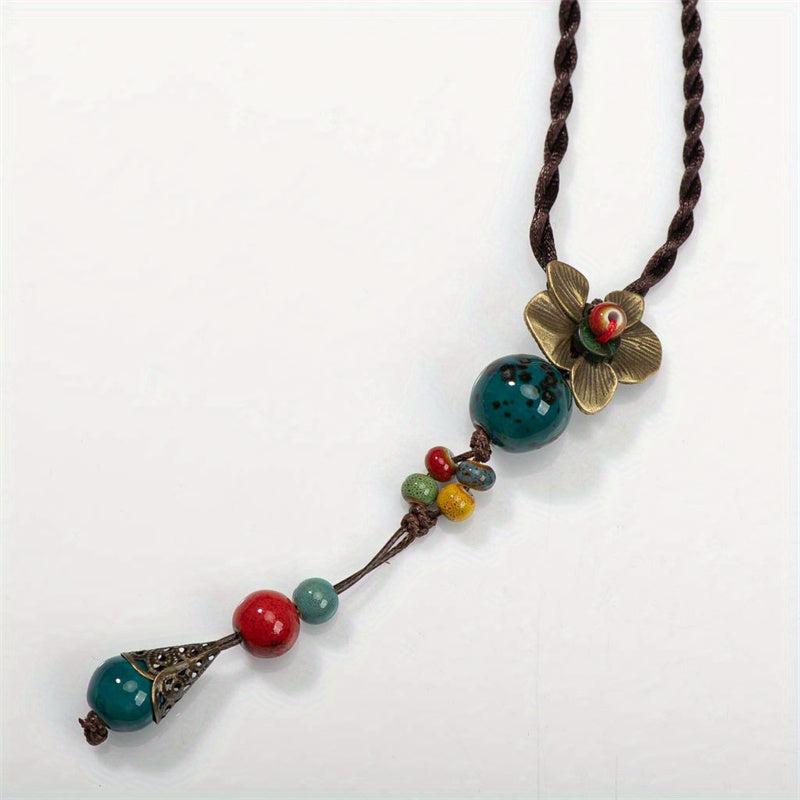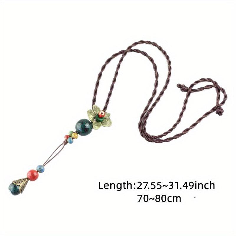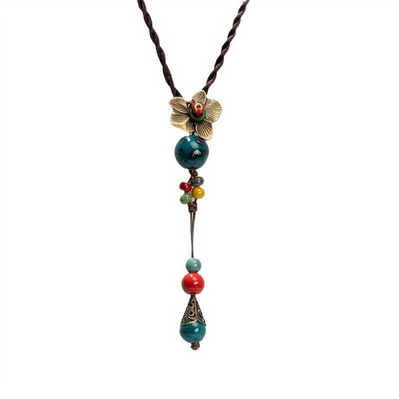 This Bohemian vintage Y necklace features ceramic beads and an antique flower pendant, offering a colorful and unique look. Perfect for everyday wear or vacation, this necklace is an ideal gift for women who love boho style.