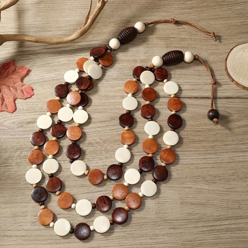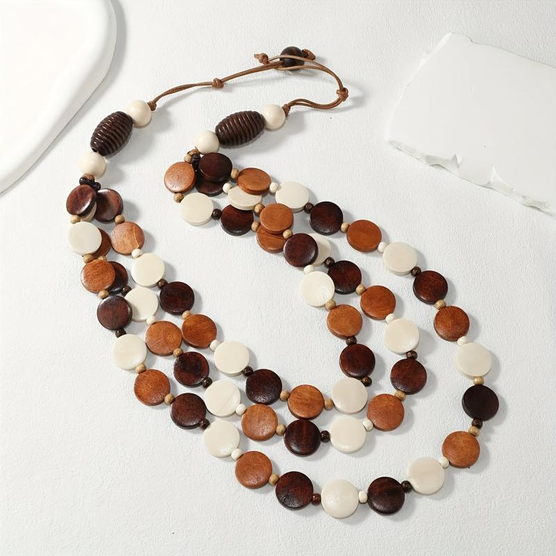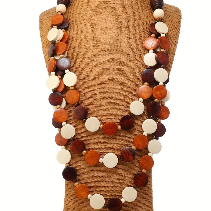 Elevate your casual attire with this bohemian vintage extra long necklace crafted from recycled wood beads in natural brown tones and discs. Perfect for festivals and as a thoughtful gift.
