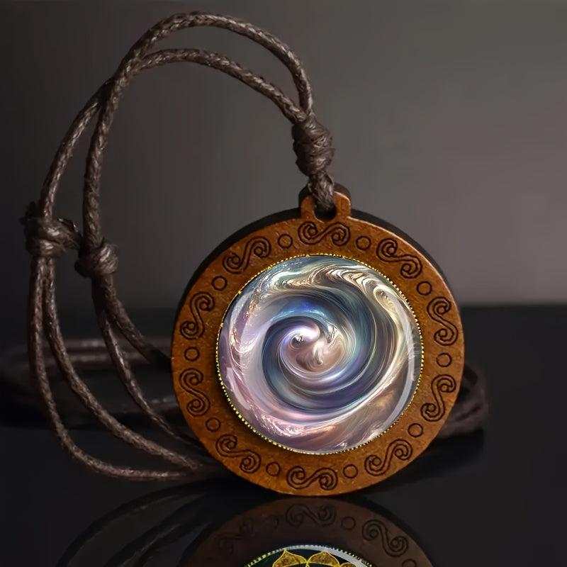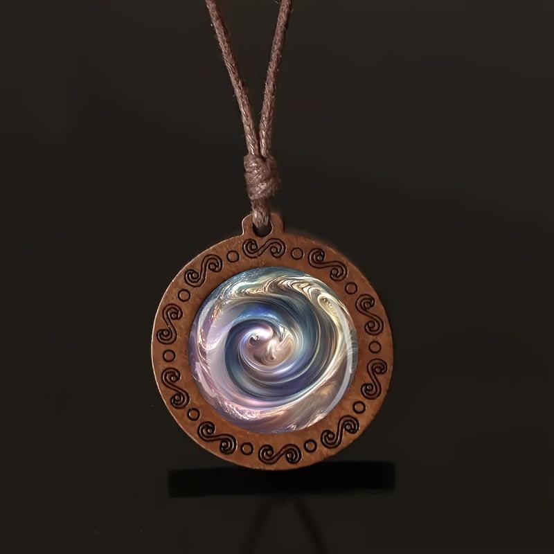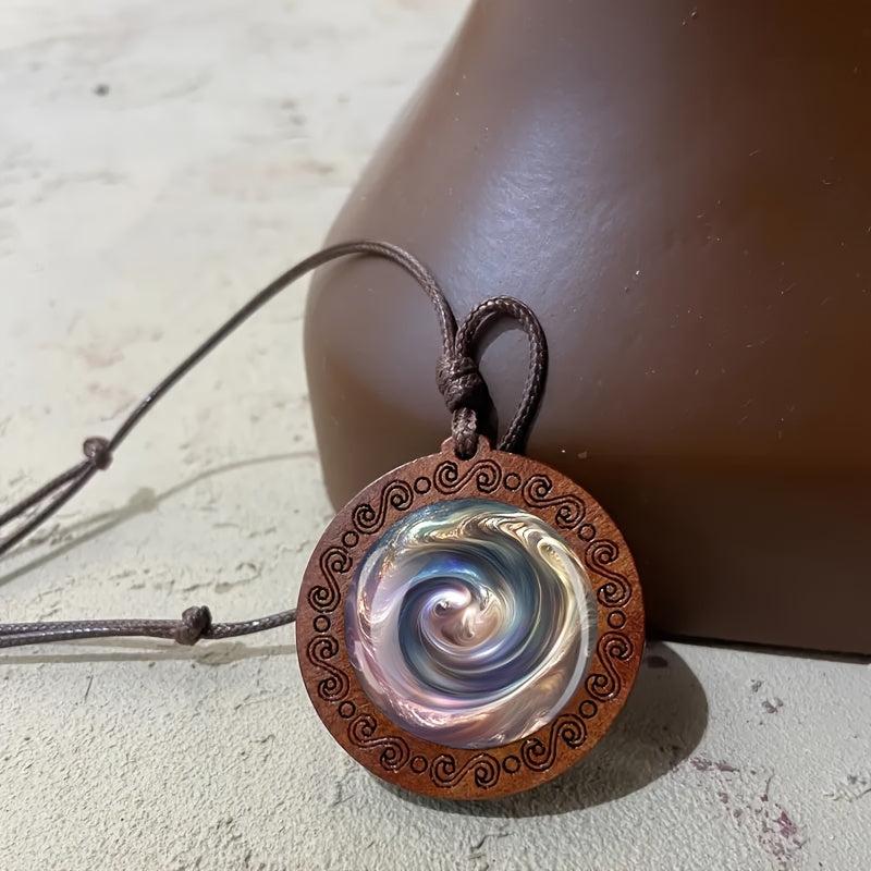 Embrace bohemian style with this unique wooden pendant necklace featuring a mystical spiral galaxy design. The natural wood finish adds a touch of earthy charm, making it perfect for daily wear or gifting to a loved one.