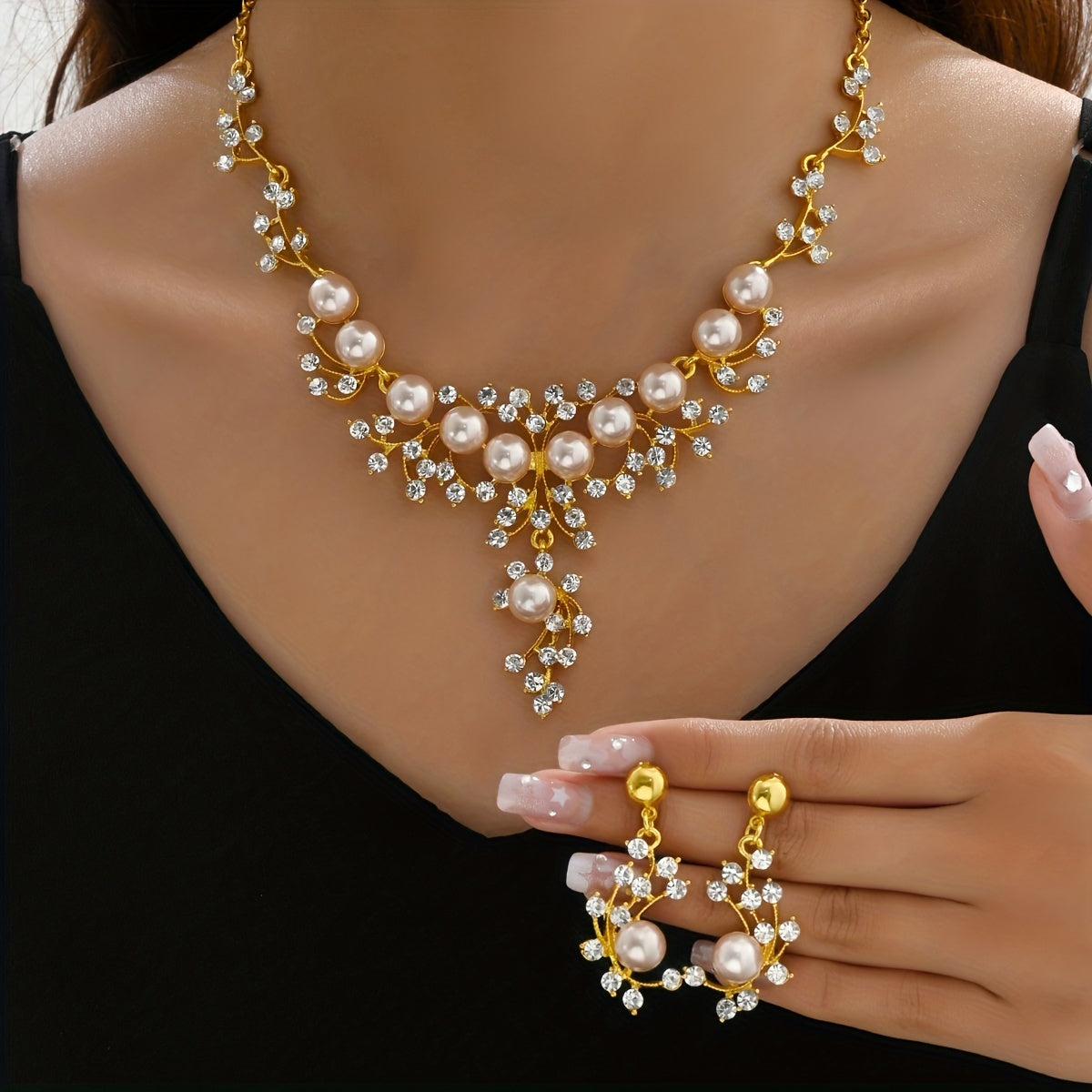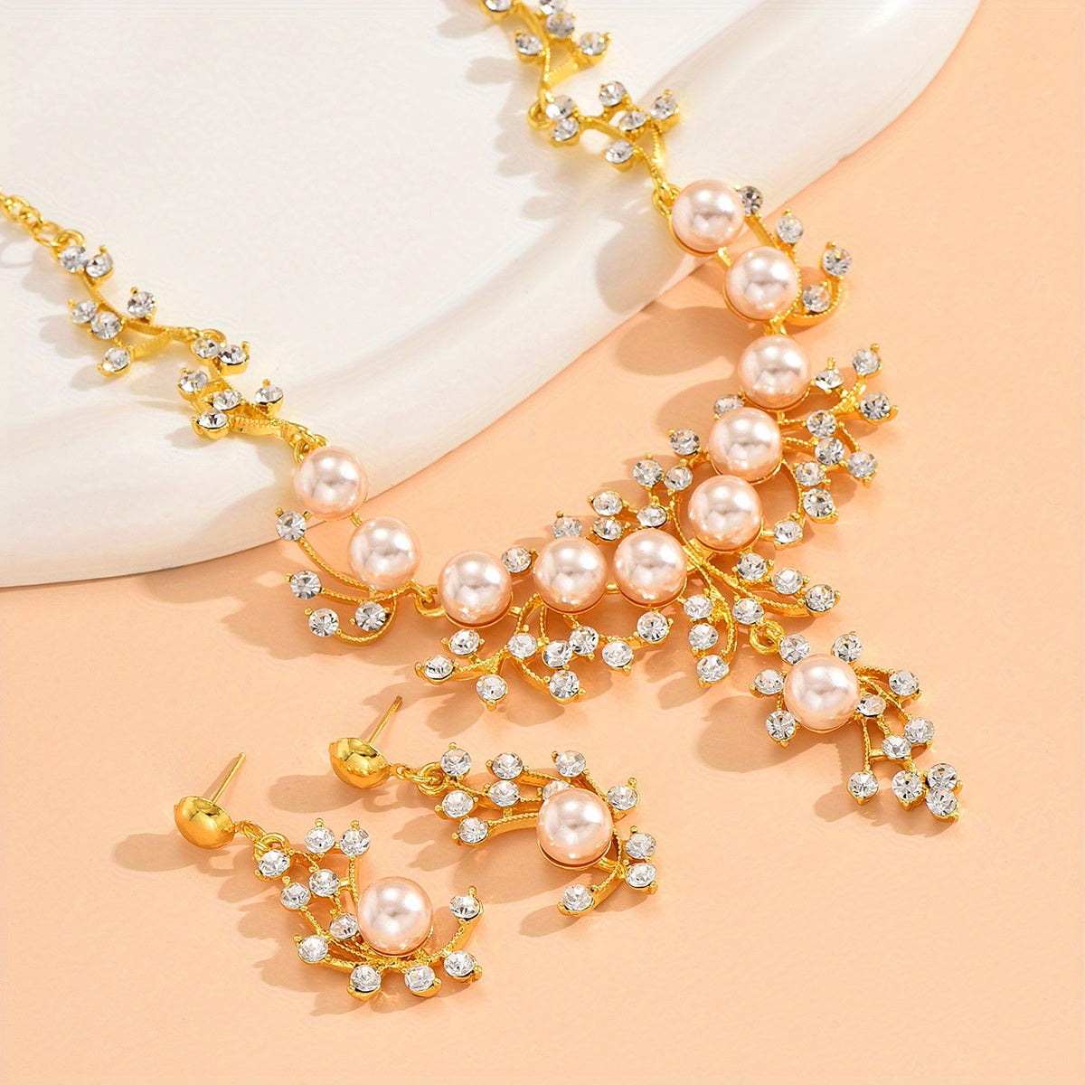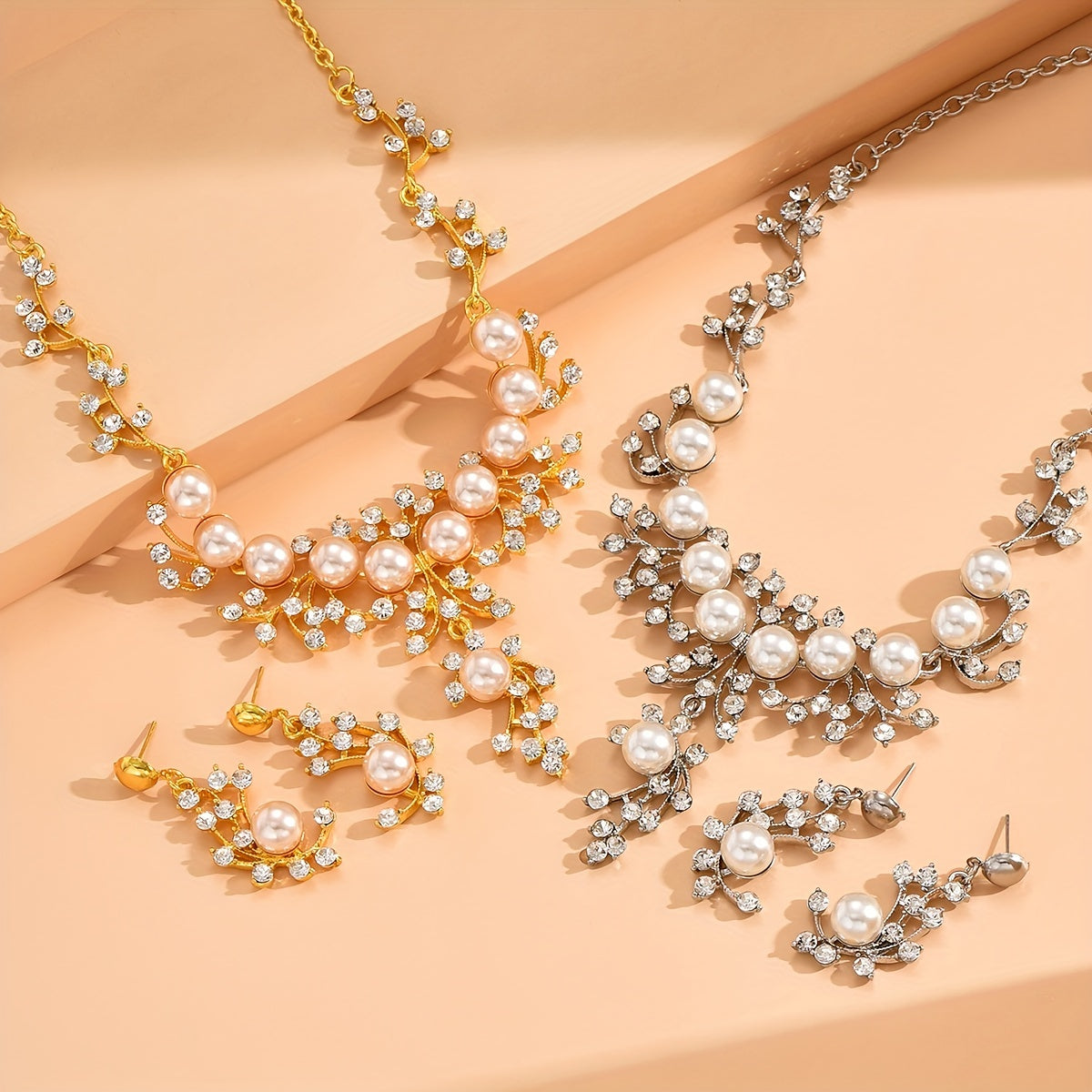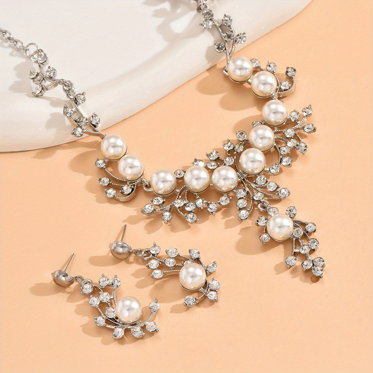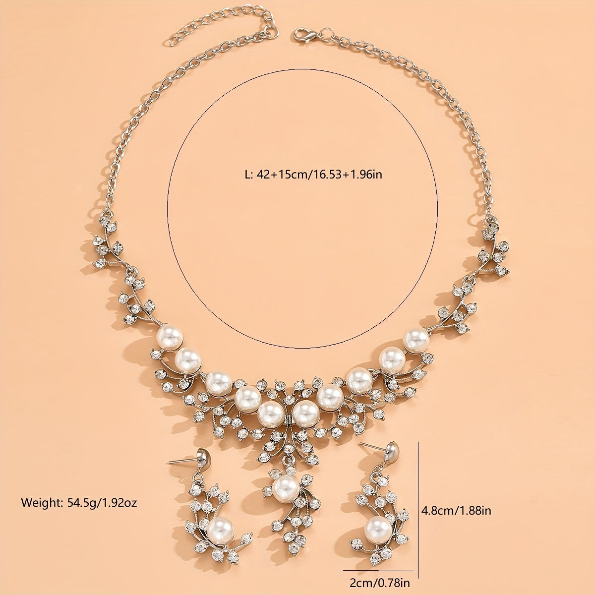 This elegant jewelry set features a pendant necklace and dangle earrings, perfect for weddings. The faux pearls add a touch of sophistication to any bridal outfit.