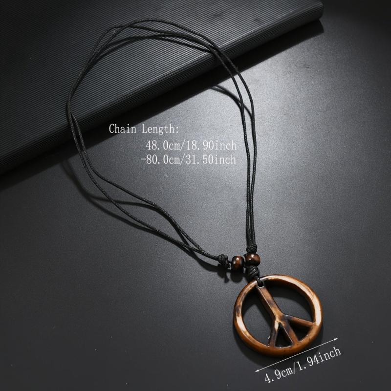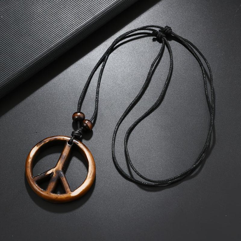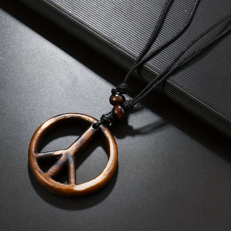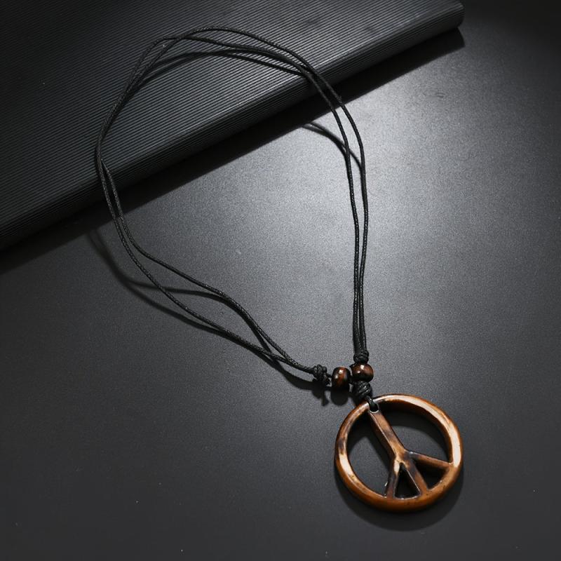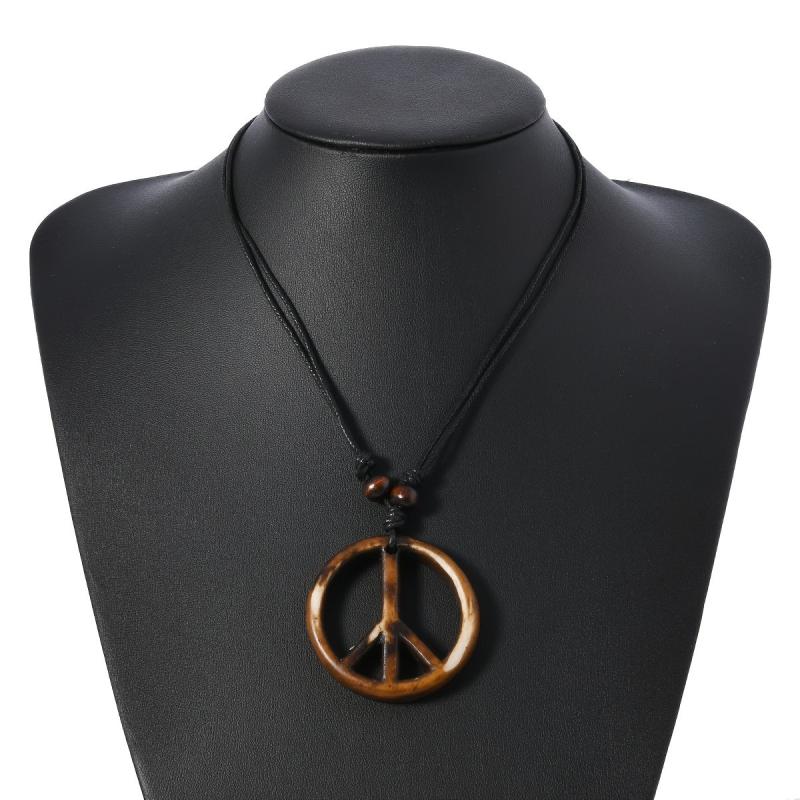 Handcrafted funky pendant necklace for men featuring a brown resin peace sign pendant on synthetic fiber rope.