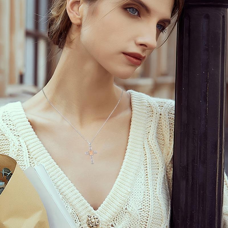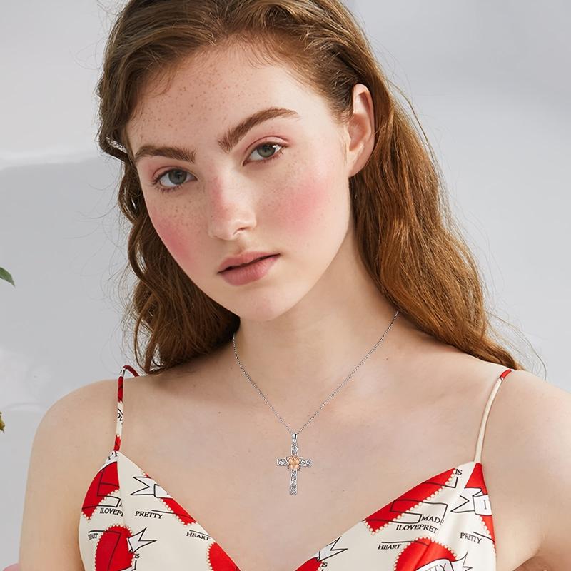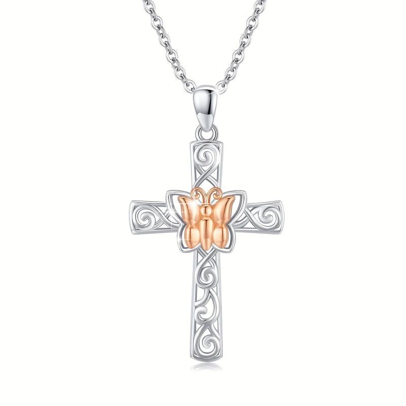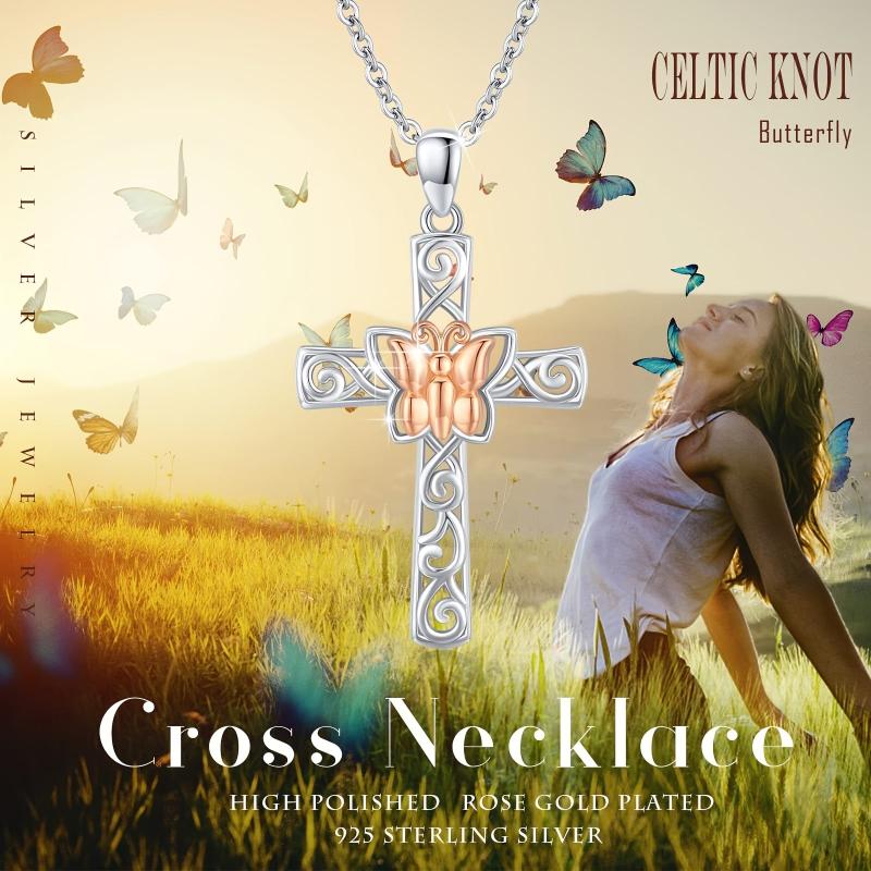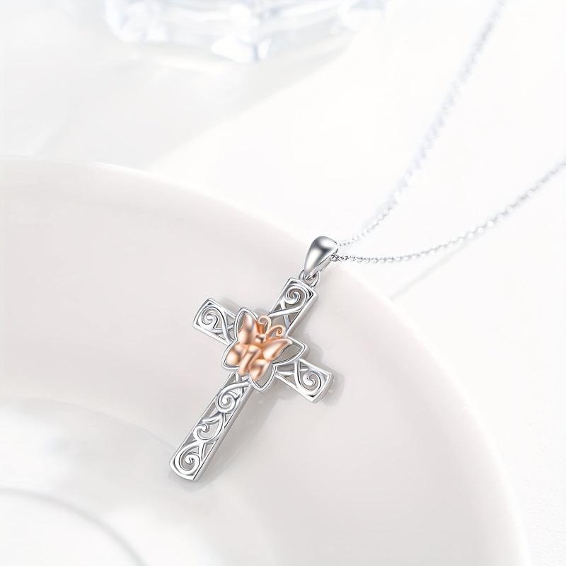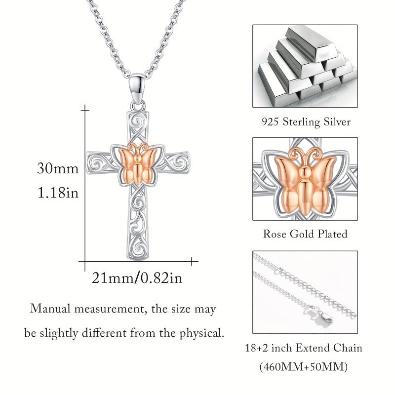 This stunning butterfly cross pendant necklace is made of 925 sterling silver with a rose golden finish. It is a symbol of faith and good luck, making it a perfect gift for women.