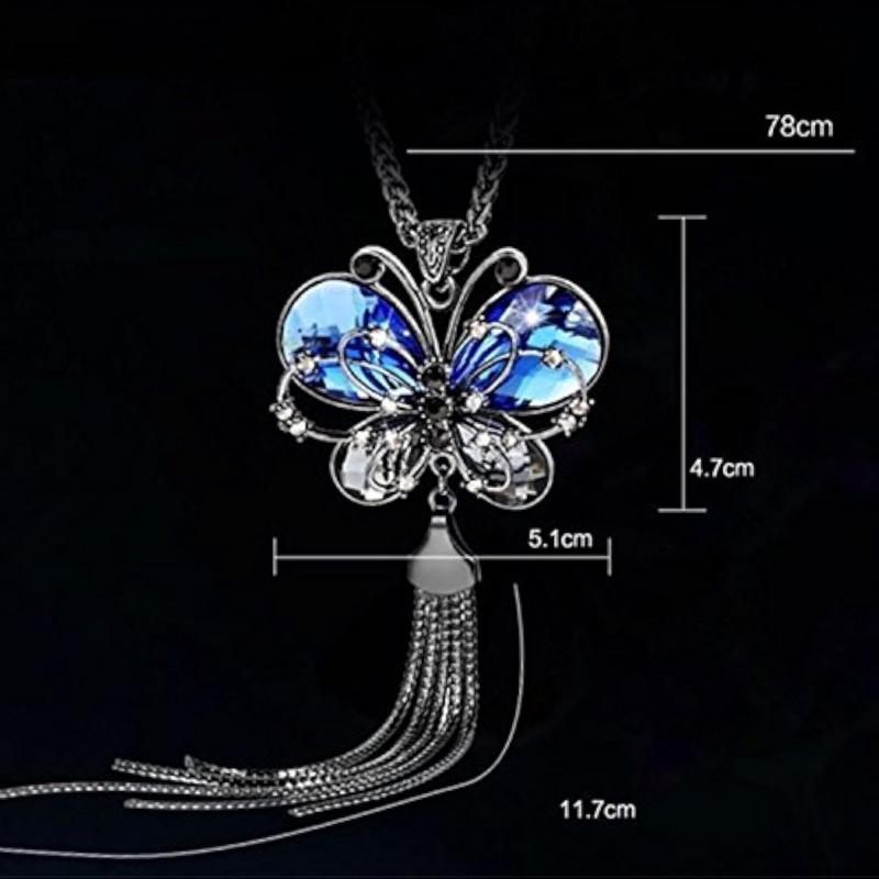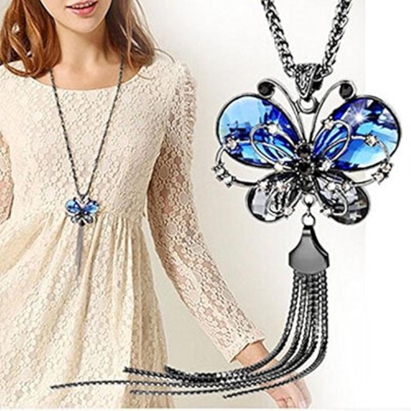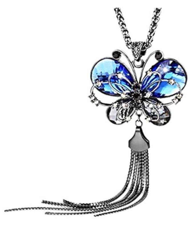 Beautiful butterfly pendant necklace with crystal accents on a long chain. Perfect for adding a touch of charm to any outfit.
