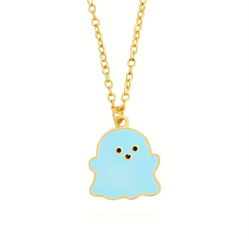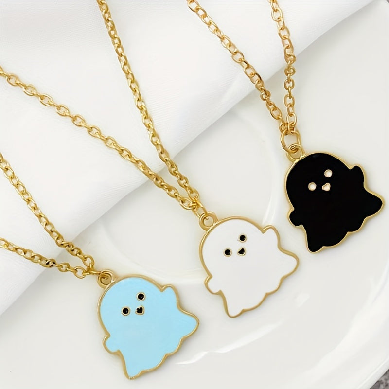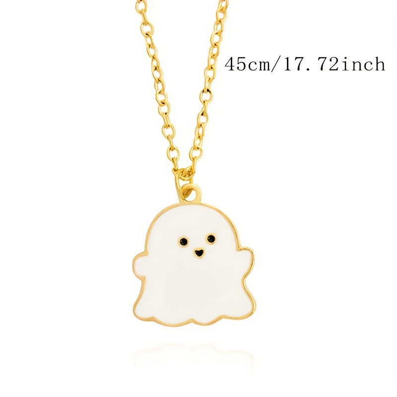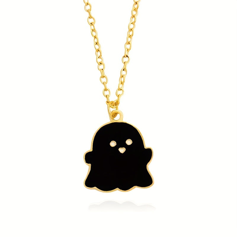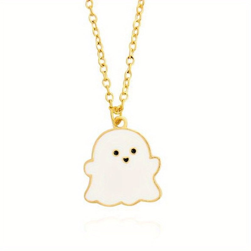 This charming vintage golden enamel ghost pendant necklace is perfect for women and men who love goth style. It makes a lovely couple choker or amulet and is ideal as a Halloween gift.