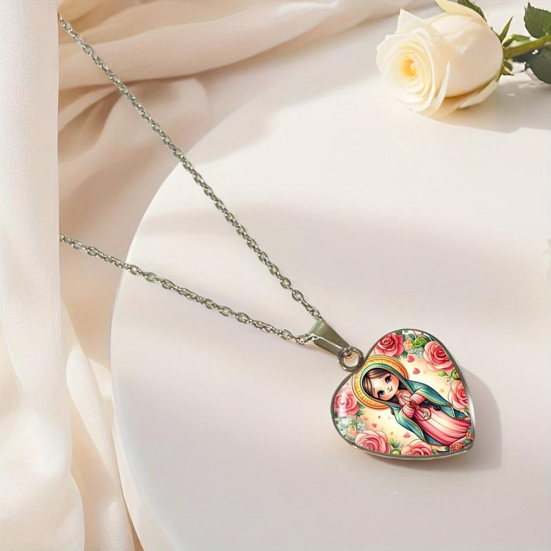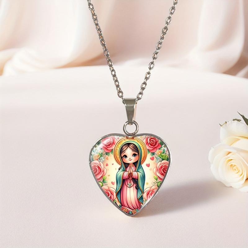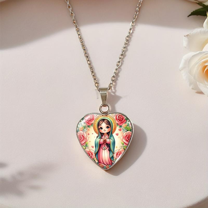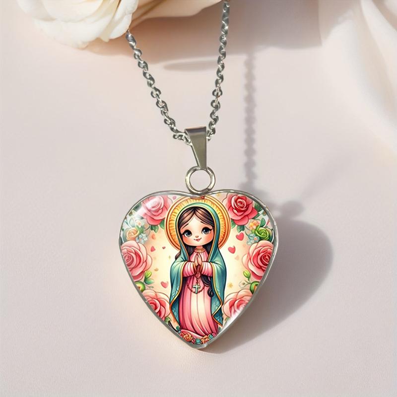 • Cartoon Virgin Mary & Rose Heart Pendant Necklace