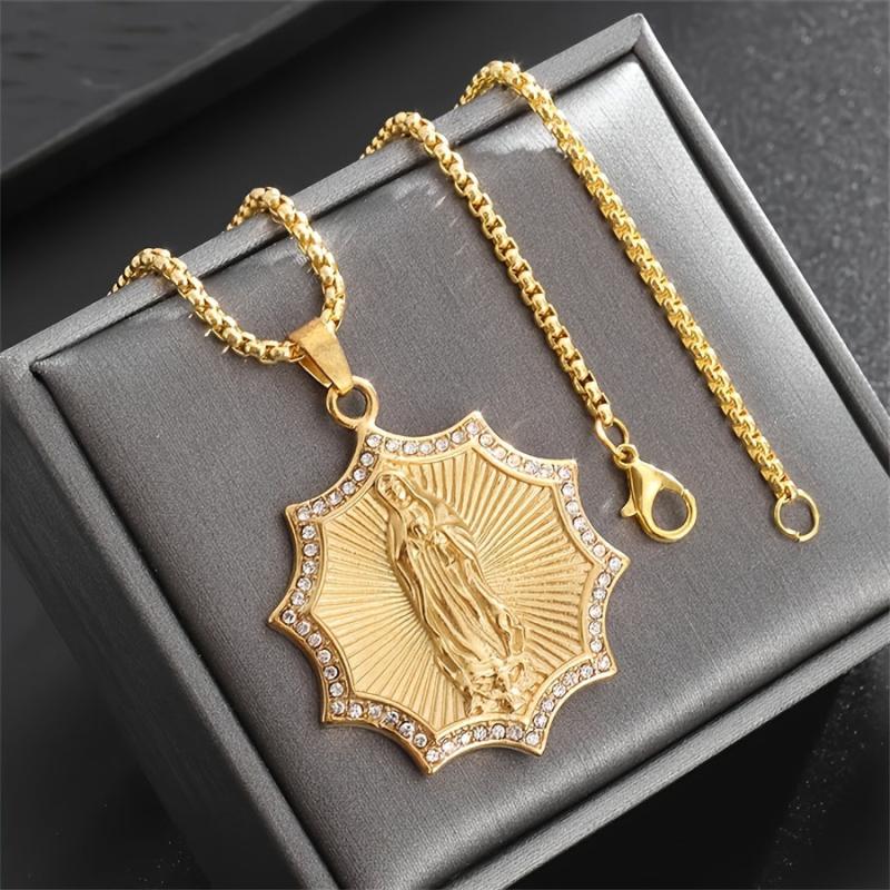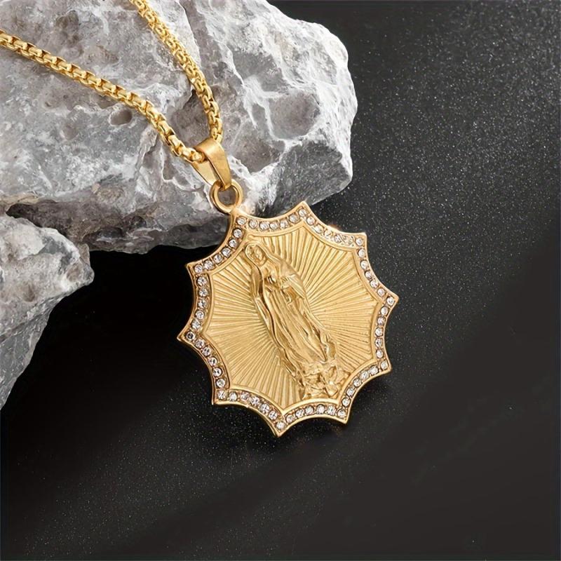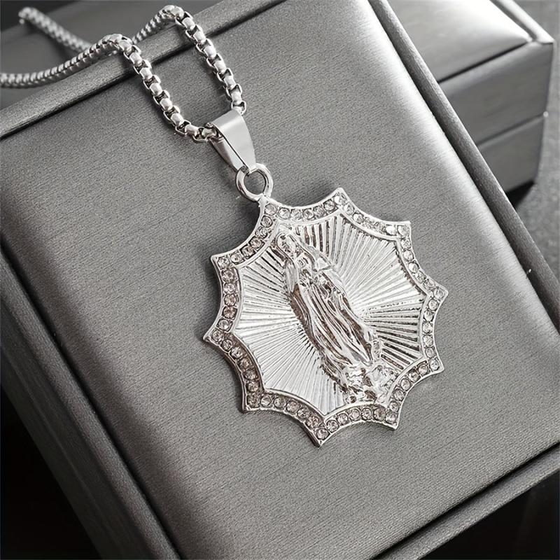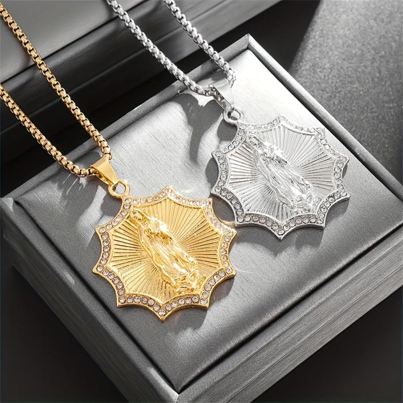This Catholic pendant necklace features a sunflower design with zirconia accents, perfect for expressing your faith. The intricate details and high-quality materials make it a beautiful Christian prayer jewelry piece.
