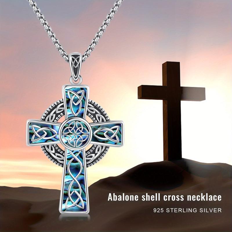 Elegant Irish Celtic cross pendant made of 925 sterling silver with intricate details and vibrant abalone shell inlay.