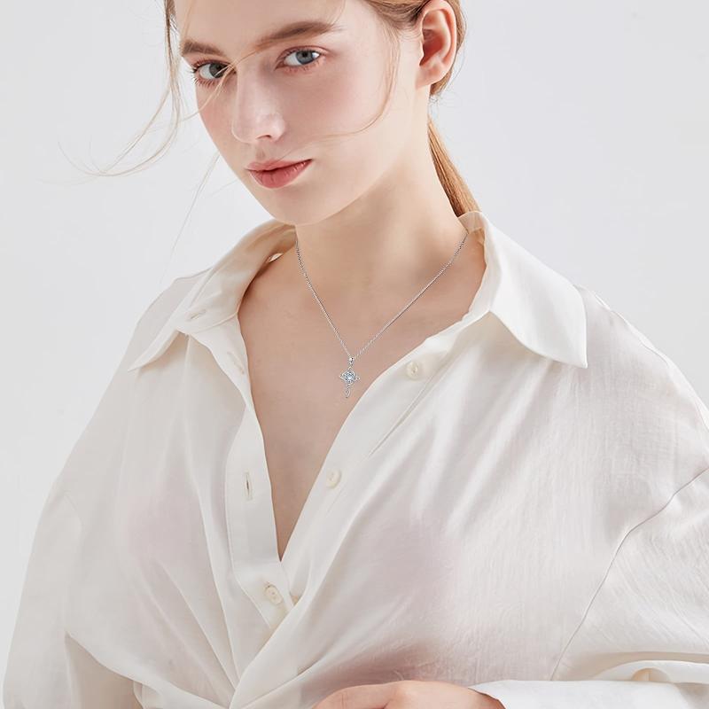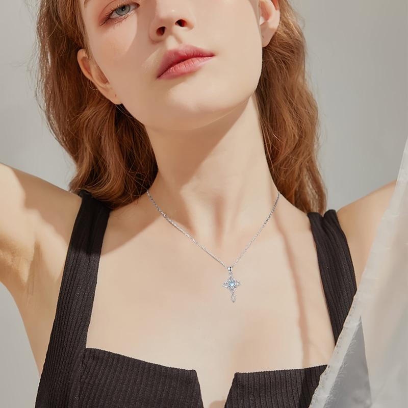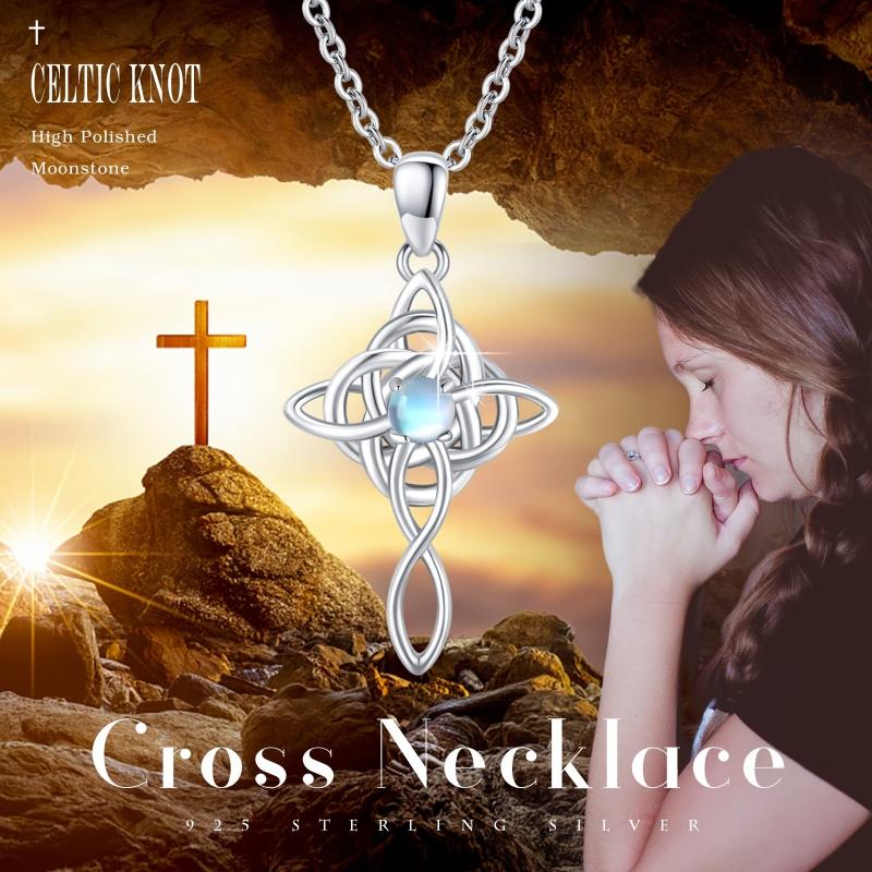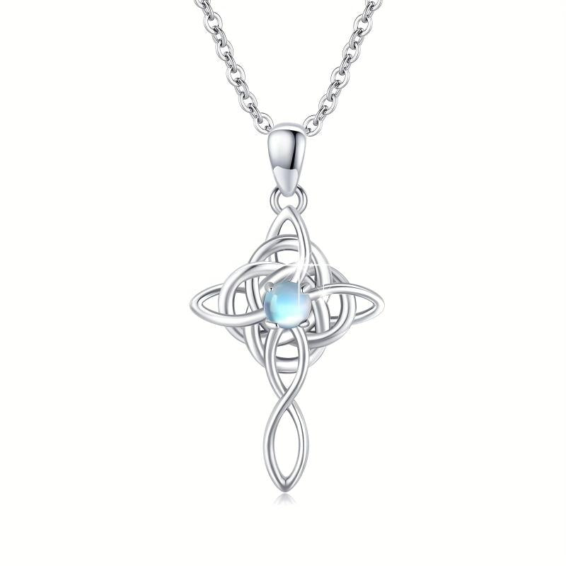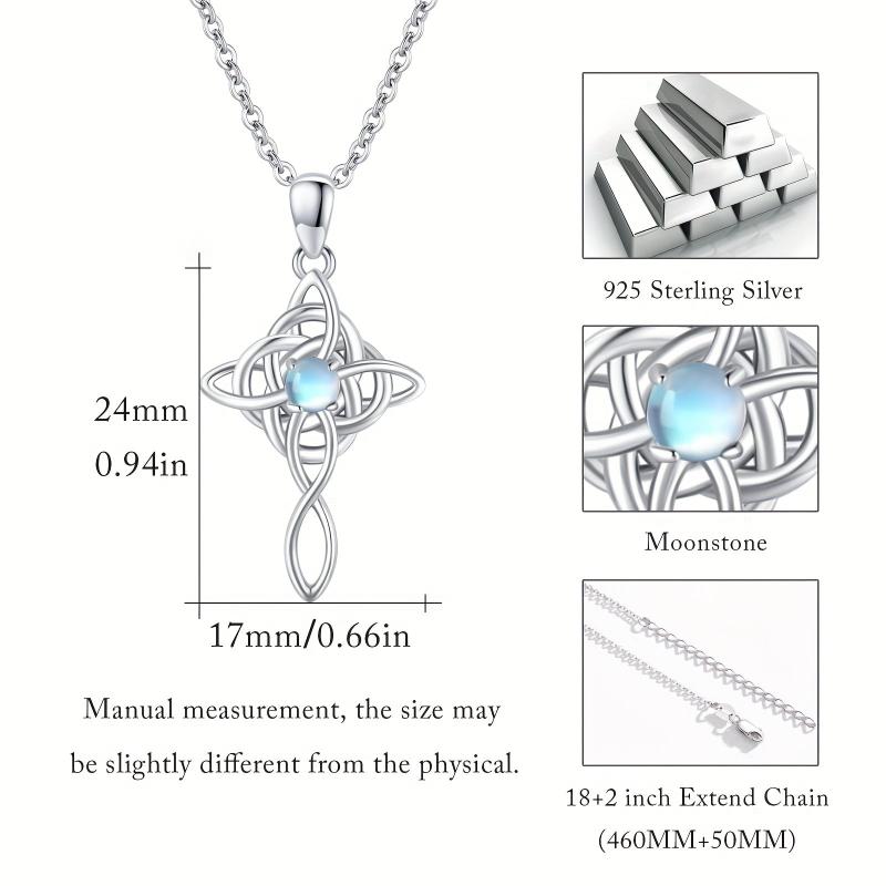 This S925 sterling silver necklace features a Celtic knot cross pendant with a moonstone, perfect for women who love Irish Celtic jewelry.