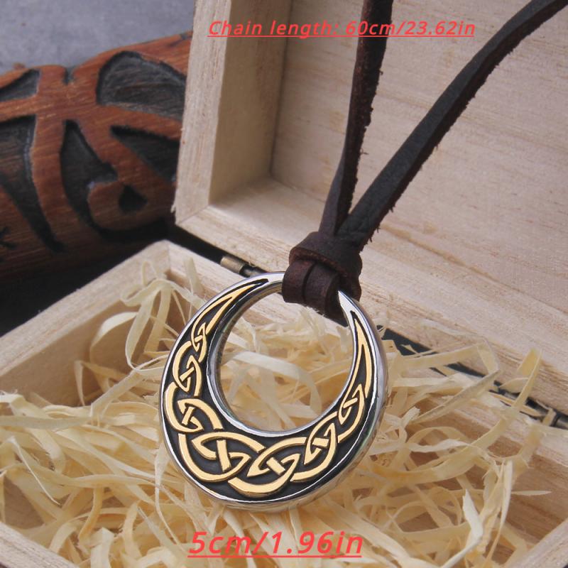 This circular pendant necklace features a Celtic knot design and comes with an adjustable leather rope. Perfect for anyone who loves Viking-inspired jewelry.