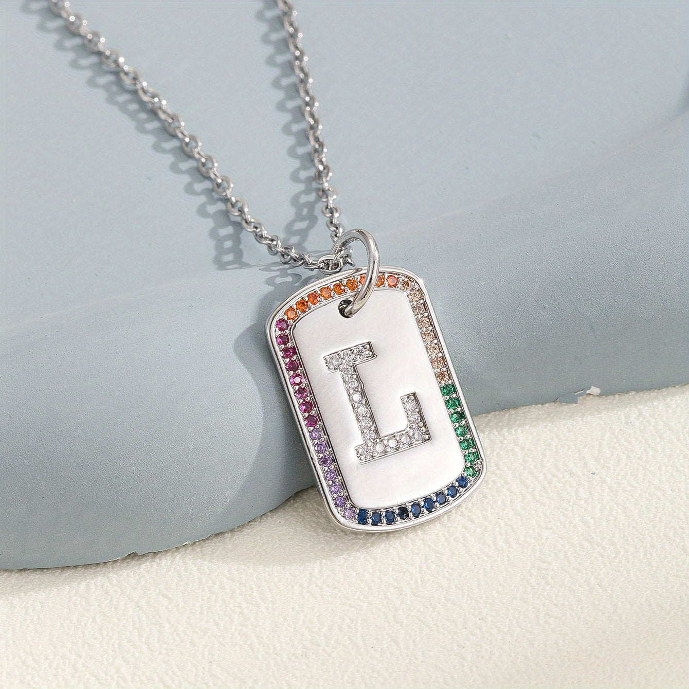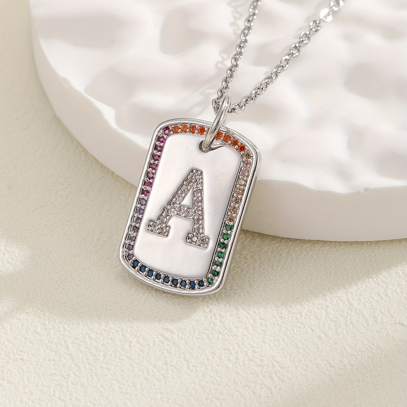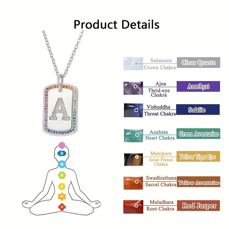This necklace features a rectangle zircon pendant with seven chakra colors for body protection. It also includes an English initial letter pendant for a personalized touch.