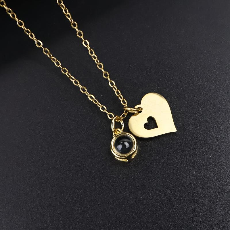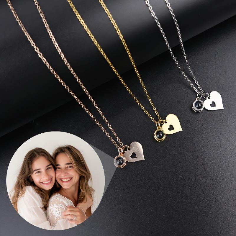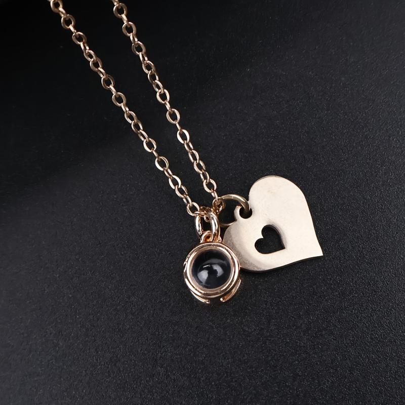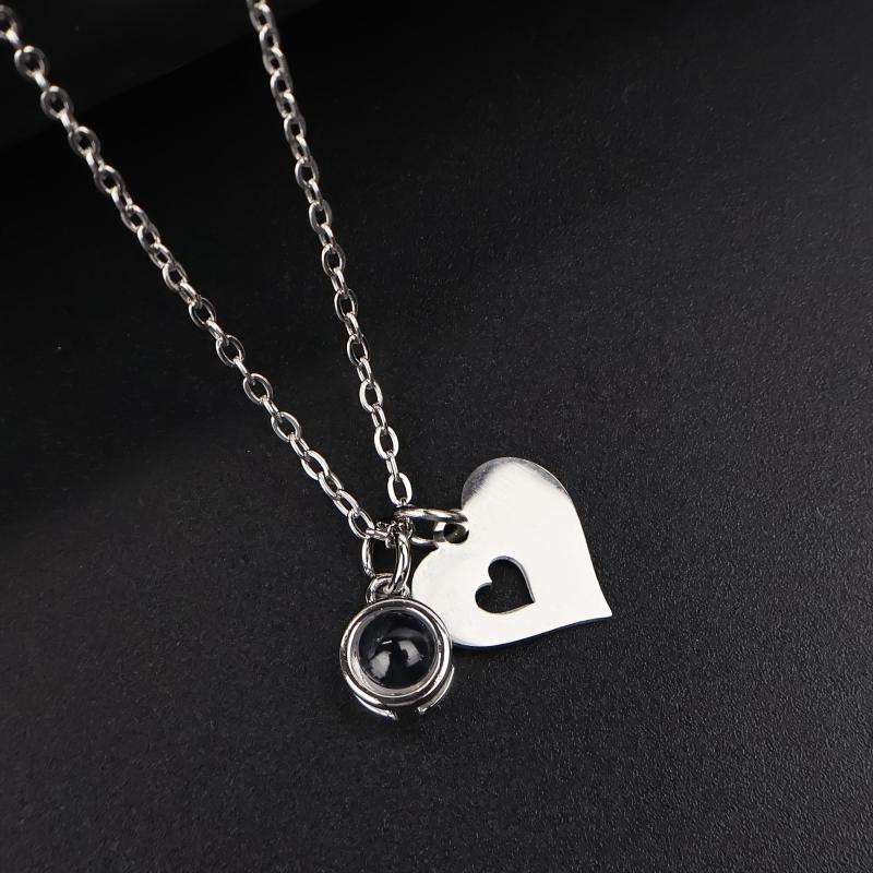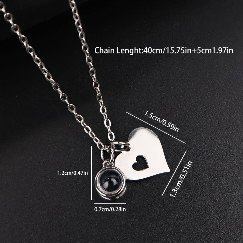 This minimalist necklace features a heart cutout pendant that projects a colorful picture. Personalize it with your favorite image.