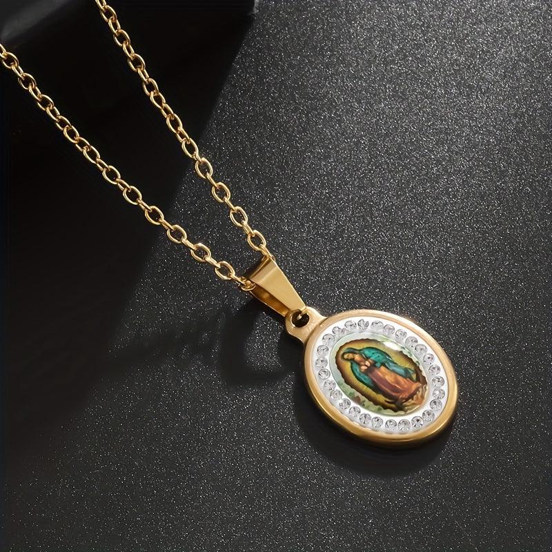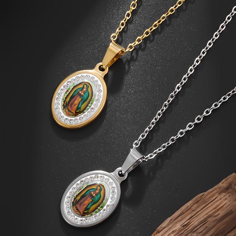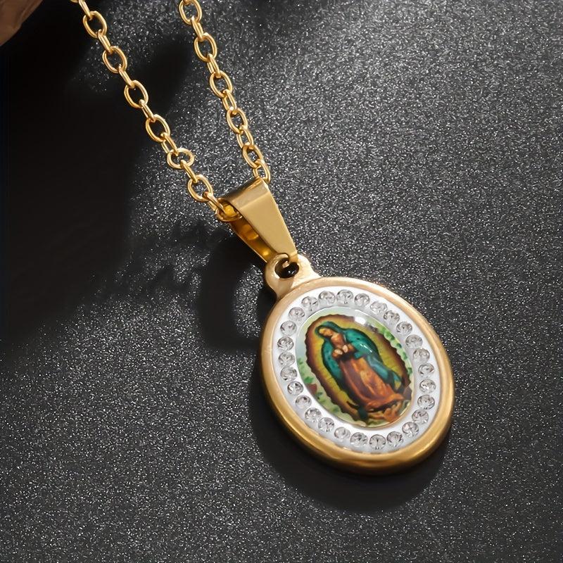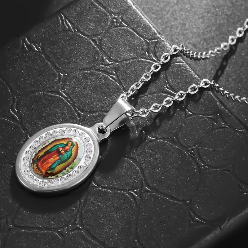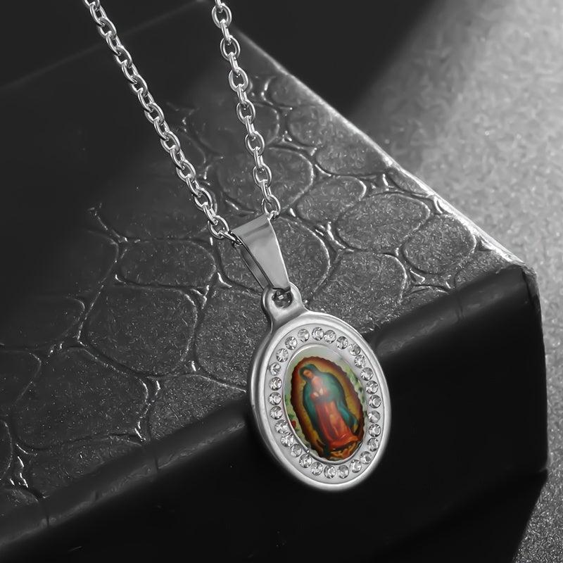 Stainless steel pendant featuring Virgin Mary design with vibrant synthetic zirconia accents.