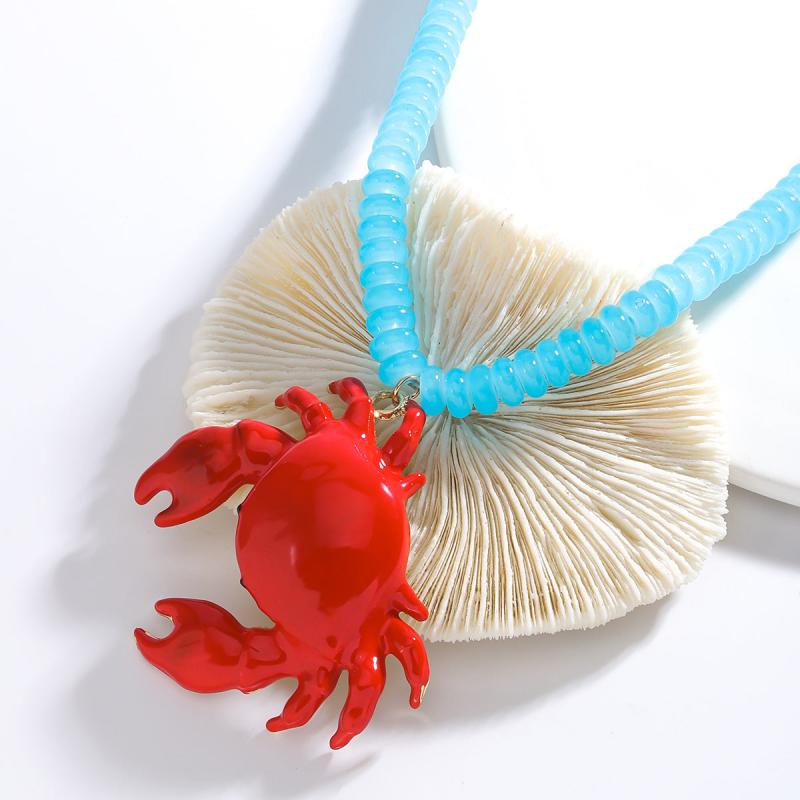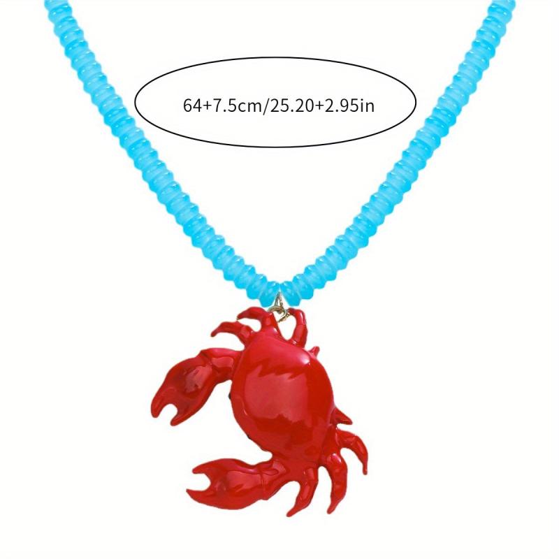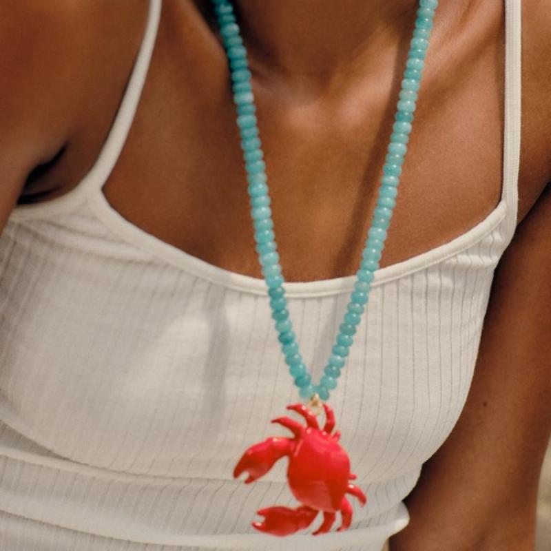 Add a touch of beachy charm to your outfit with this vibrant red crab-shaped beaded necklace. Perfect for beach vacations and summer parties.