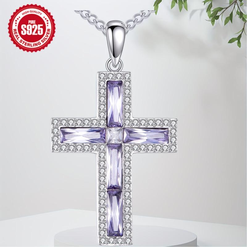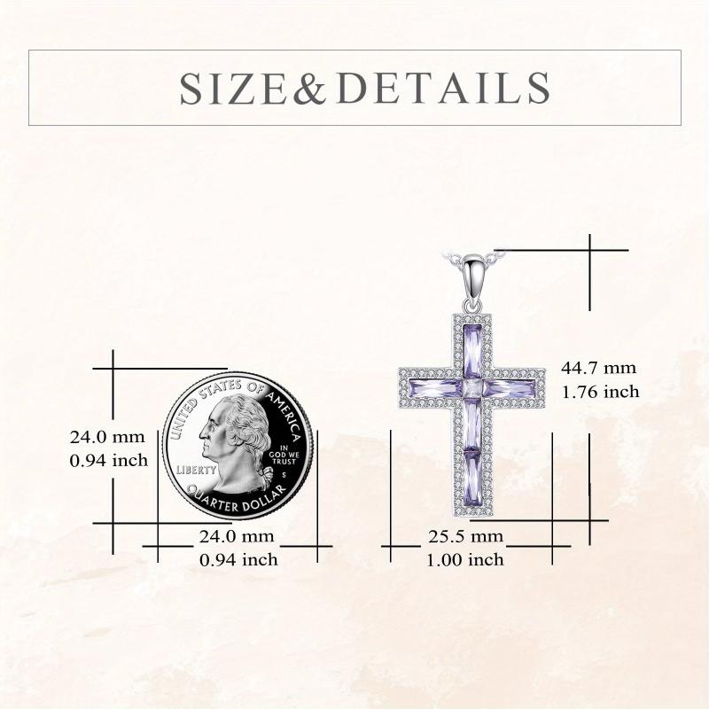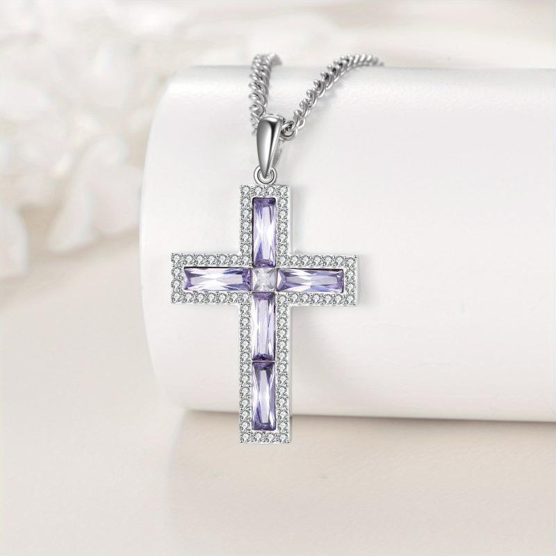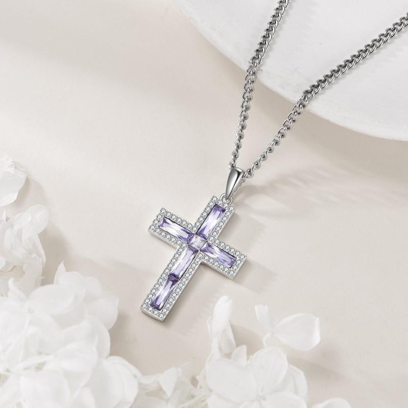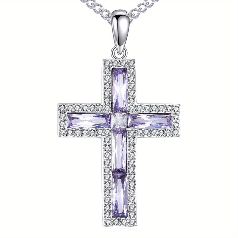 This stunning cross necklace is made of sterling silver and features a light purple cubic zirconia cross pendant. Perfect for both women and men, this religious jewellery piece is a beautiful and meaningful accessory.