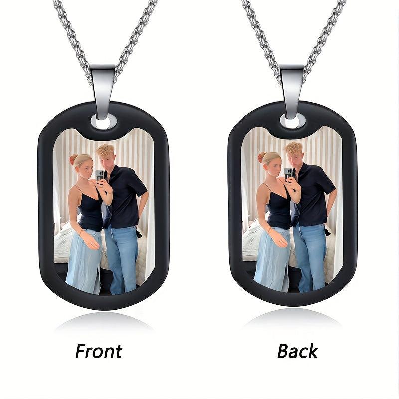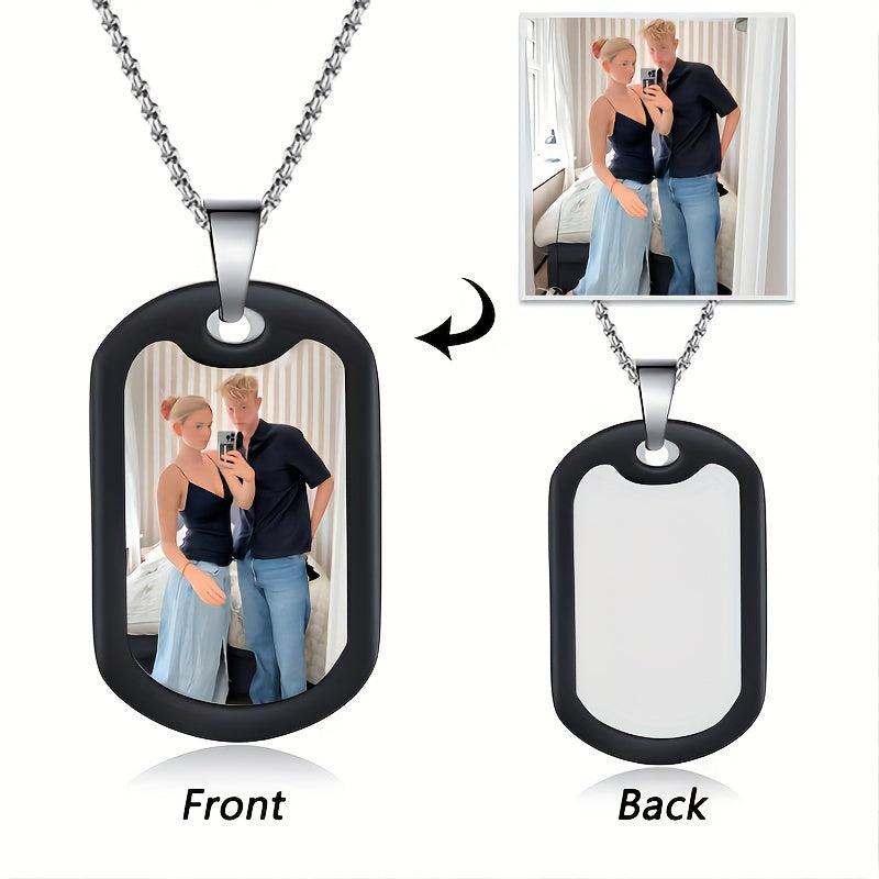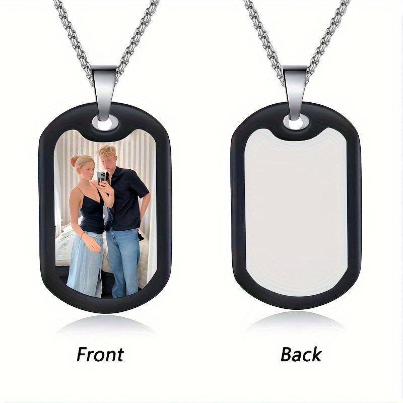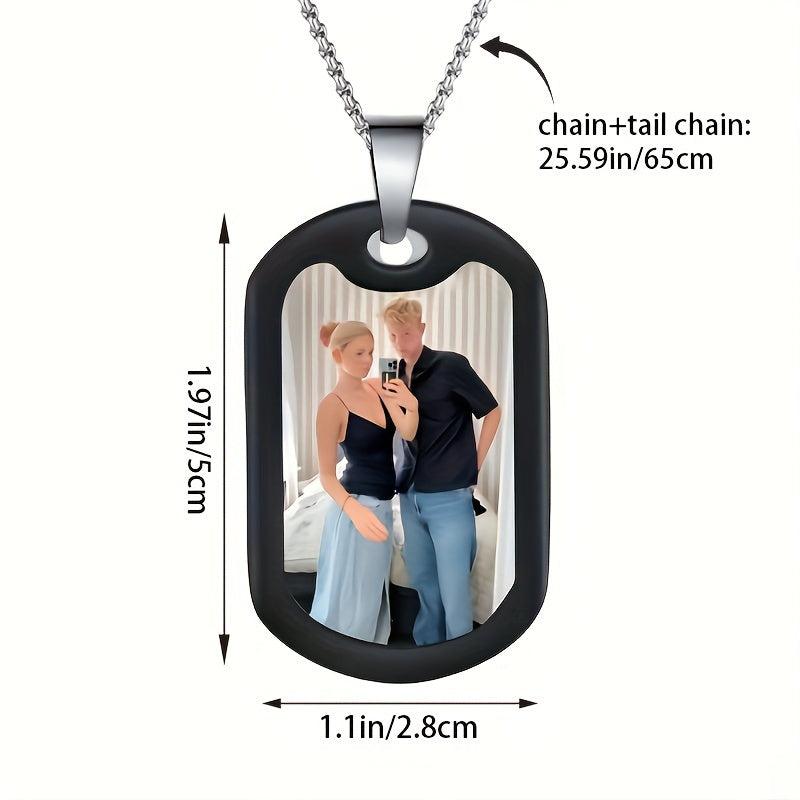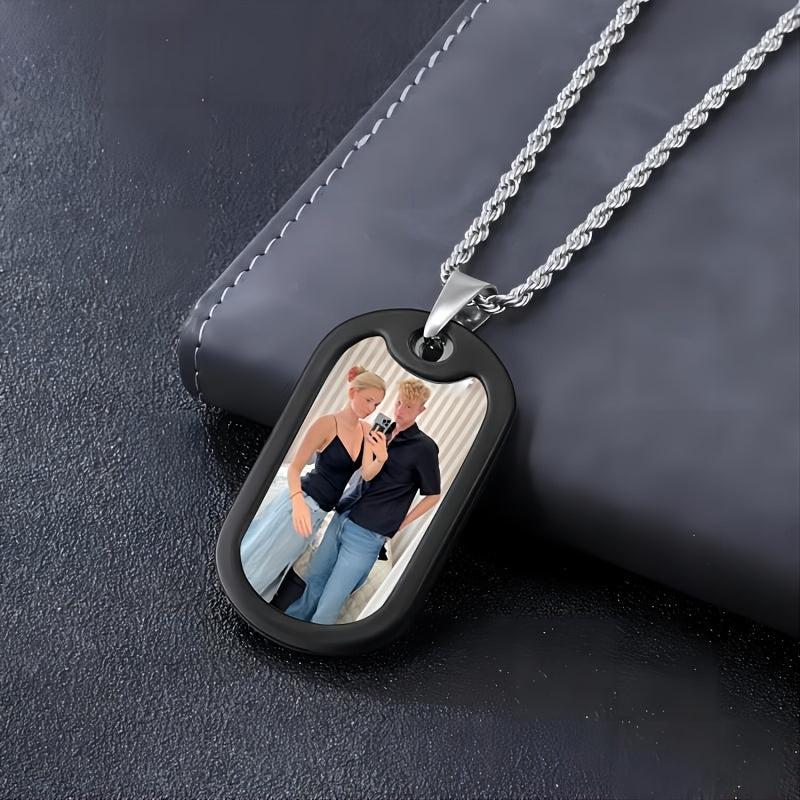 This custom photo necklace is a perfect gift for men or women. The stainless steel silvery dog tag pendant can be personalized with your own picture. Ideal for expressing love and appreciation.