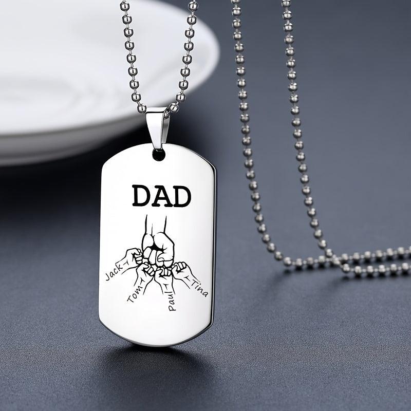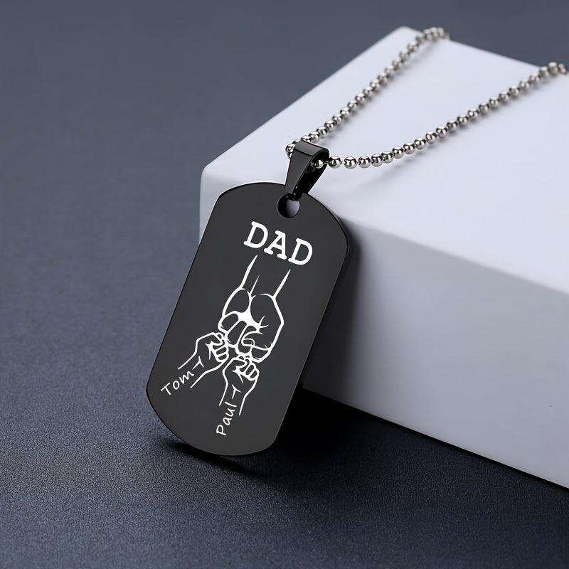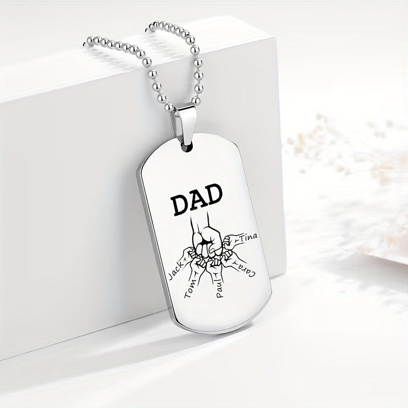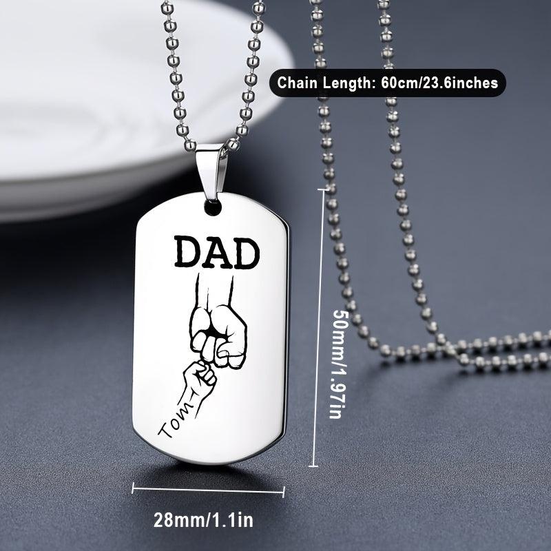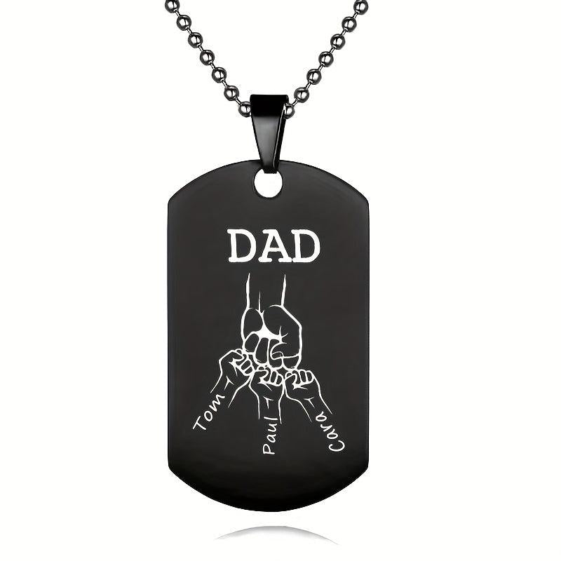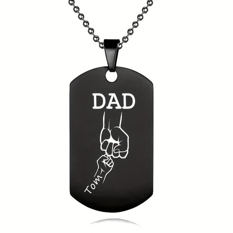 Surprise Dad with this personalized stainless steel necklace featuring a custom laser engraved tag with your family name. Perfect for Father's Day or Thanksgiving.