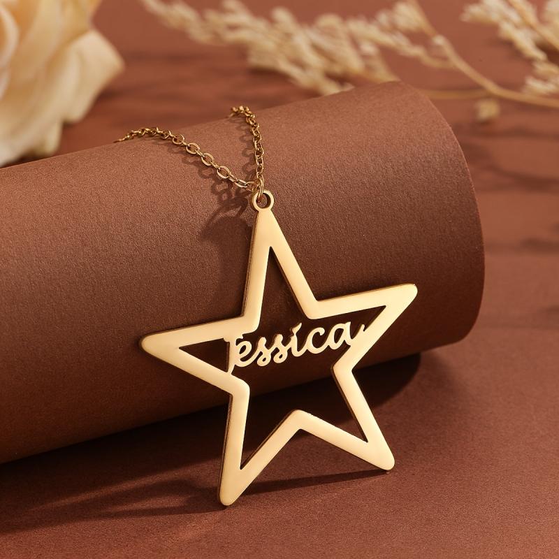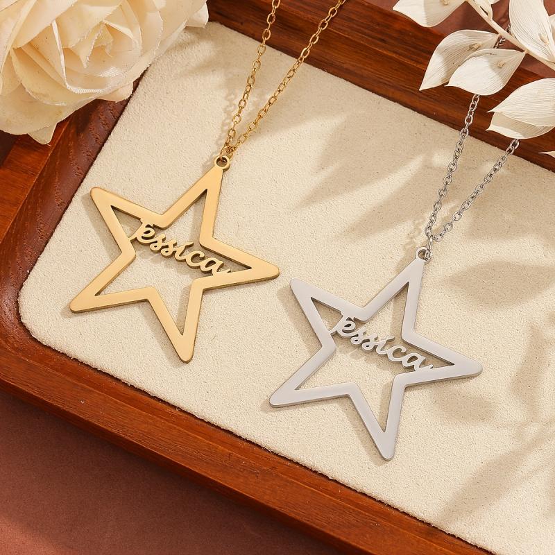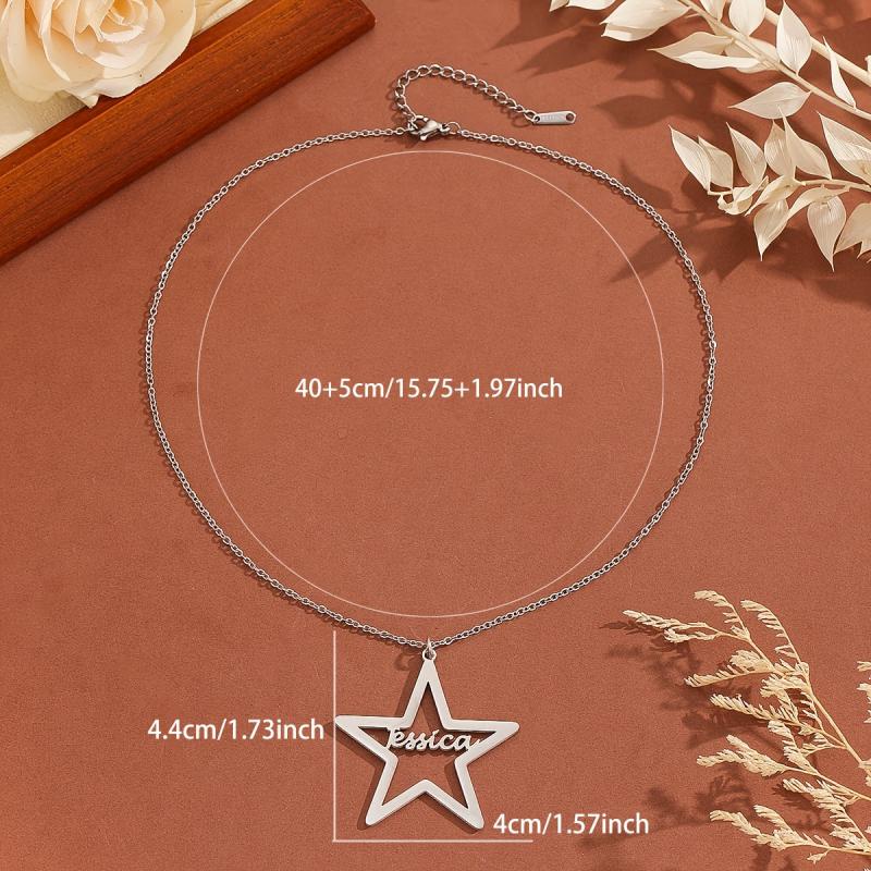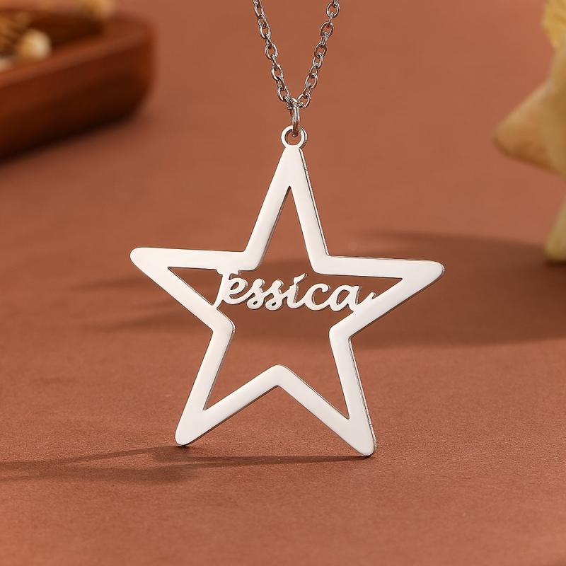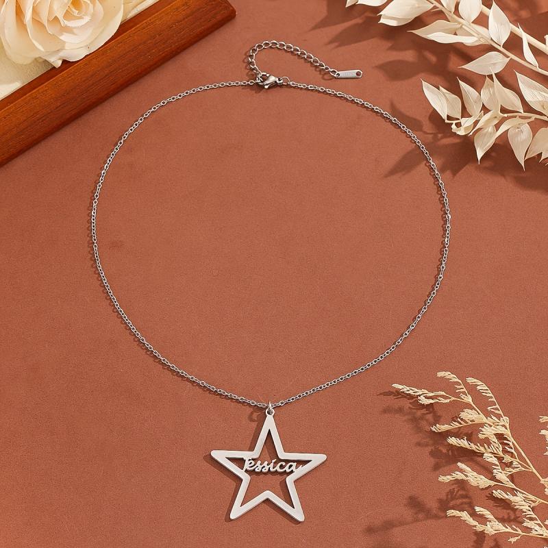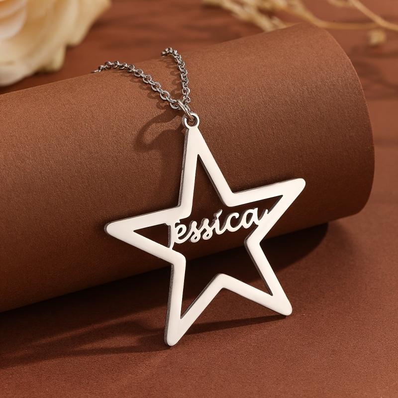 This stainless steel pendant necklace features a customizable name content in a unique pentagram art font. Perfect personalized jewelry gift for men and women.
