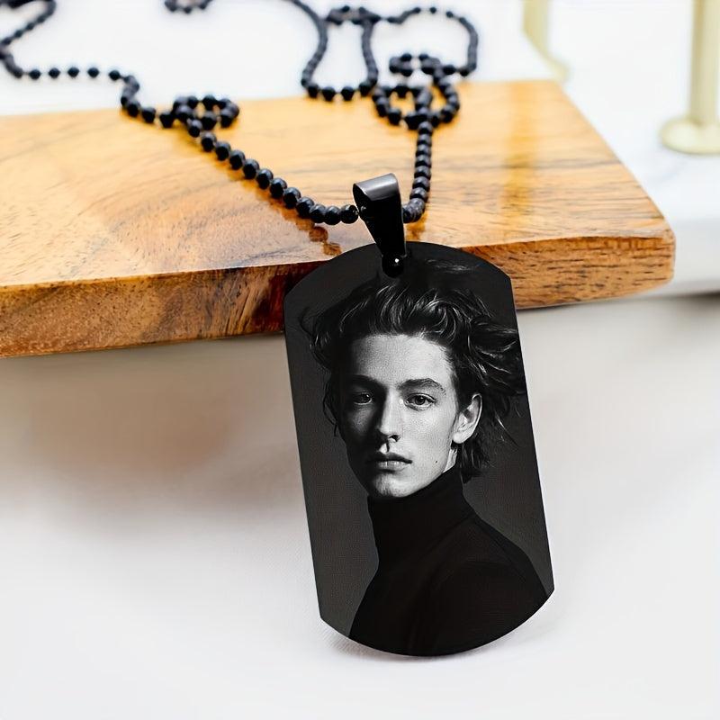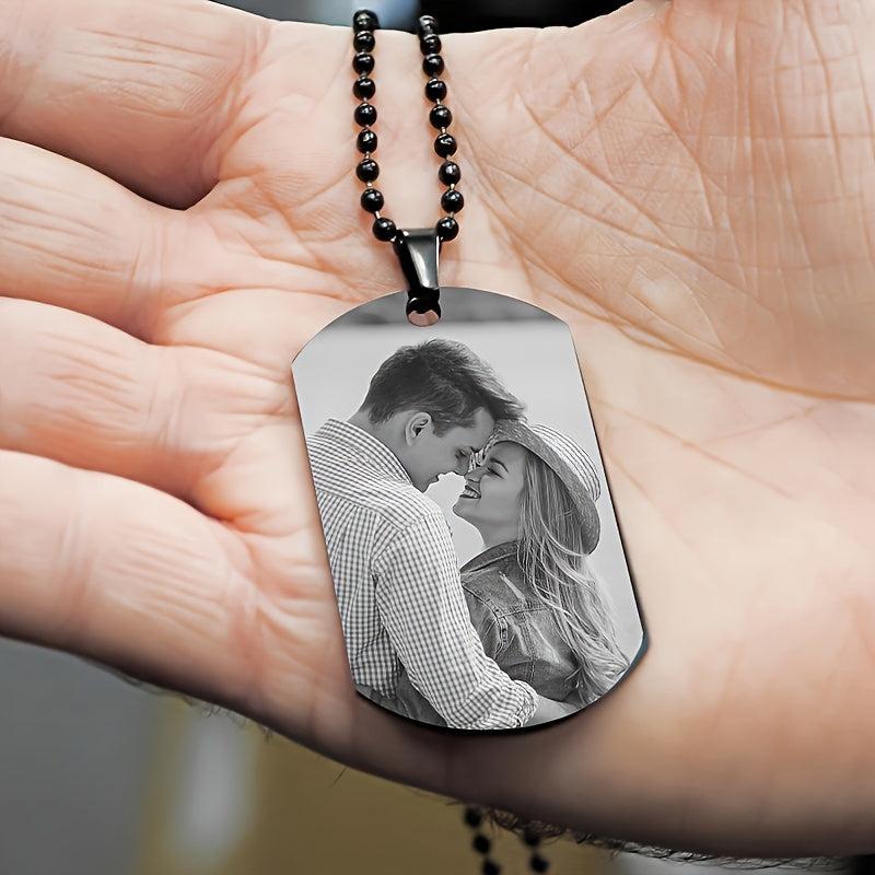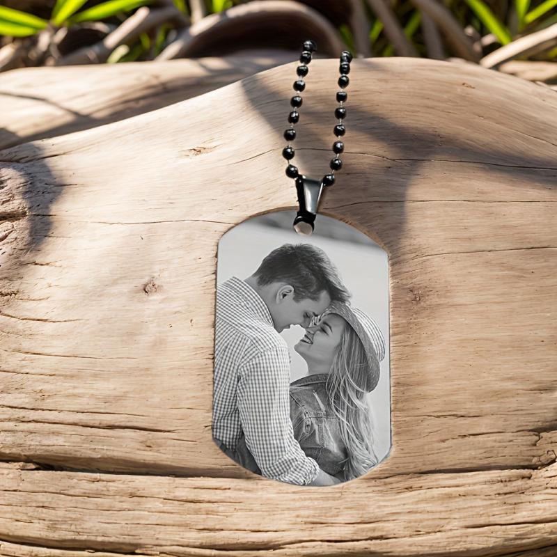 This military-themed pendant necklace features a personalized couple photo on a 14K plated stainless steel dog tag. A unique and meaningful gift for loved ones.
