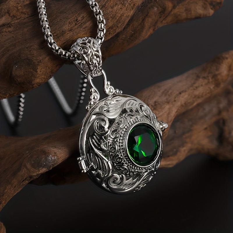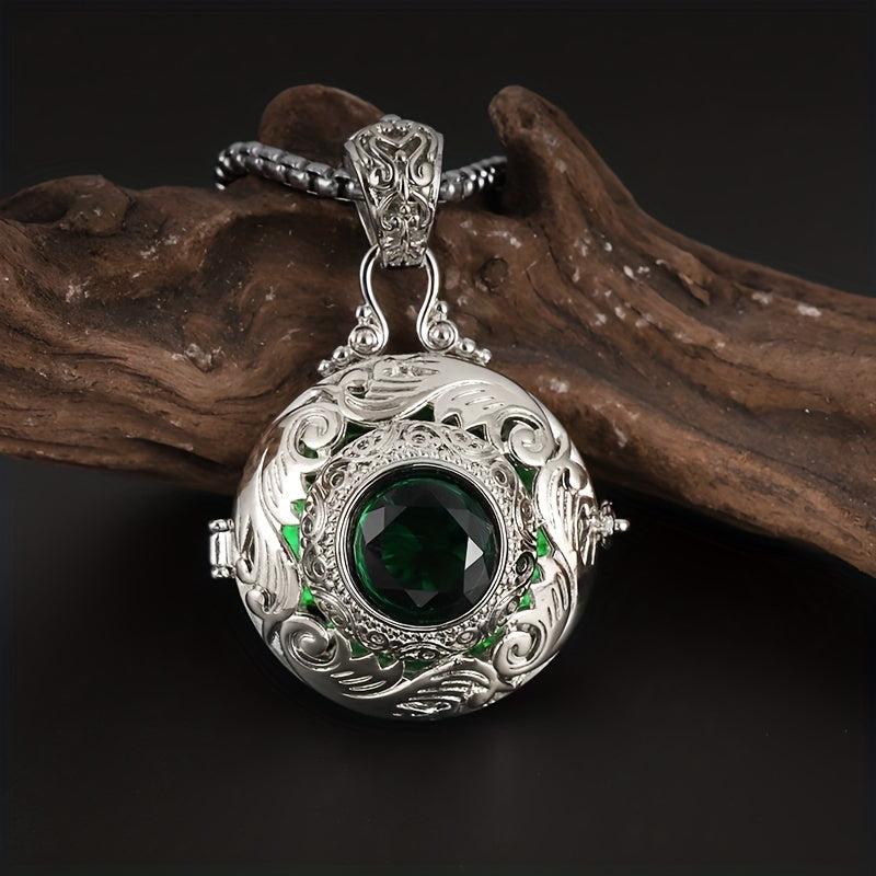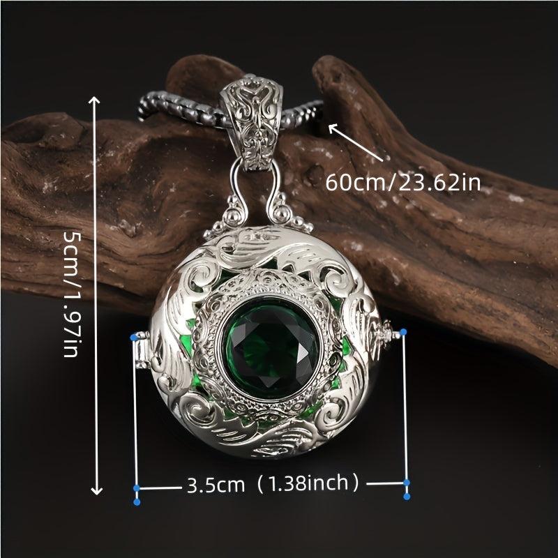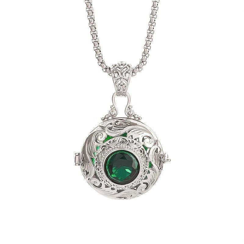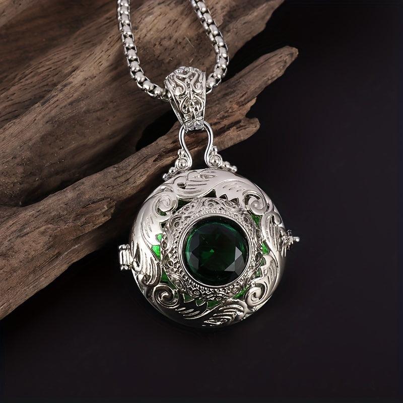 Elegant necklace featuring a dark green silvery round box pendant made of copper.